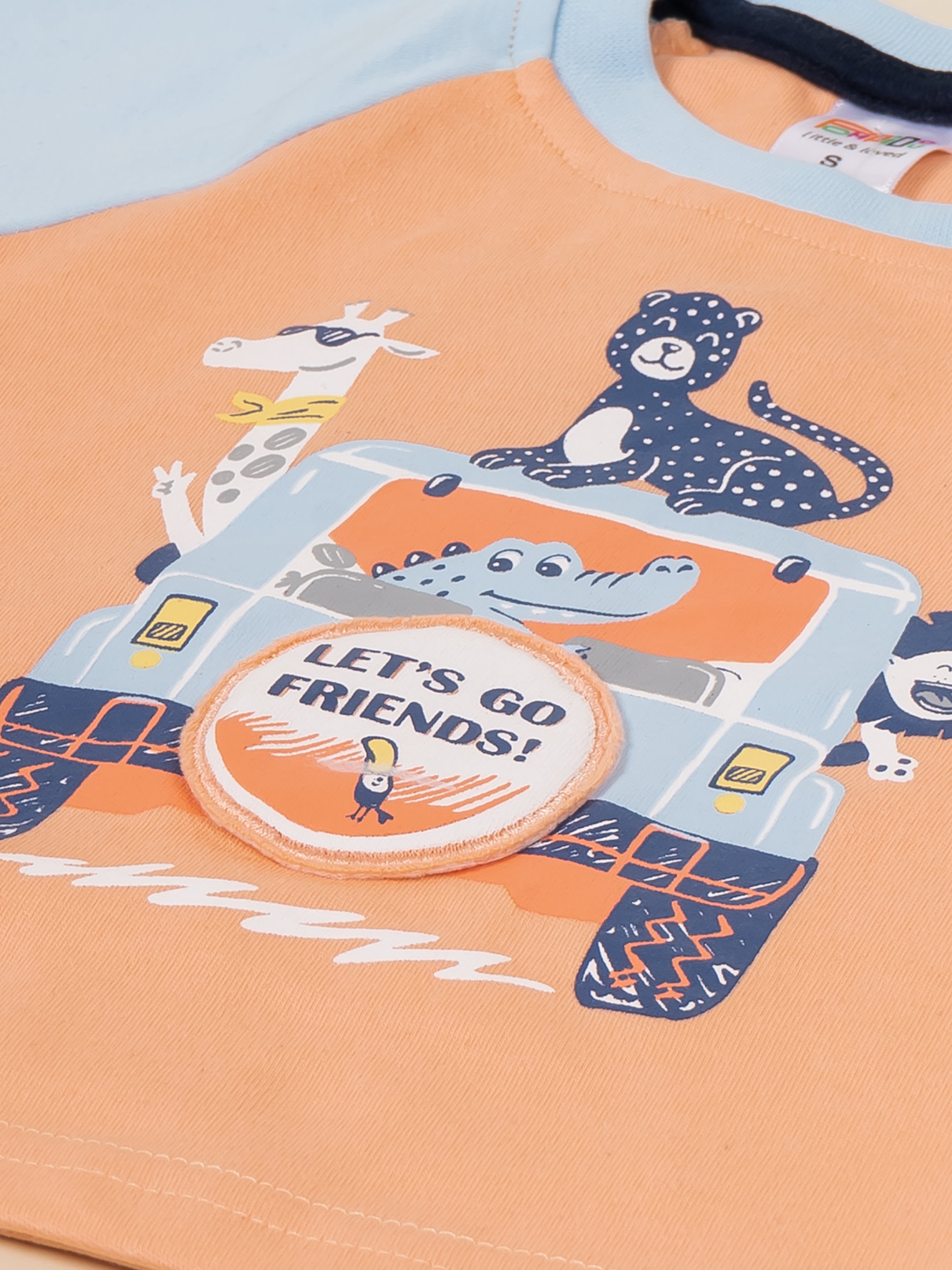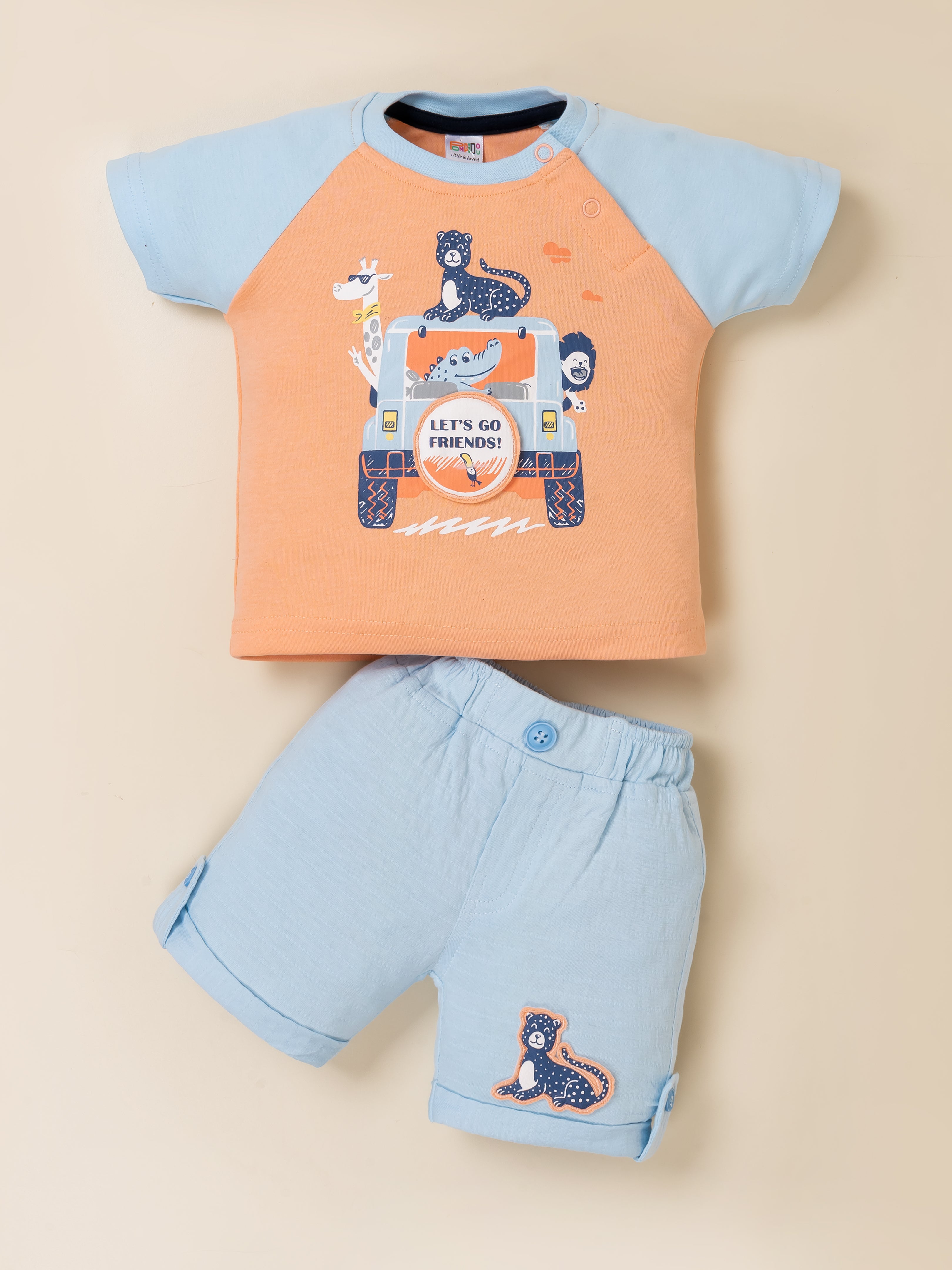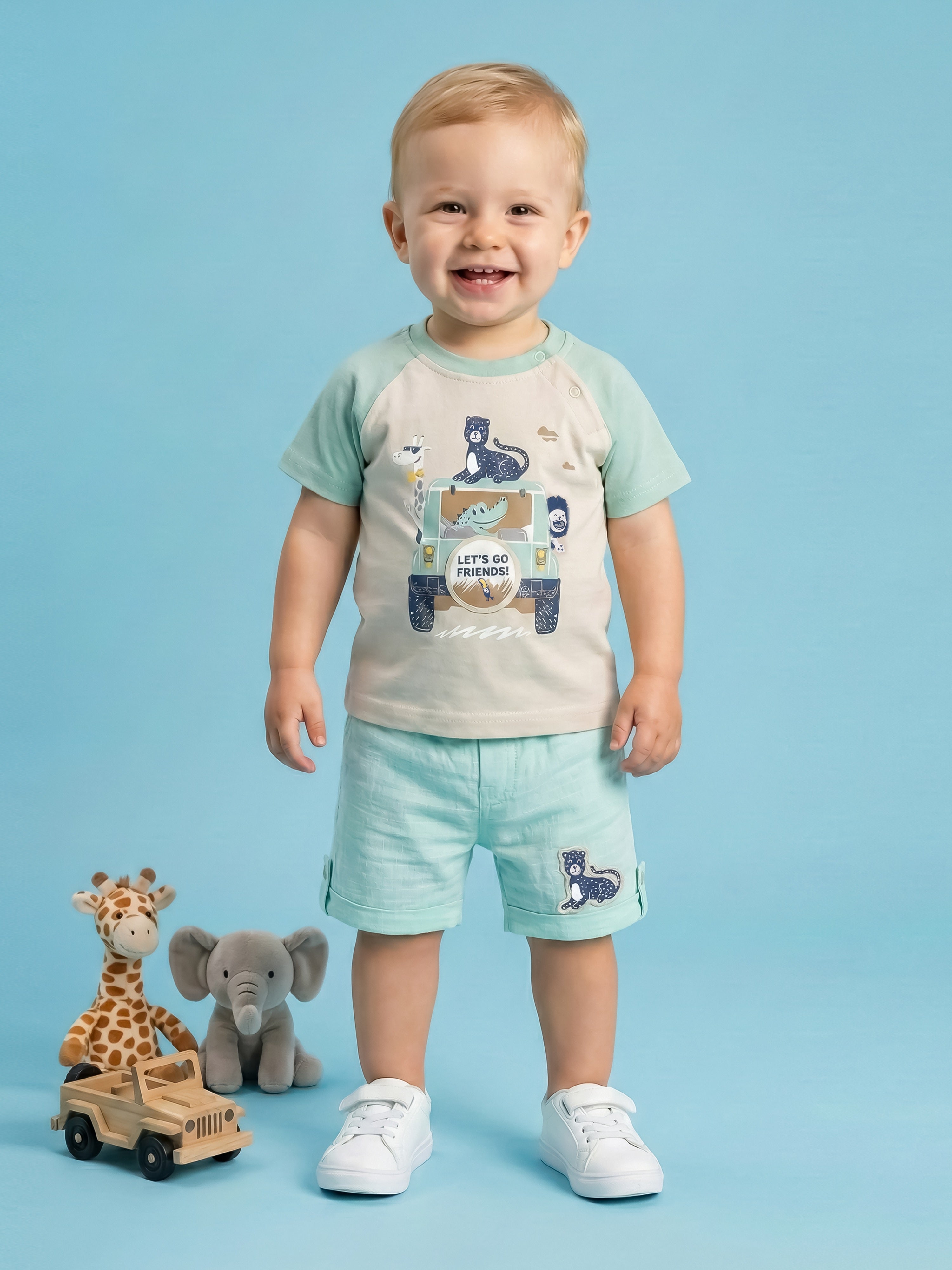 Bring a touch of nature-inspired charm to your little explorer's wardrobe with this comfortable 2-piece coordinated set.Paired with matching soft peach shorts, this set is crafted for durability and ease of movement, making it the perfect choice for active playdates, daycare, or casual weekend outings.