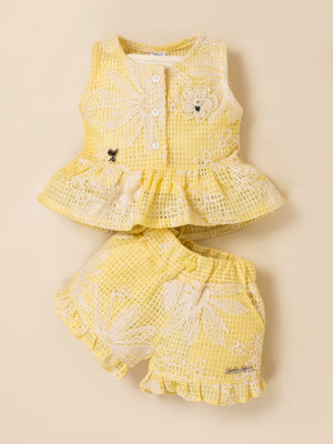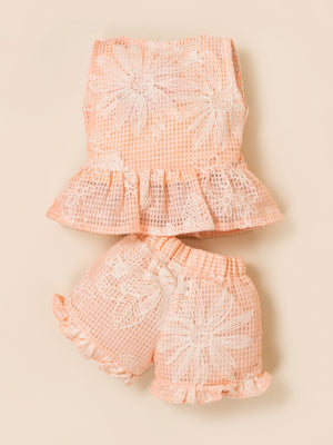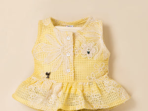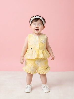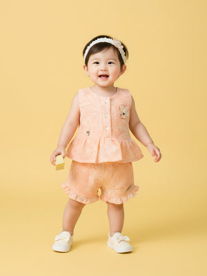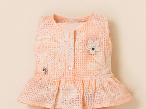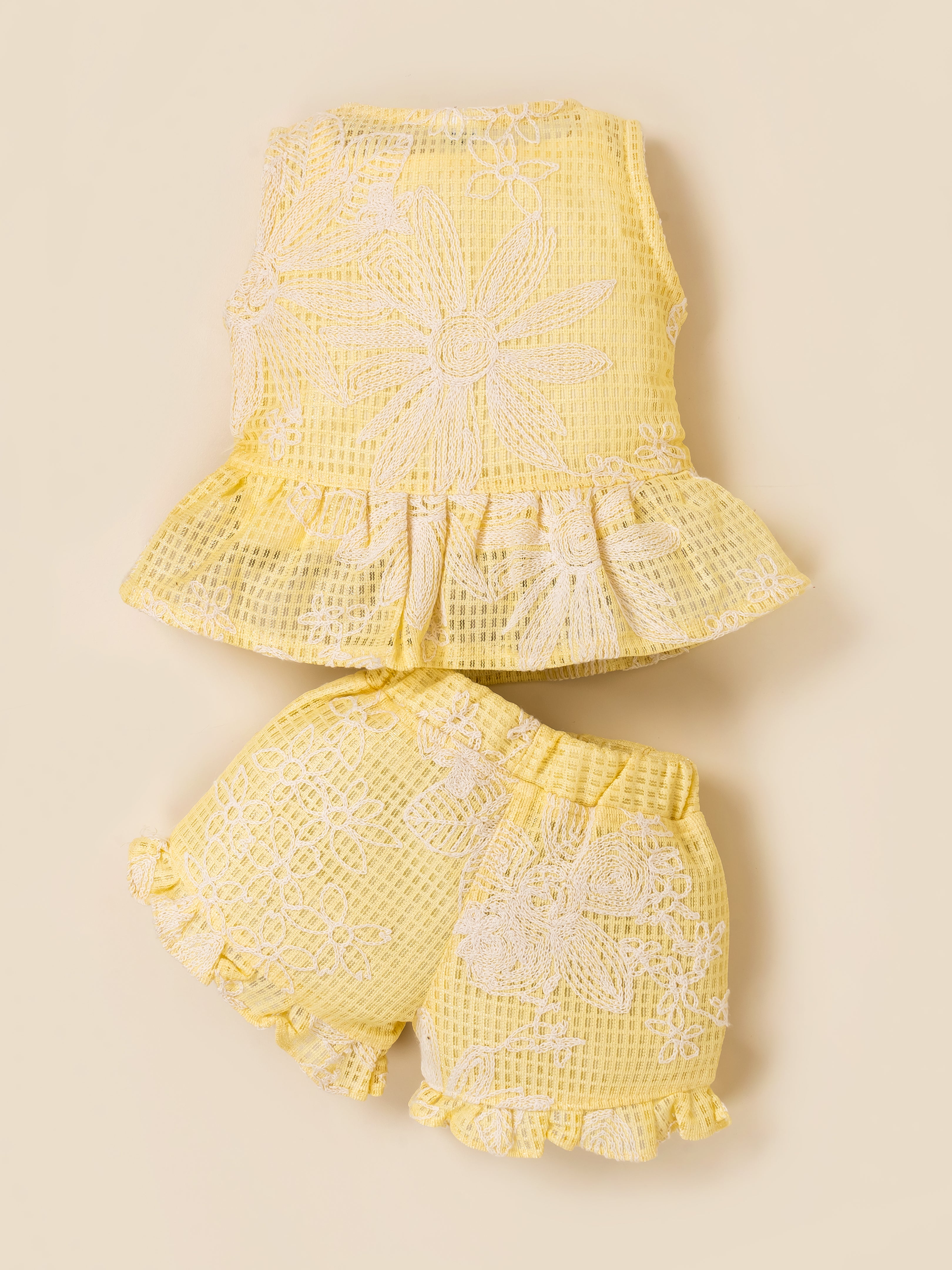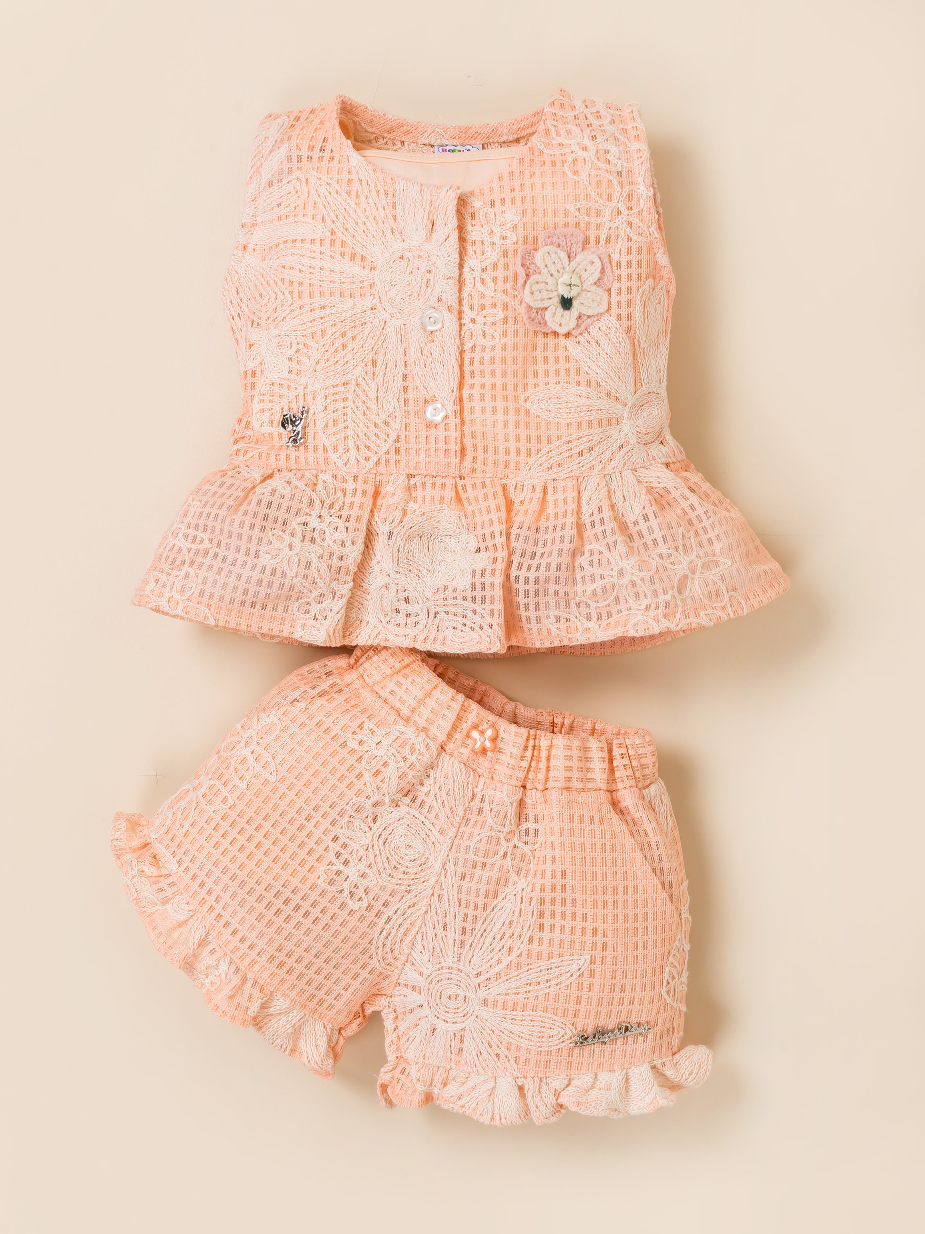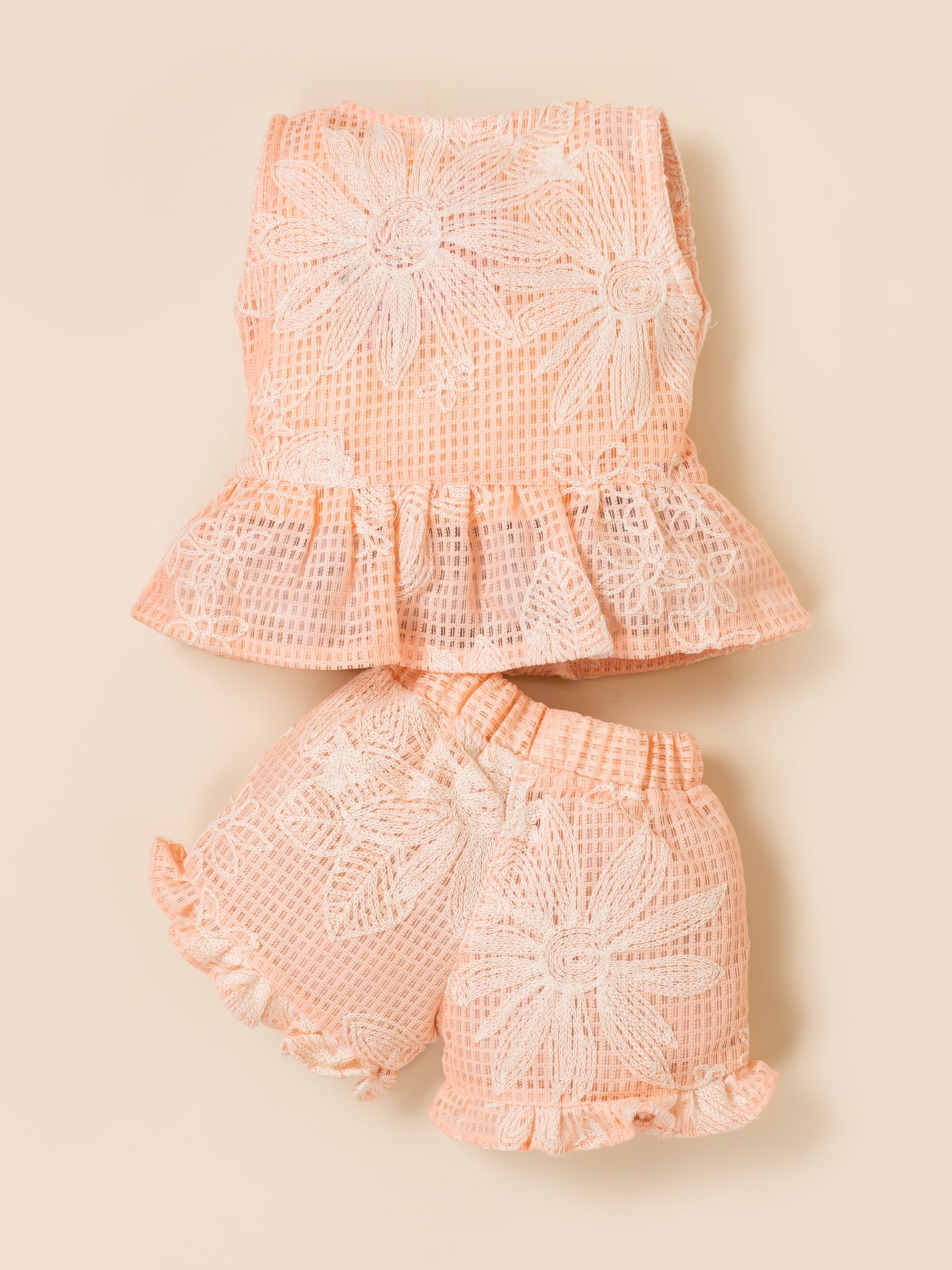 Keep your little one cool and stylish with this adorable two-piece set from Baby’s Day. Featuring a breathable mesh texture with intricate floral embroidery, this outfit combines playful ruffles with a sophisticated peplum silhouette. It is the perfect choice for summer parties, family outings, or any sunny day adventure where comfort meets charm