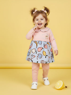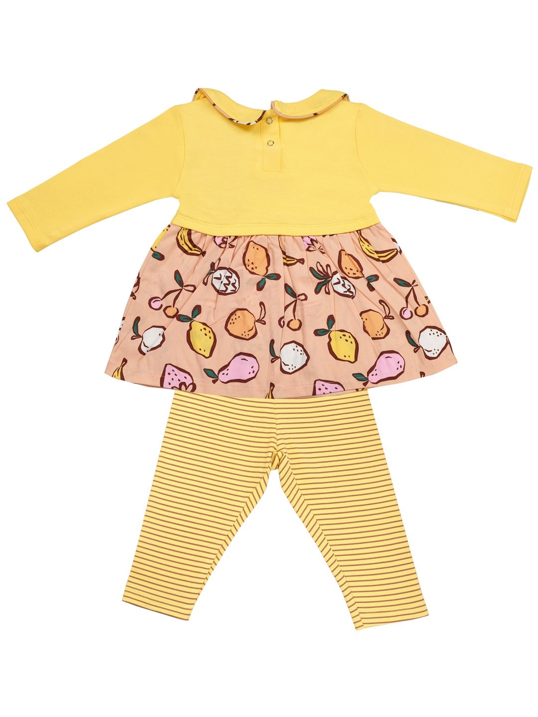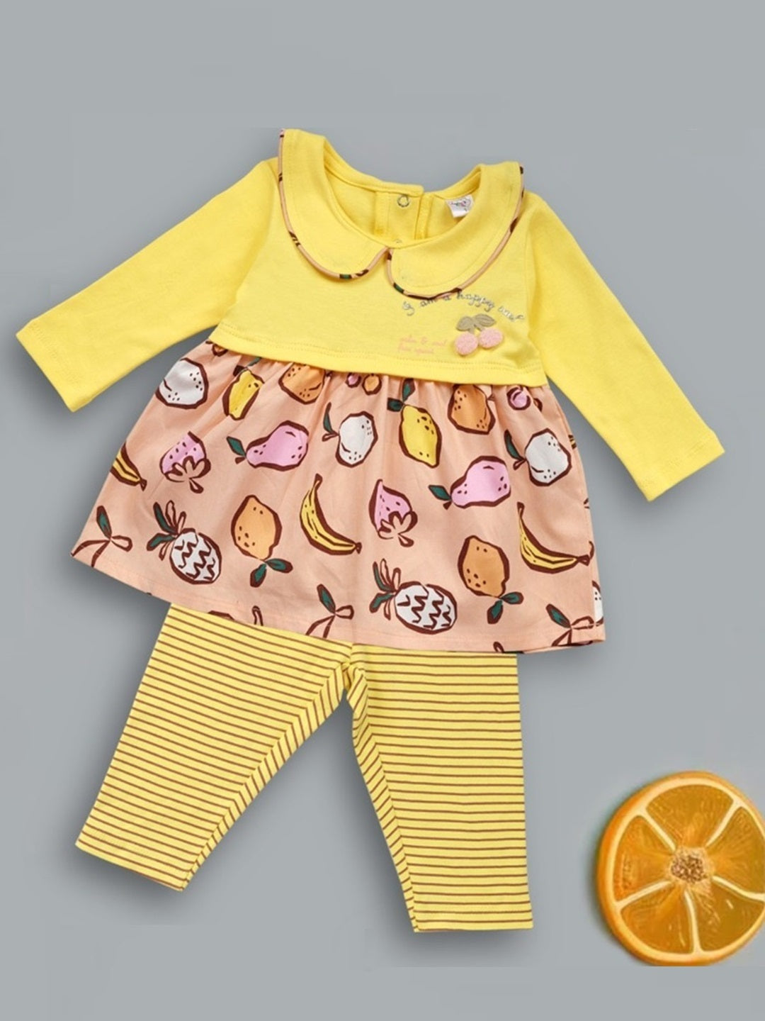 This clothing set consists of Top and Trousers Yellow and Peach Food printed Top ,has a round neck, long sleeves Yellow Striped Trousers ,has a slip-on closure