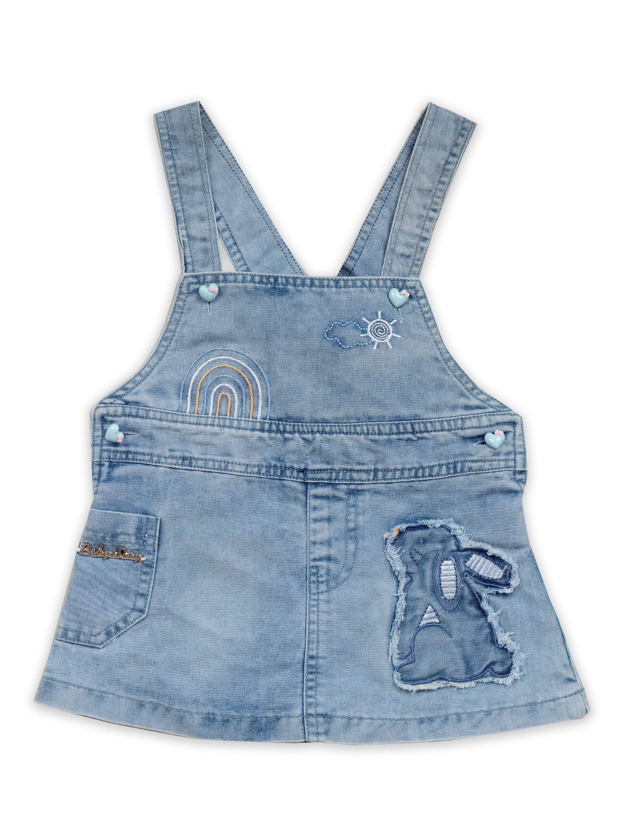 Peach colored printed dungarees, has adjustable shoulder straps secured with button closure, a waistband with belt loops and side button closures and three pockets