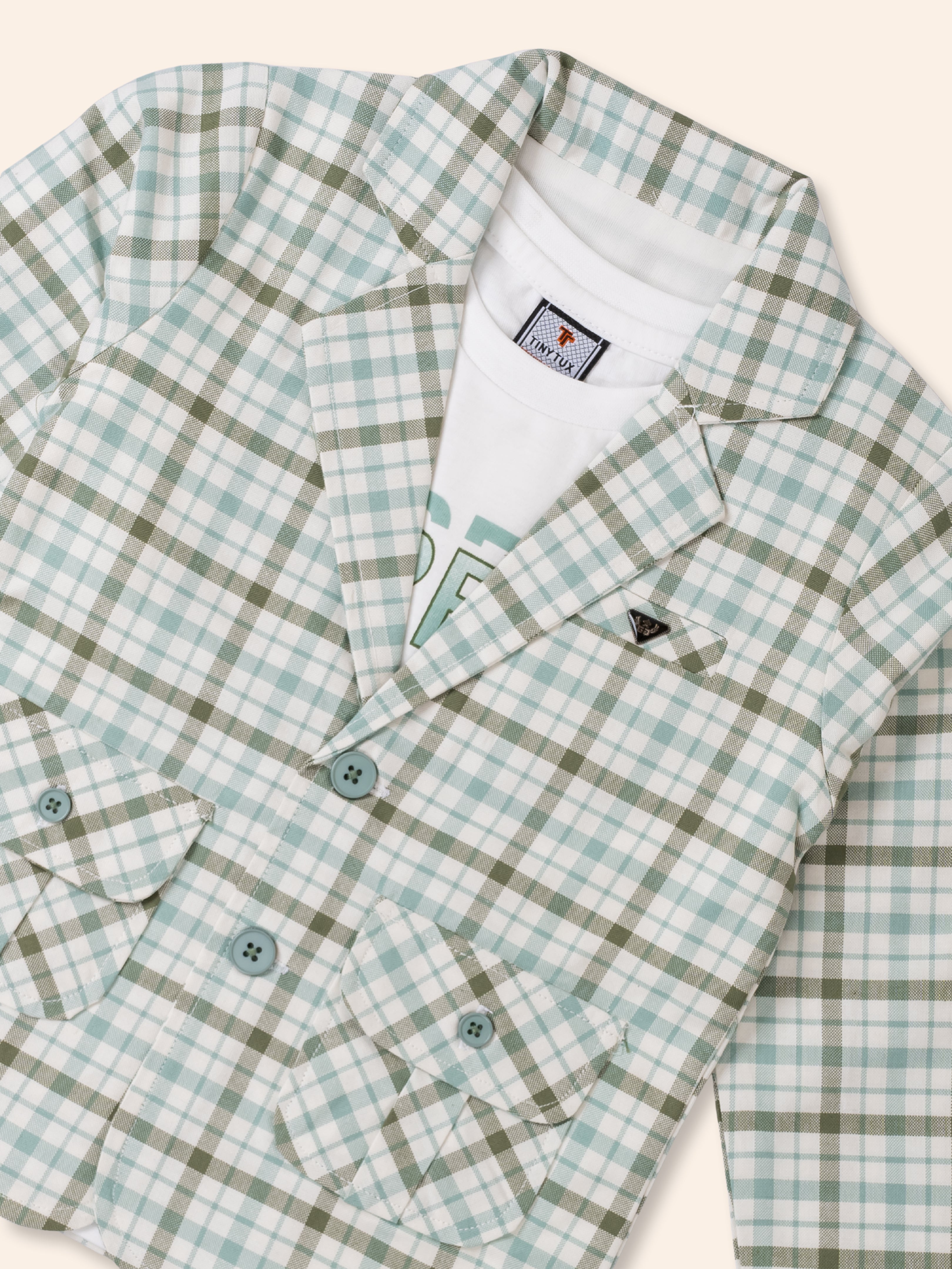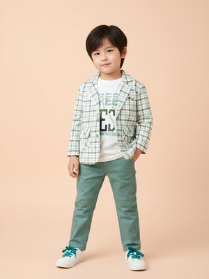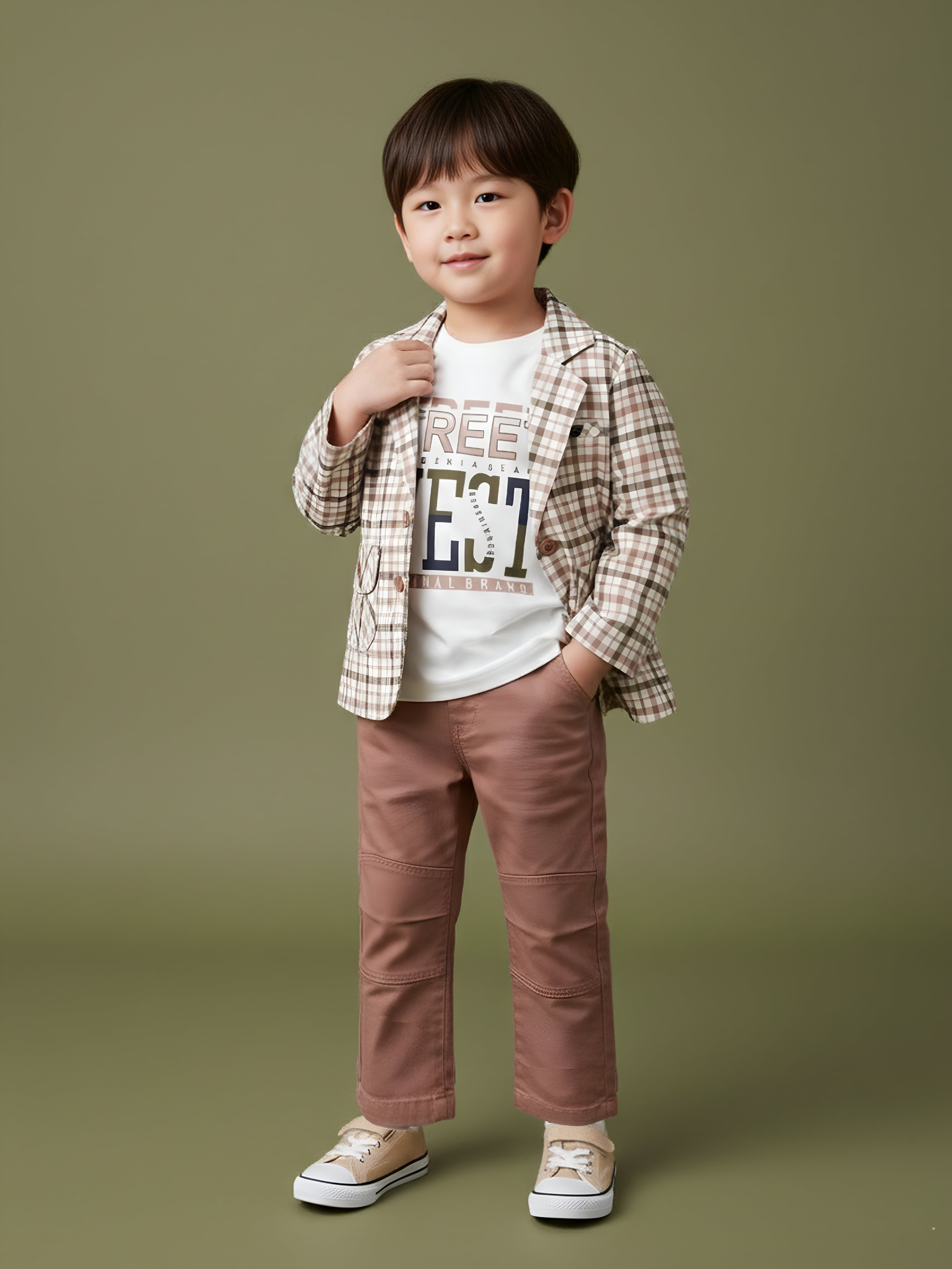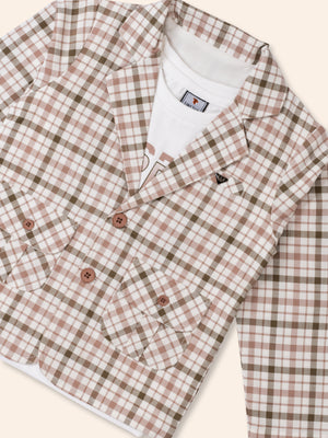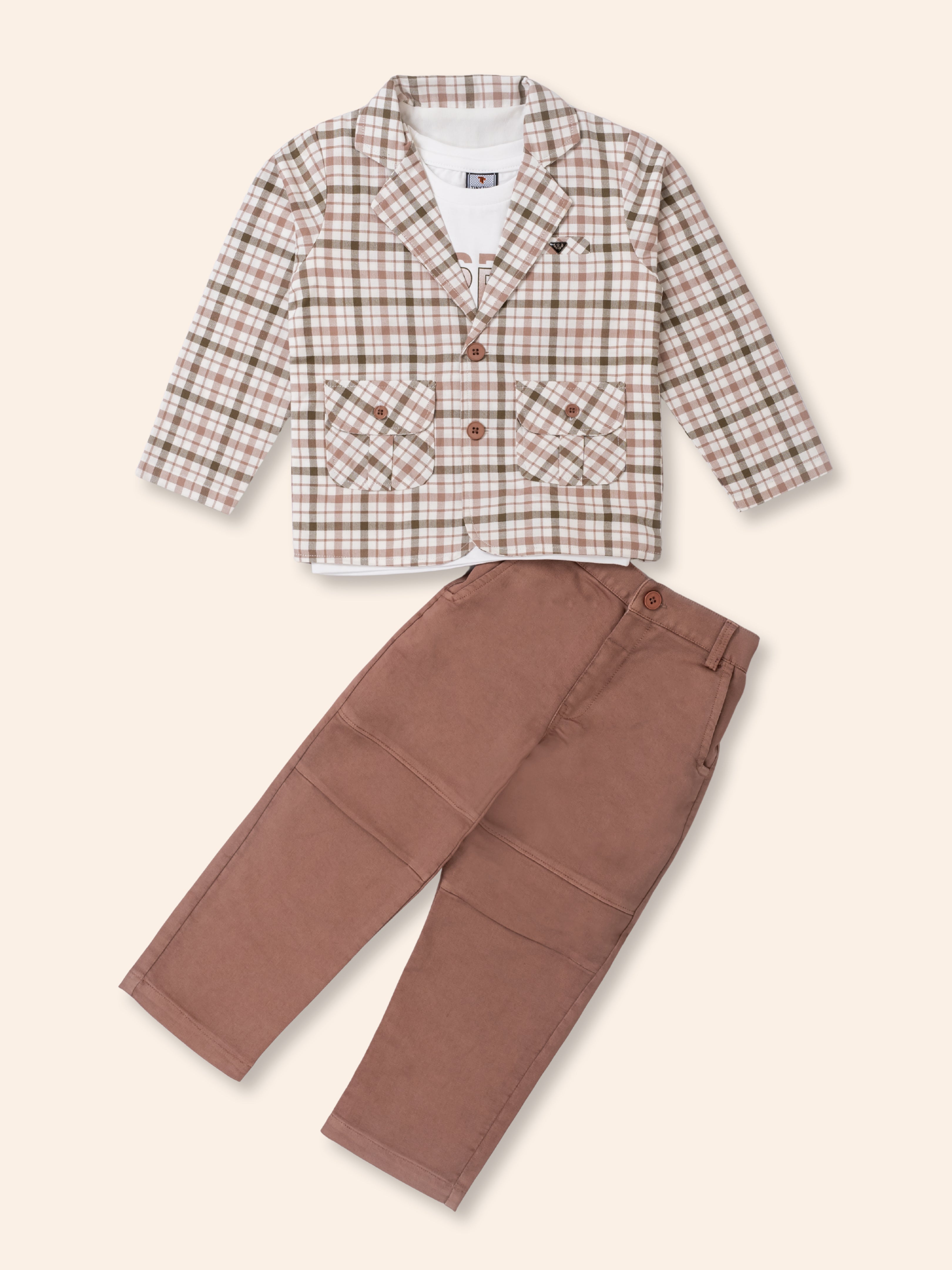 This sophisticated three-piece set features a brown plaid blazer with front pockets, paired with a graphic t-shirt