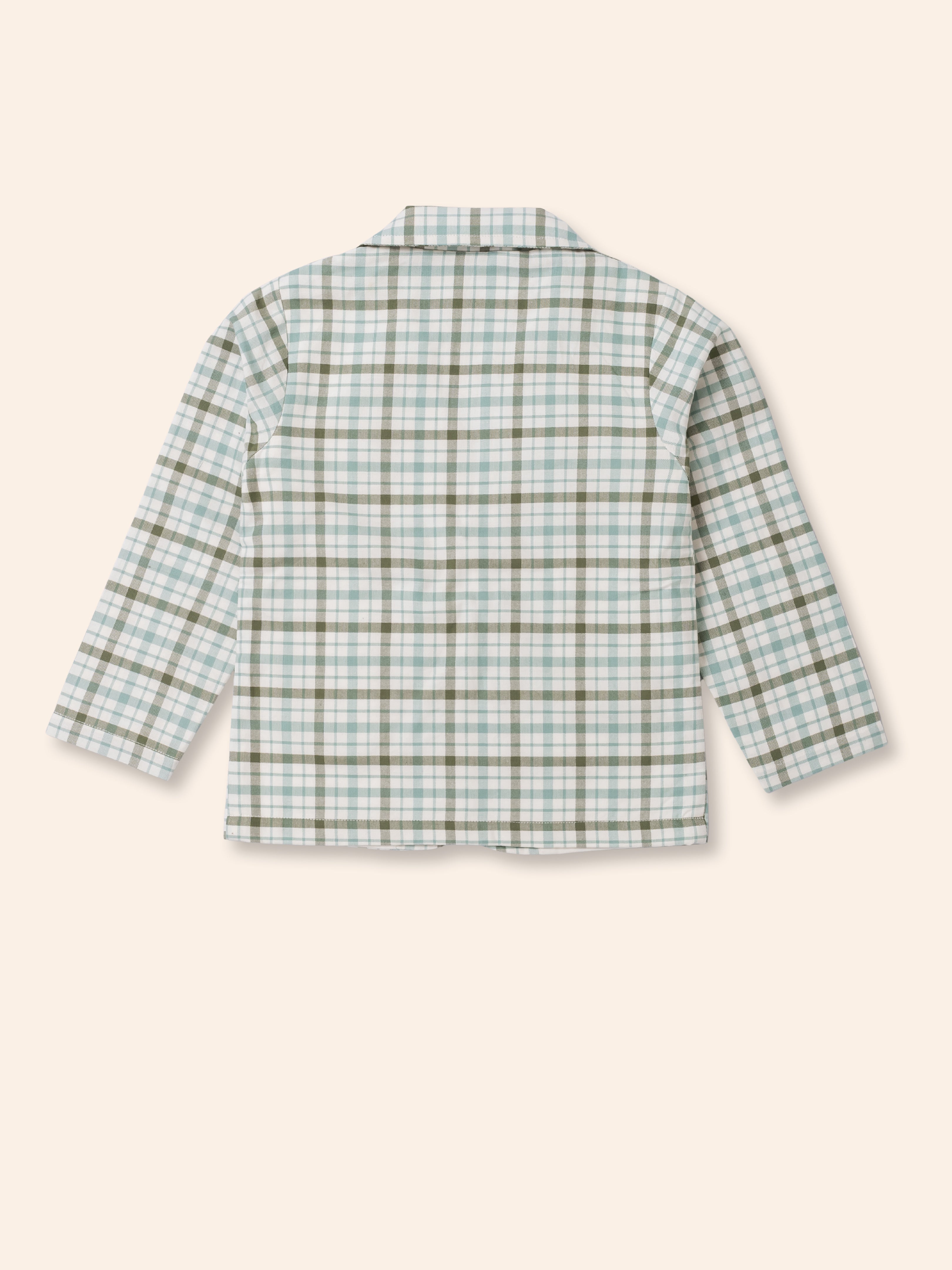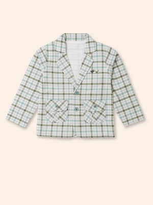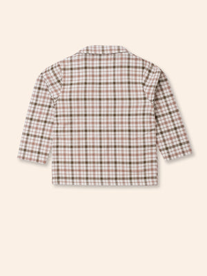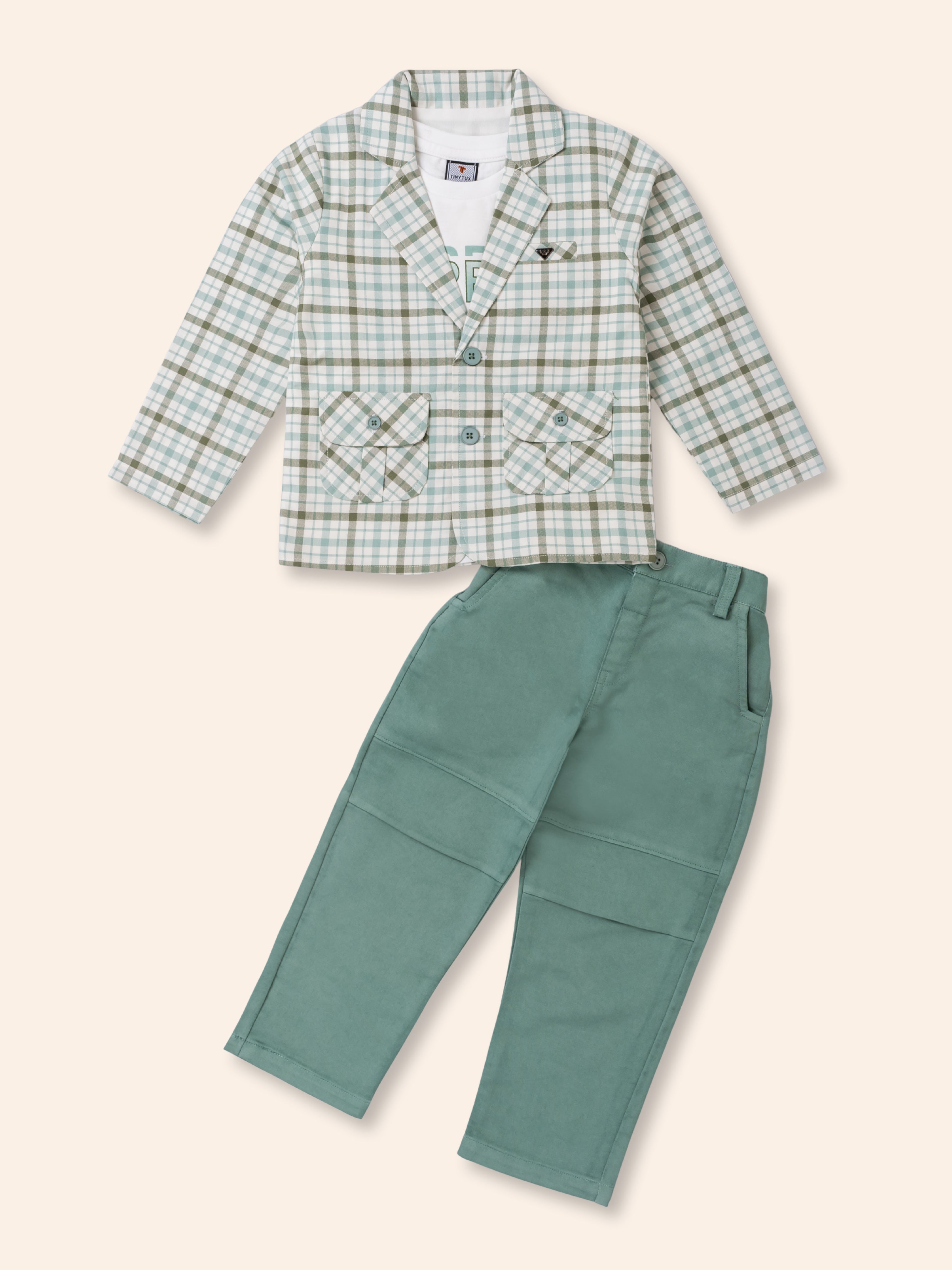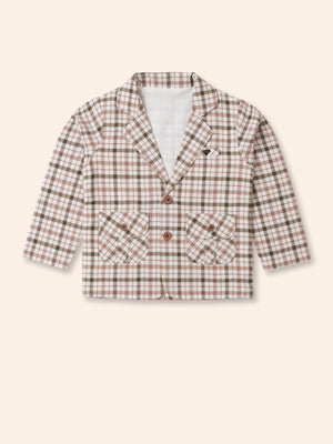 This sophisticated three-piece set features a brown plaid blazer with front pockets, paired with a graphic t-shirt