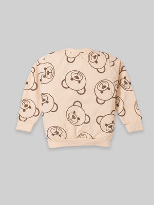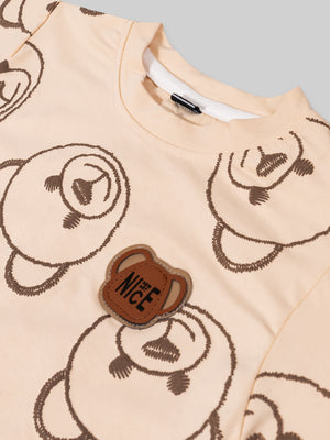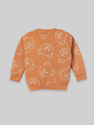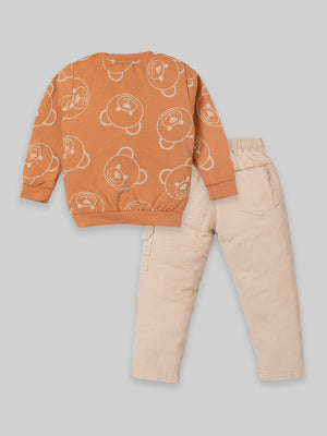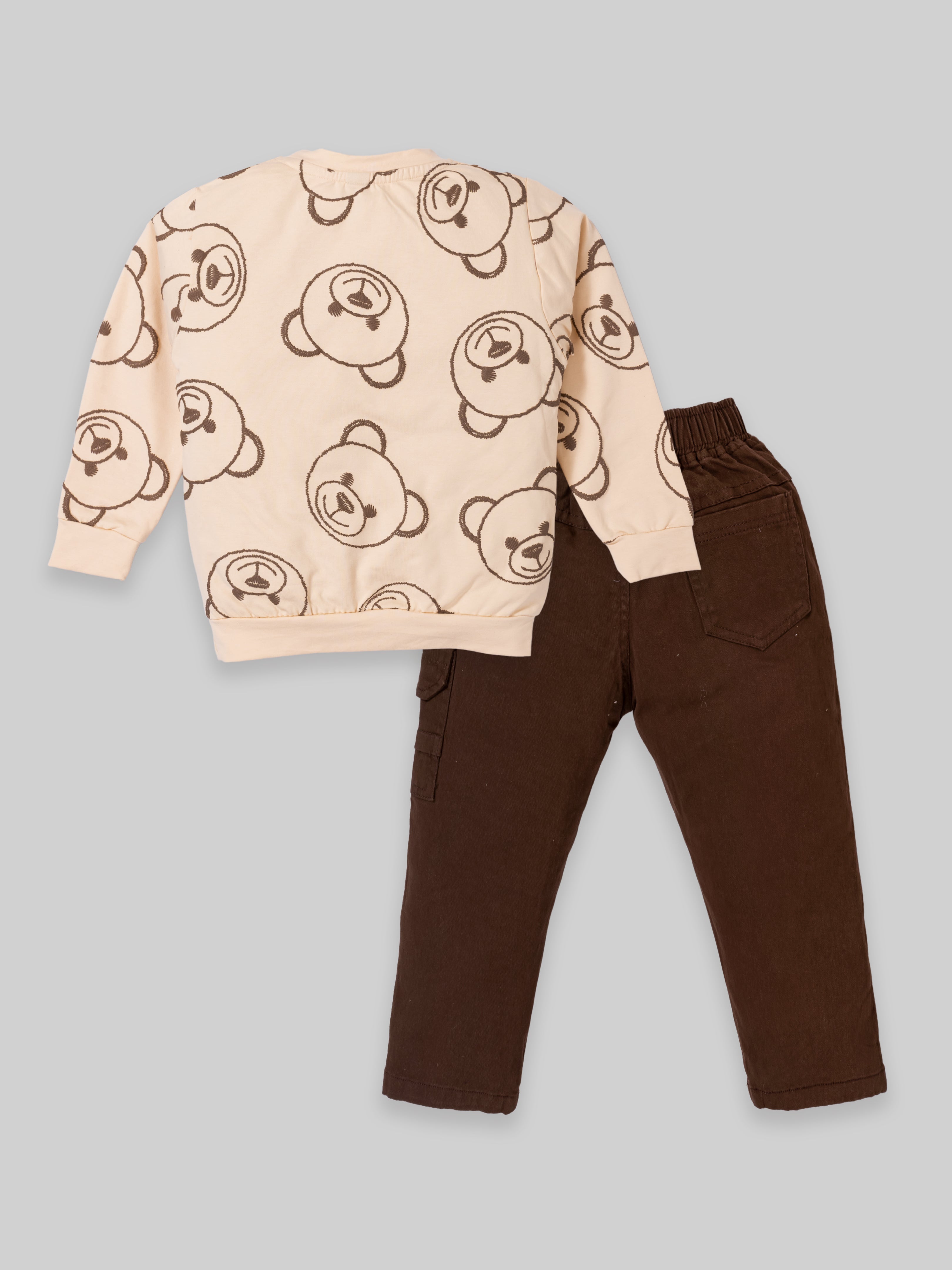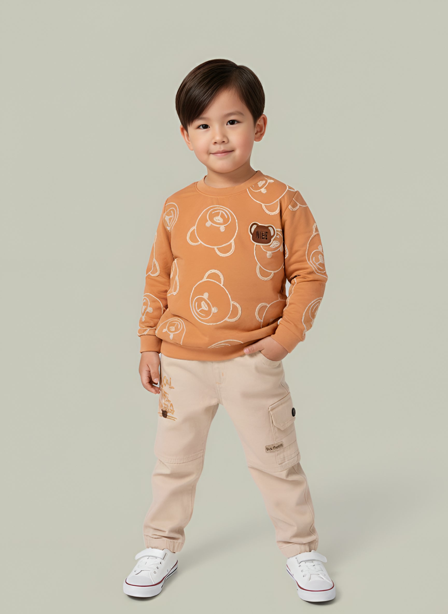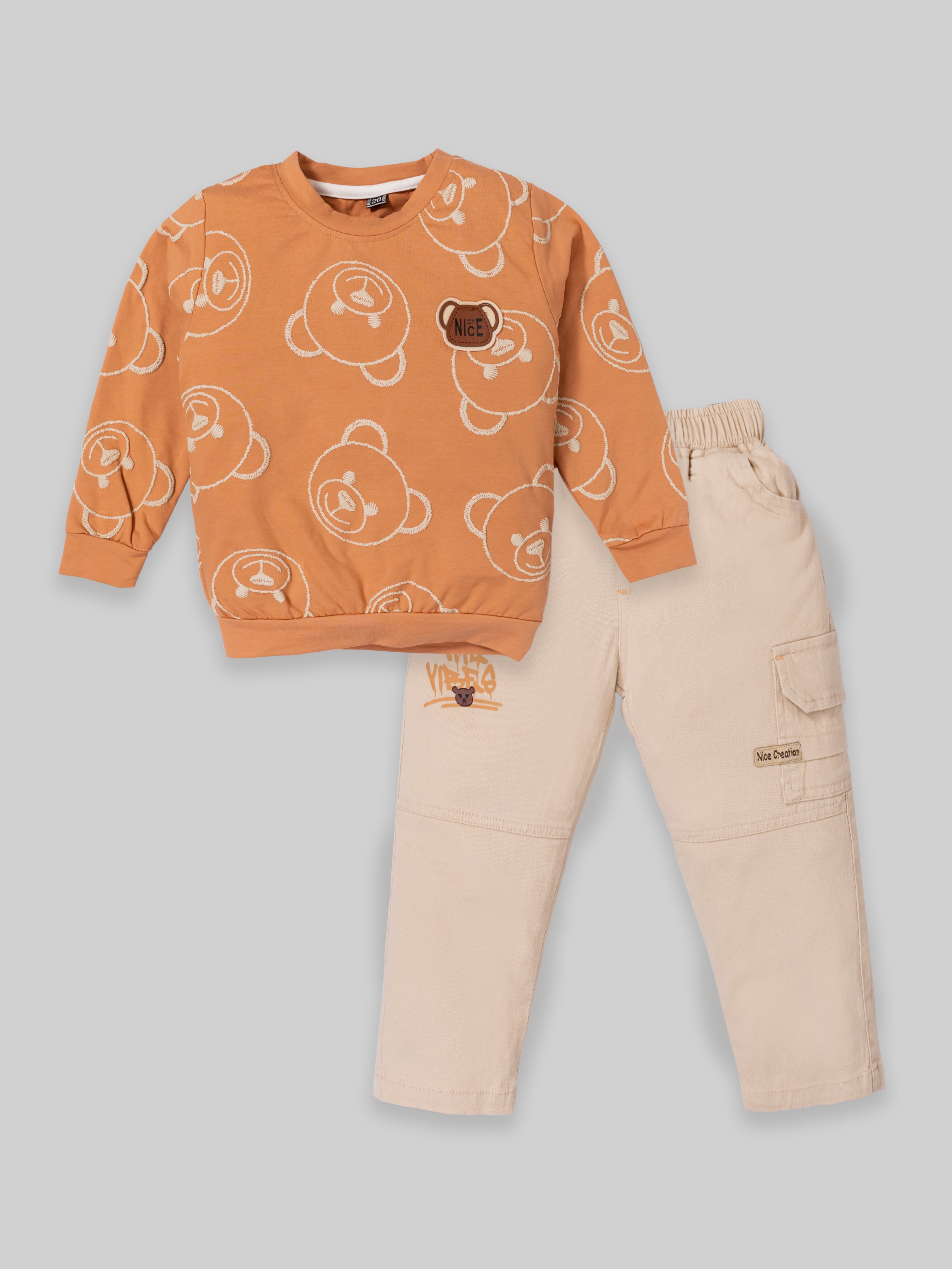 Boys Teddy Bear Printed Sweatshirt & Cargo Pants Set | Cream & Orange