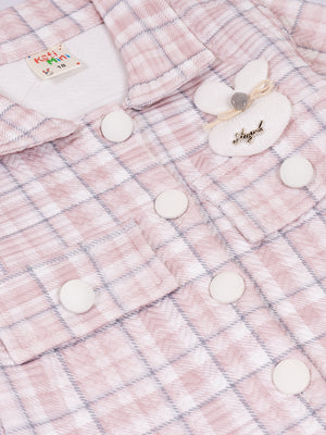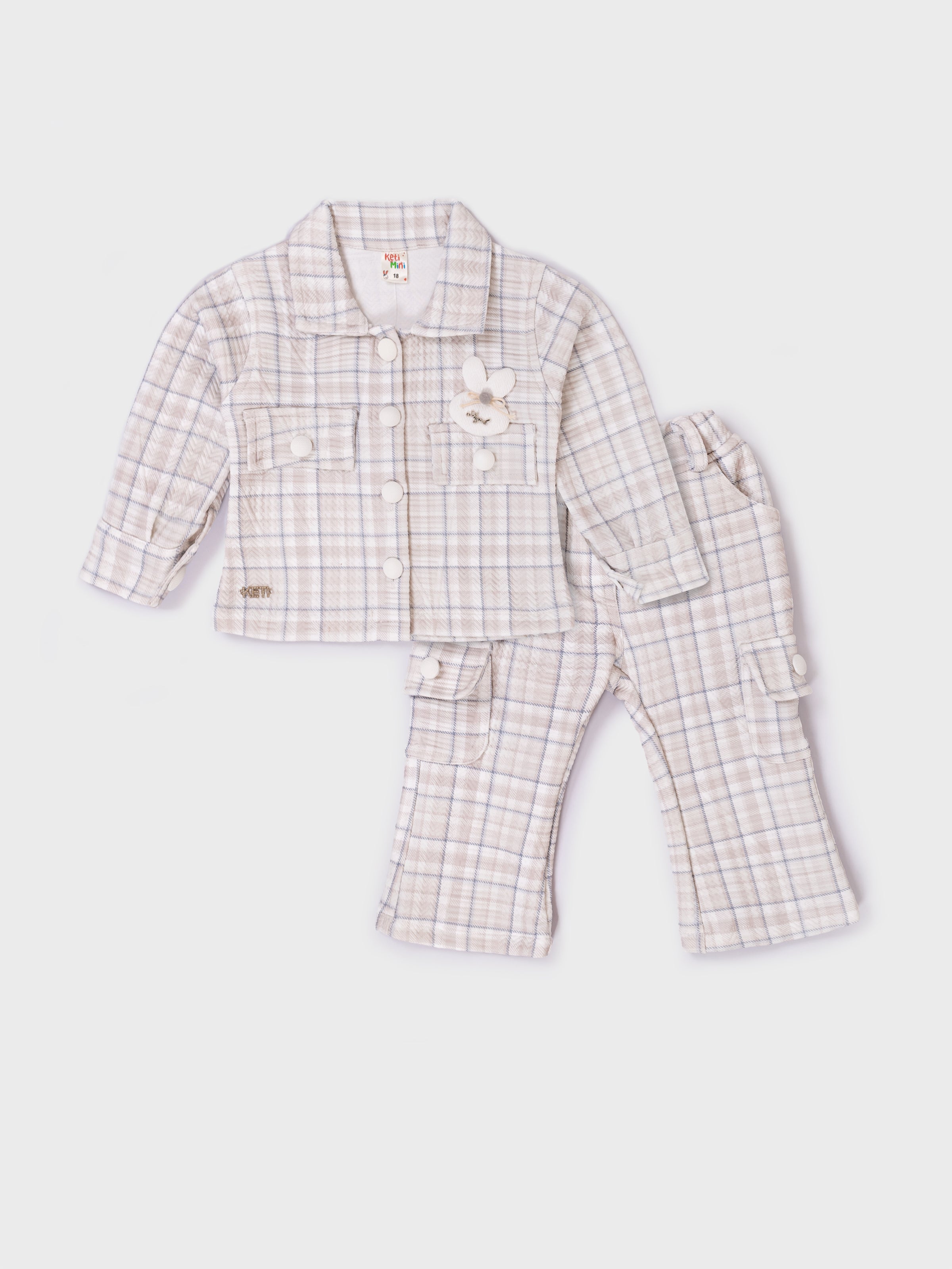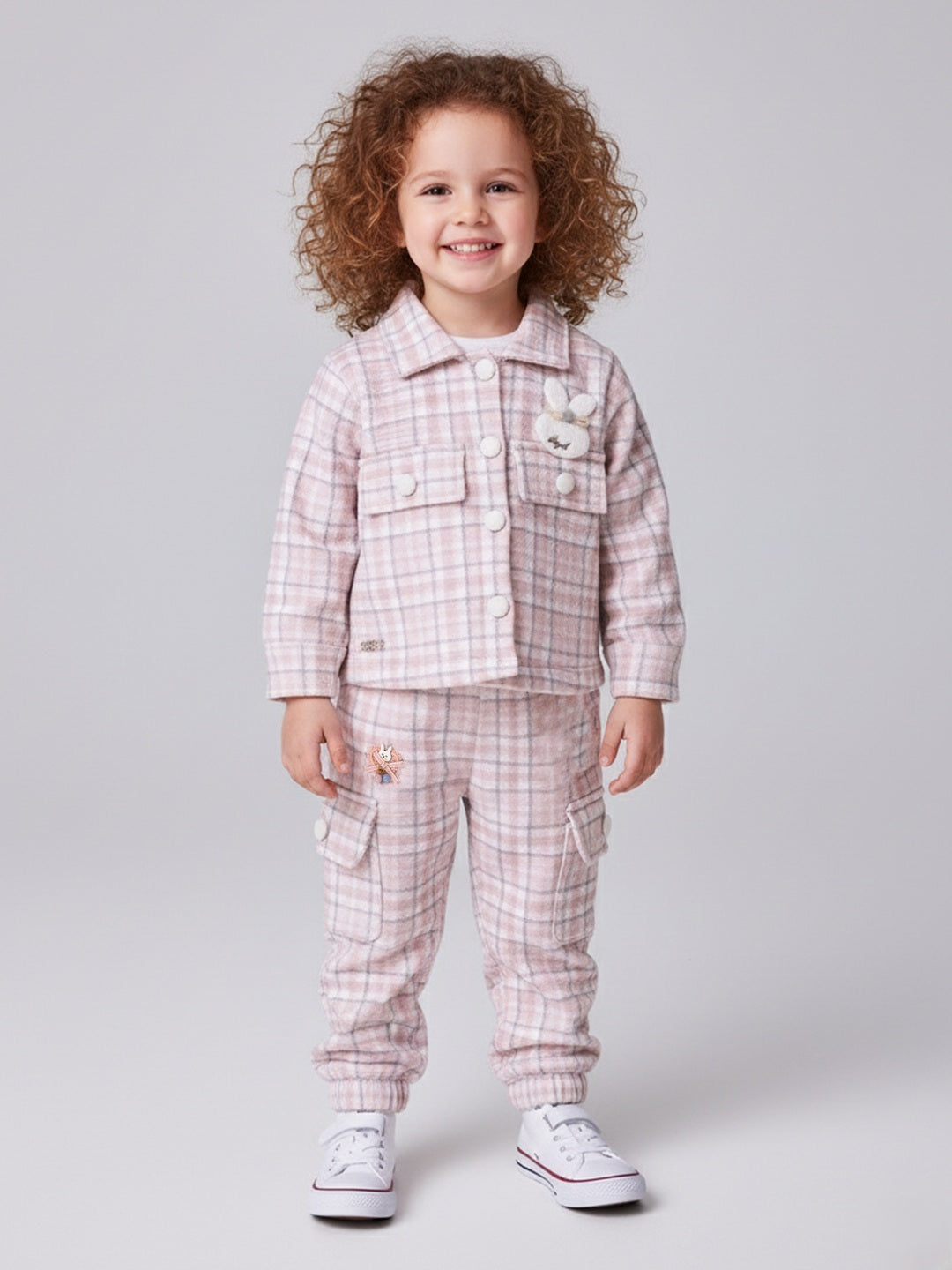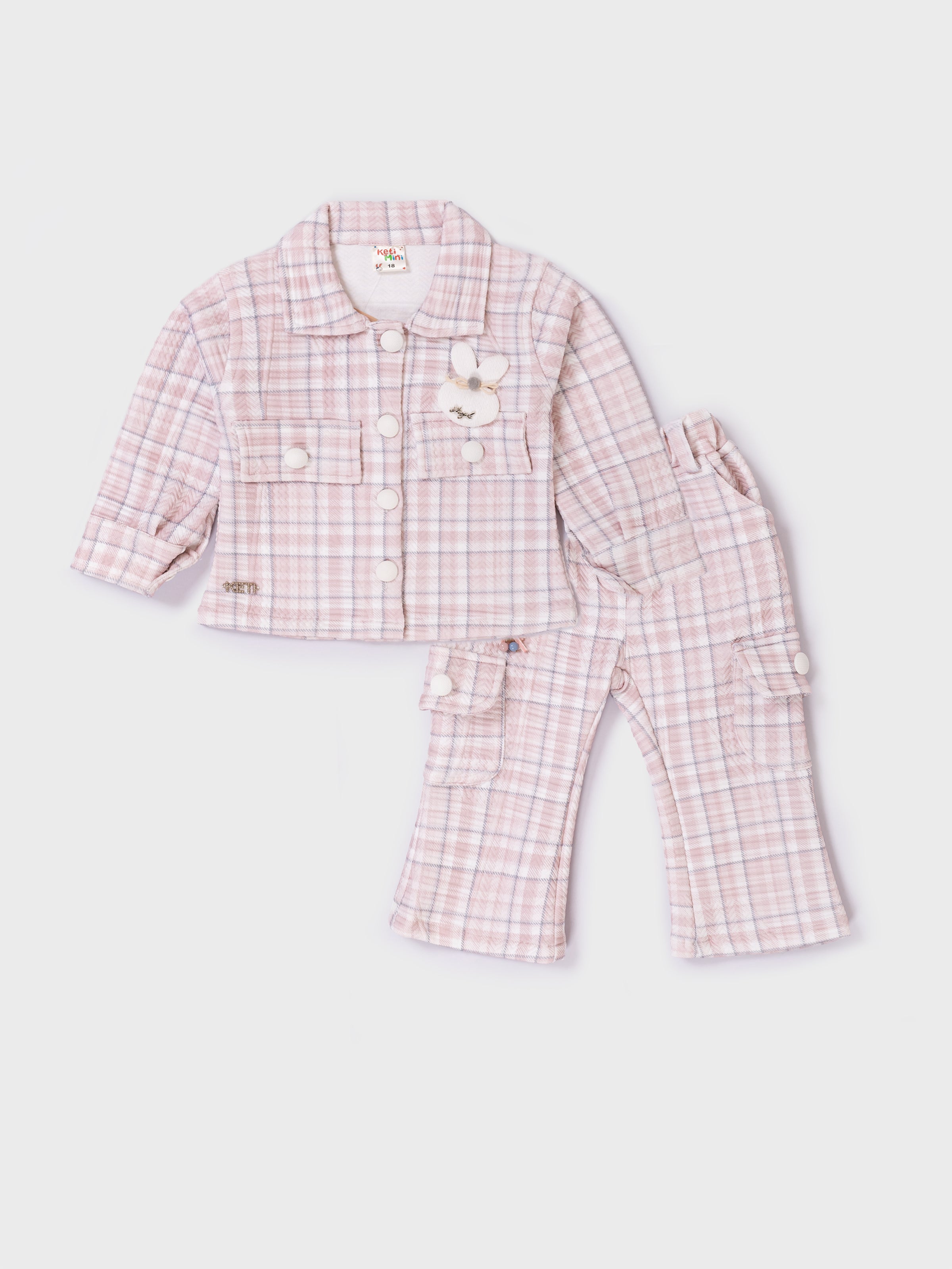 This adorable co-ord set combines comfort and style with a soft plaid jacket paired with matching style pants. Made from a cozy, warm fabric, the outfit is perfect for cooler seasons. The jacket features cute pom-pom buttons and a sweet bunny applique, adding a playful touch. The relaxed-fit pants include side pockets for added utility and charm. Ideal for outings, photoshoots, and everyday wear, this set delivers both fashion and comfort for little ones.