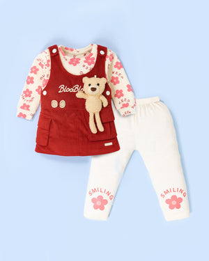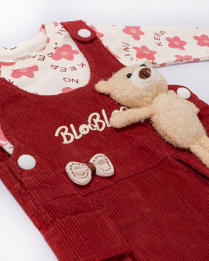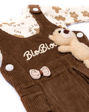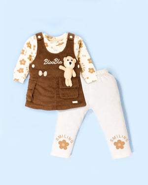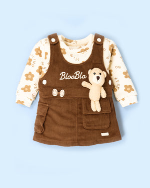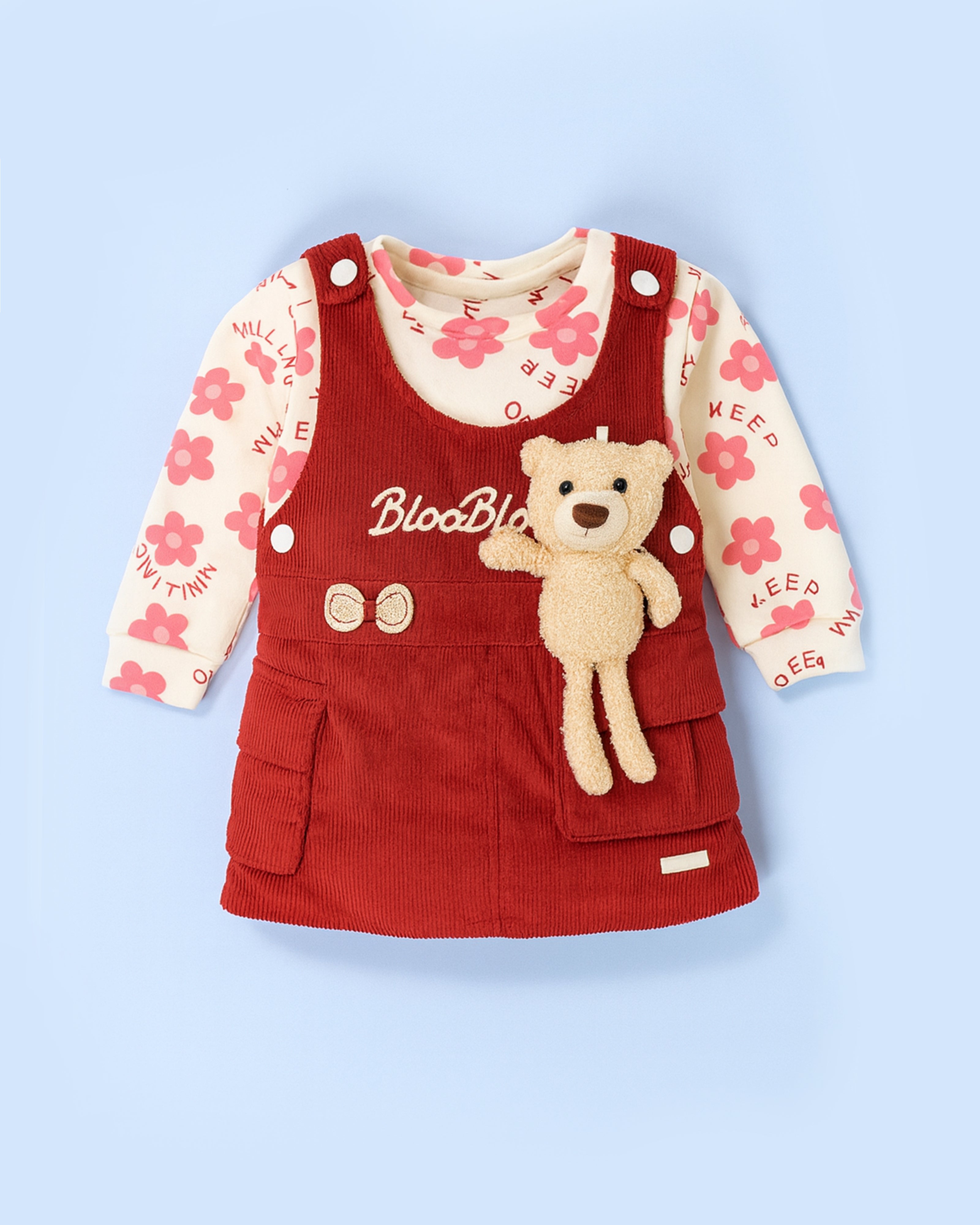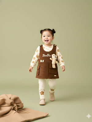 This charming girls’ outfit features a cozy corduroy pinafore dress paired with a cream long-sleeve top decorated with playful floral patterns. The dress includes cute button details, large front pockets, and a small plush teddy bear attached for extra sweetness. Paired with white leggings. this outfit combines comfort and style—perfect for playtime, photoshoots, or everyday wear.