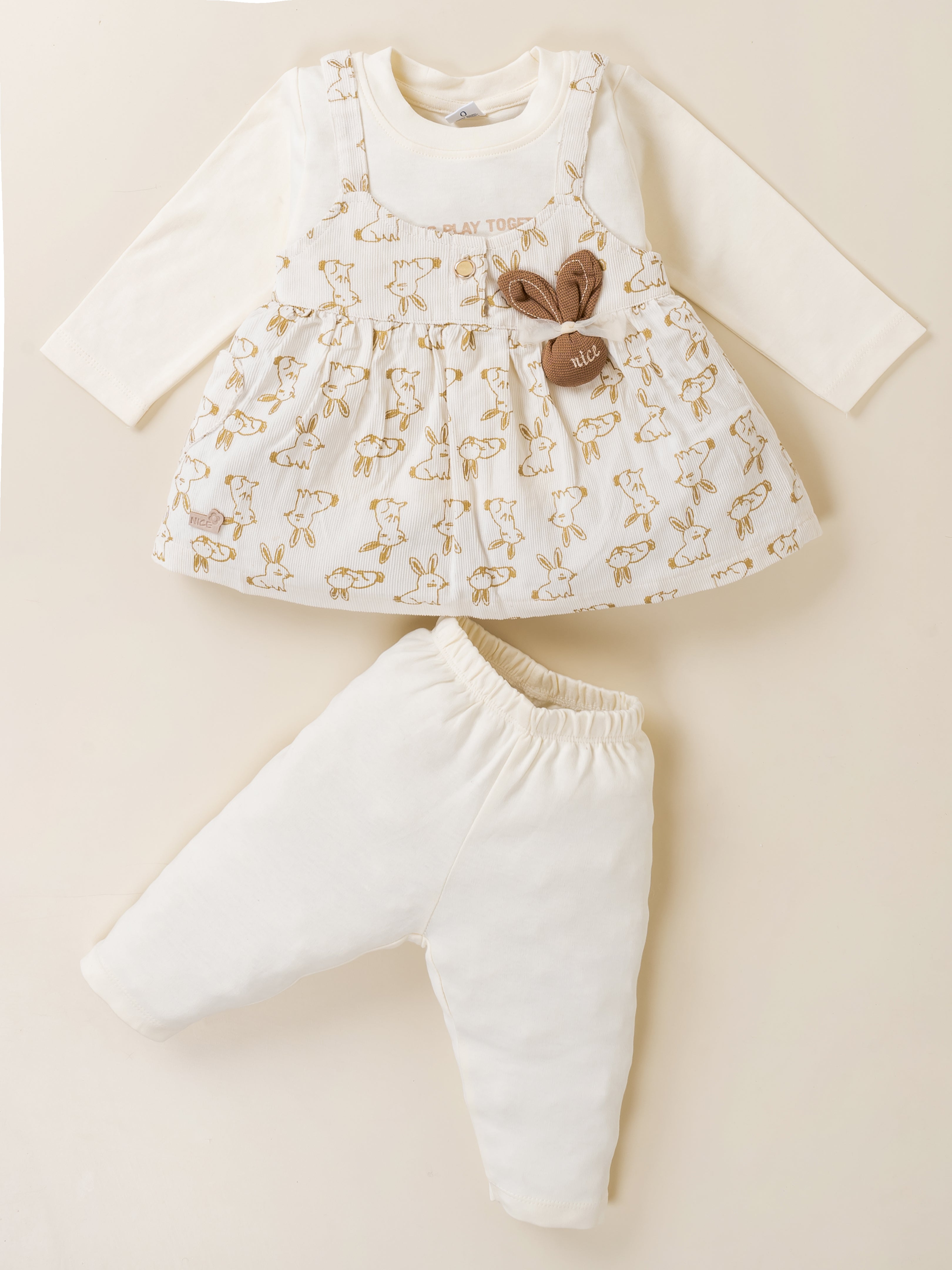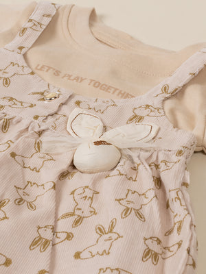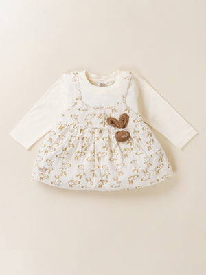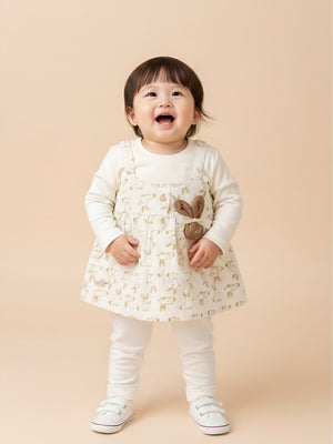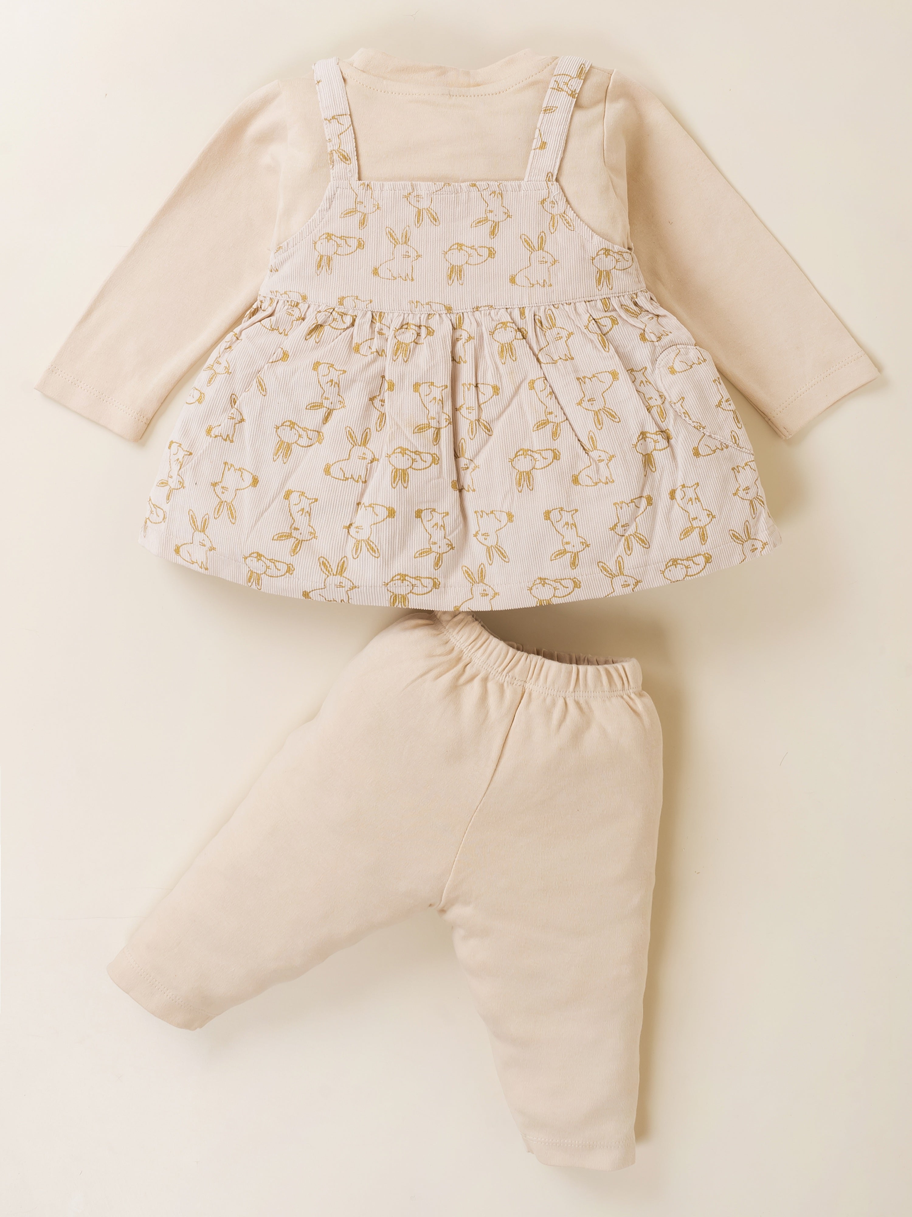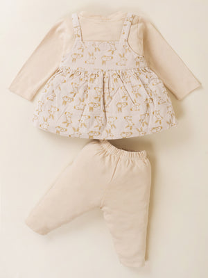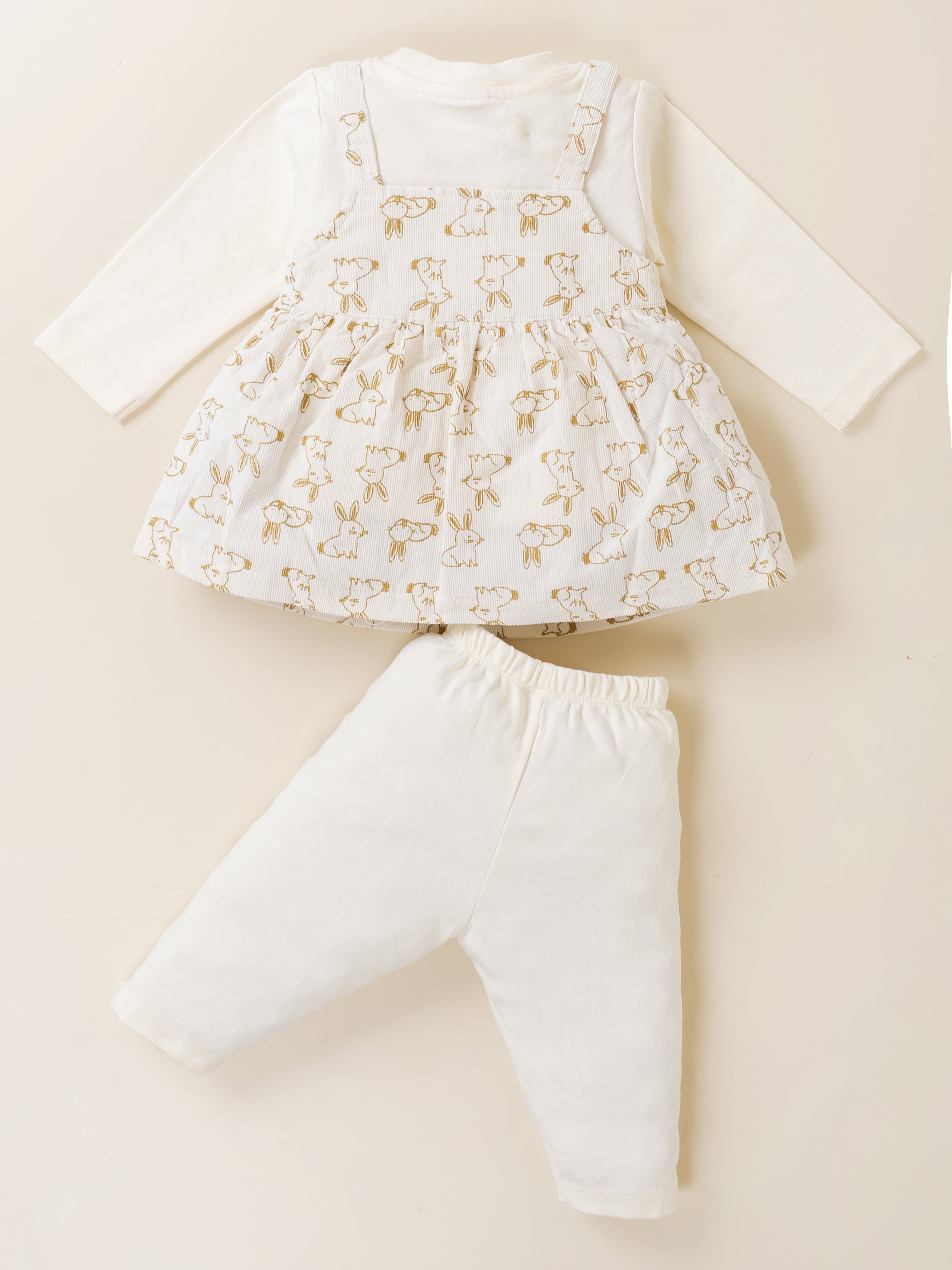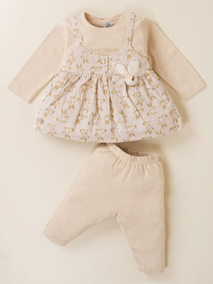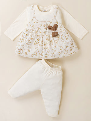 Dress your little princess in adorable comfort with this Baby Girl Frock & Leggings Set from Baby’s Day. Featuring a cute bunny-print dungaree-style frock layered over a full-sleeve inner top and paired with matching leggings, this outfit is crafted from premium soft cotton fabric. Designed to keep babies warm yet comfortable, it’s perfect for daily wear, outings, and special occasions