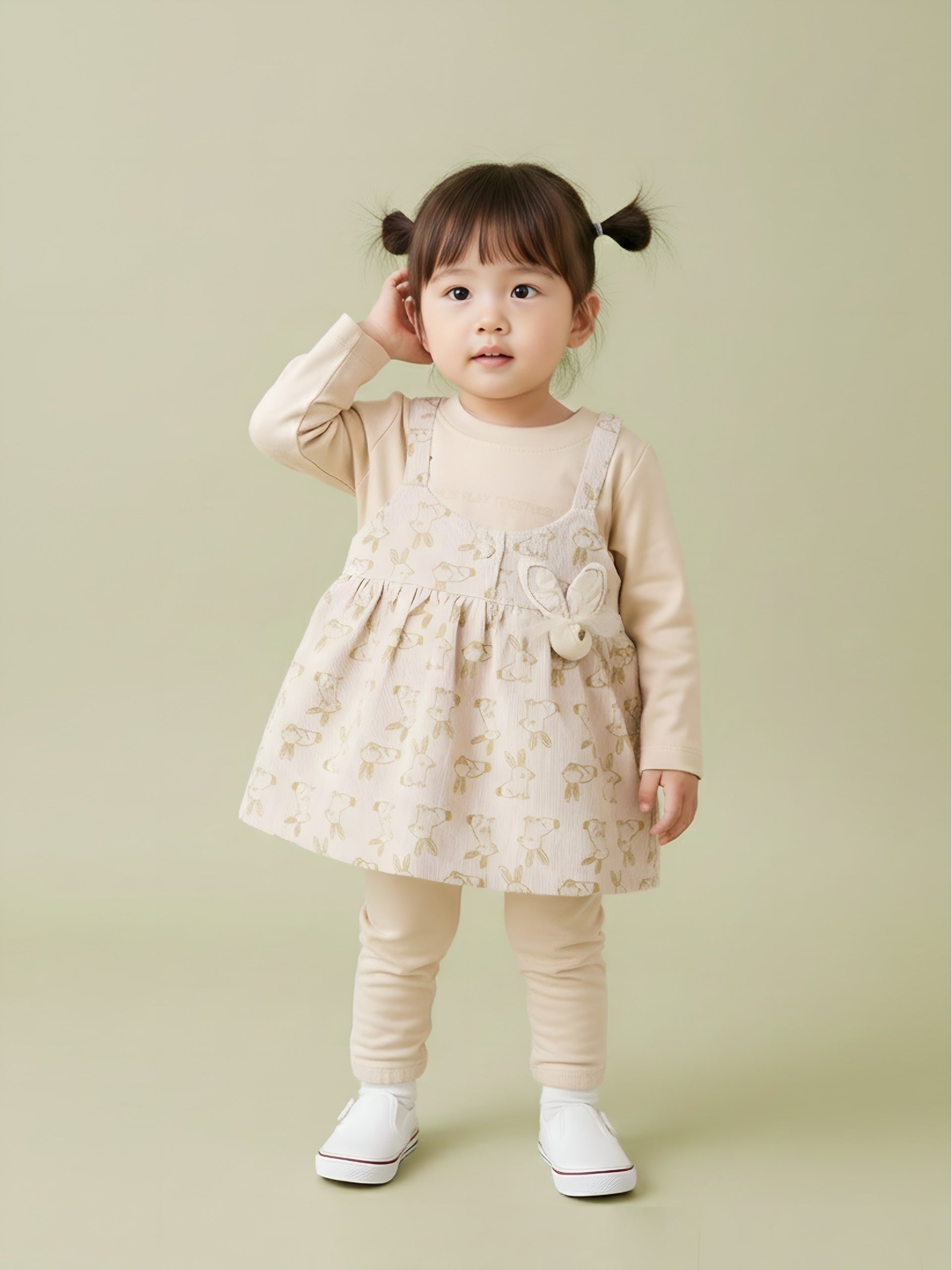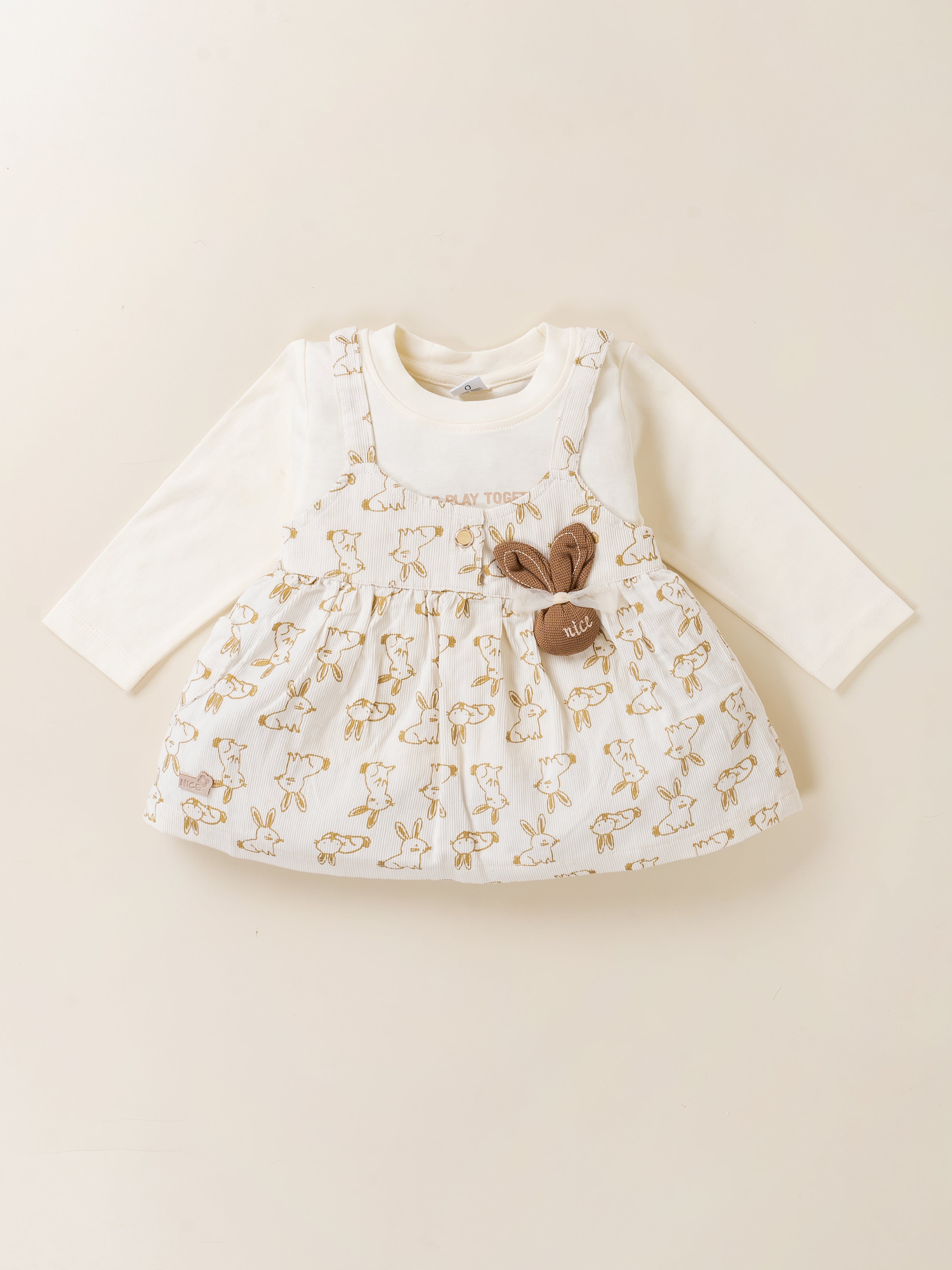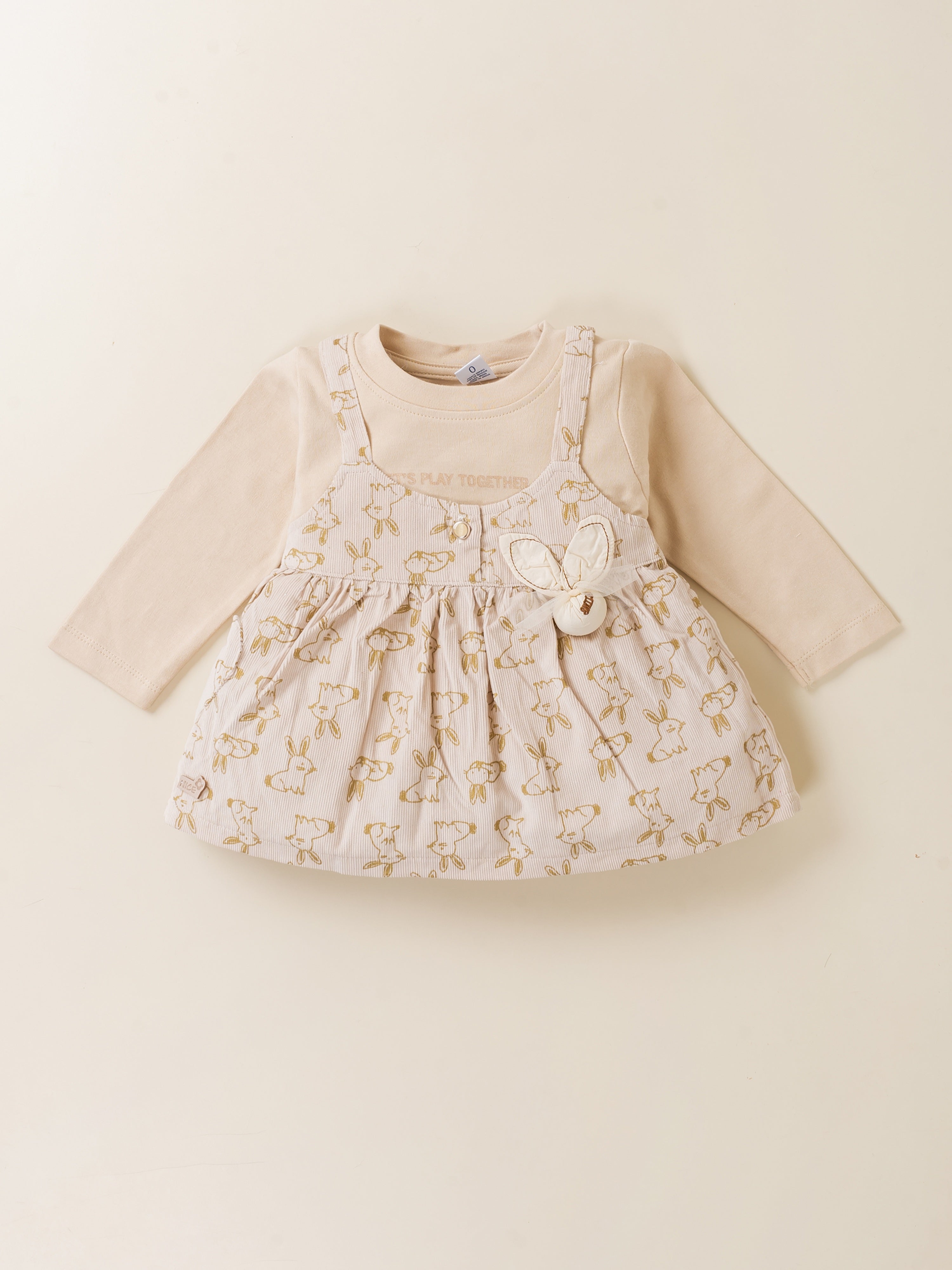 Dress your little princess in adorable comfort with this Baby Girl Frock & Leggings Set from Baby’s Day. Featuring a cute bunny-print dungaree-style frock layered over a full-sleeve inner top and paired with matching leggings, this outfit is crafted from premium soft cotton fabric. Designed to keep babies warm yet comfortable, it’s perfect for daily wear, outings, and special occasions