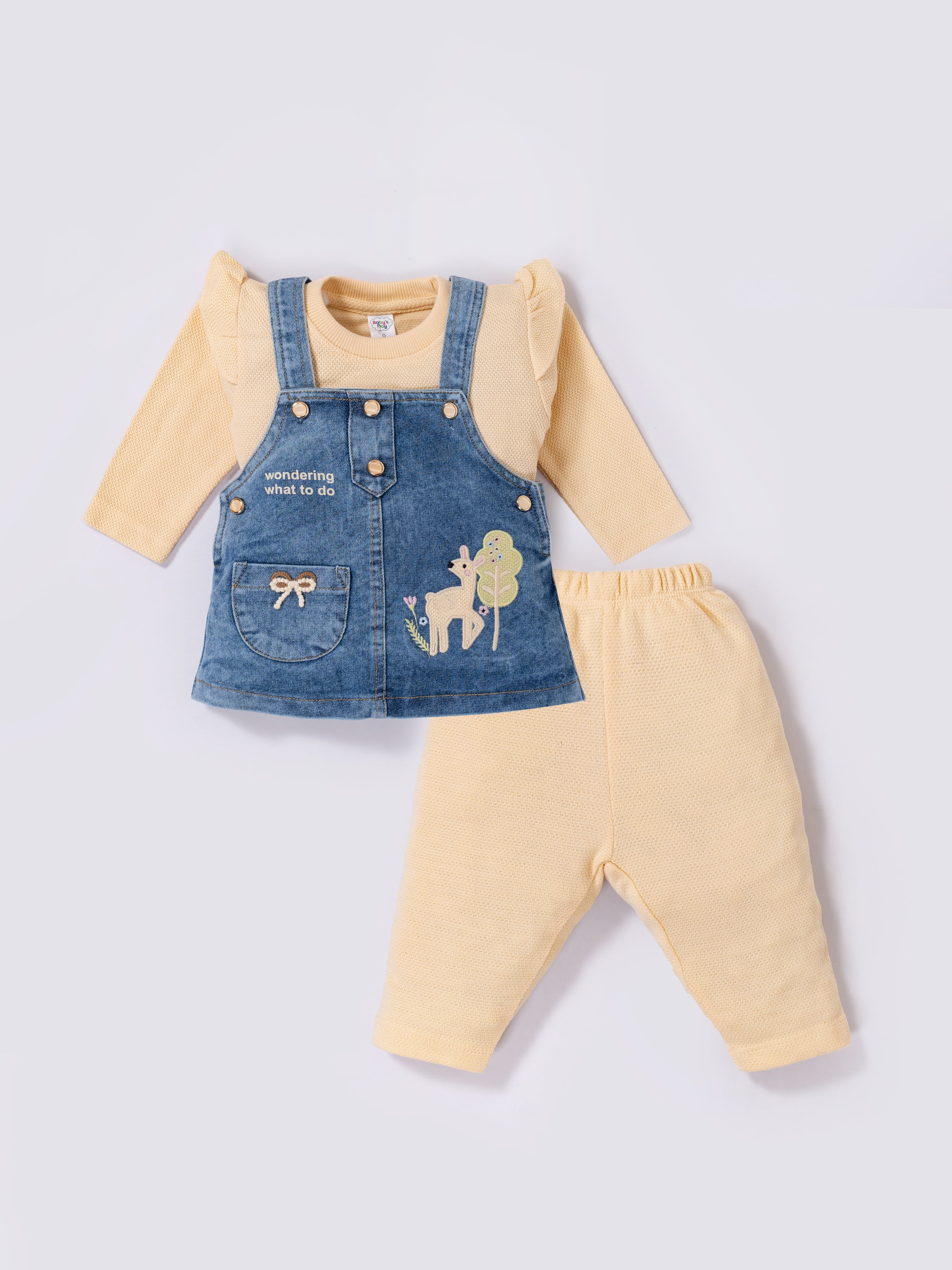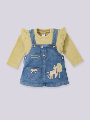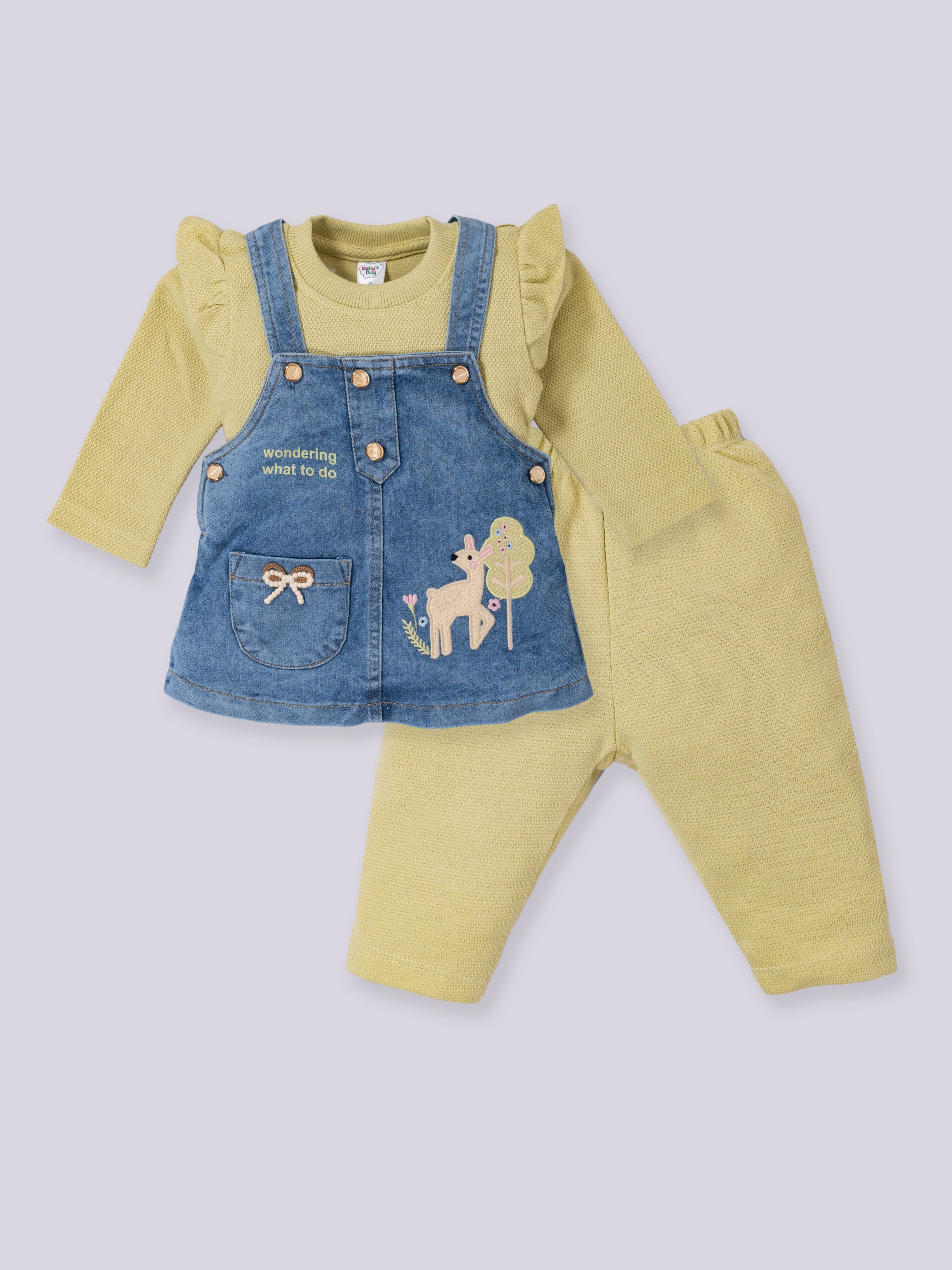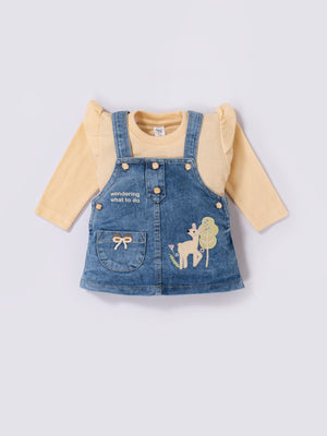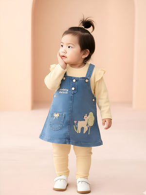 A charming and adorable pinafore set designed to keep little girls stylish and comfortable all day long. The set includes a soft full-sleeve inner top, cozy leggings, and a denim pinafore dress embellished with cute deer and nature-themed embroidery. Perfect for outings, celebrations, or everyday wear, this outfit blends warmth, style, and playful detailing.