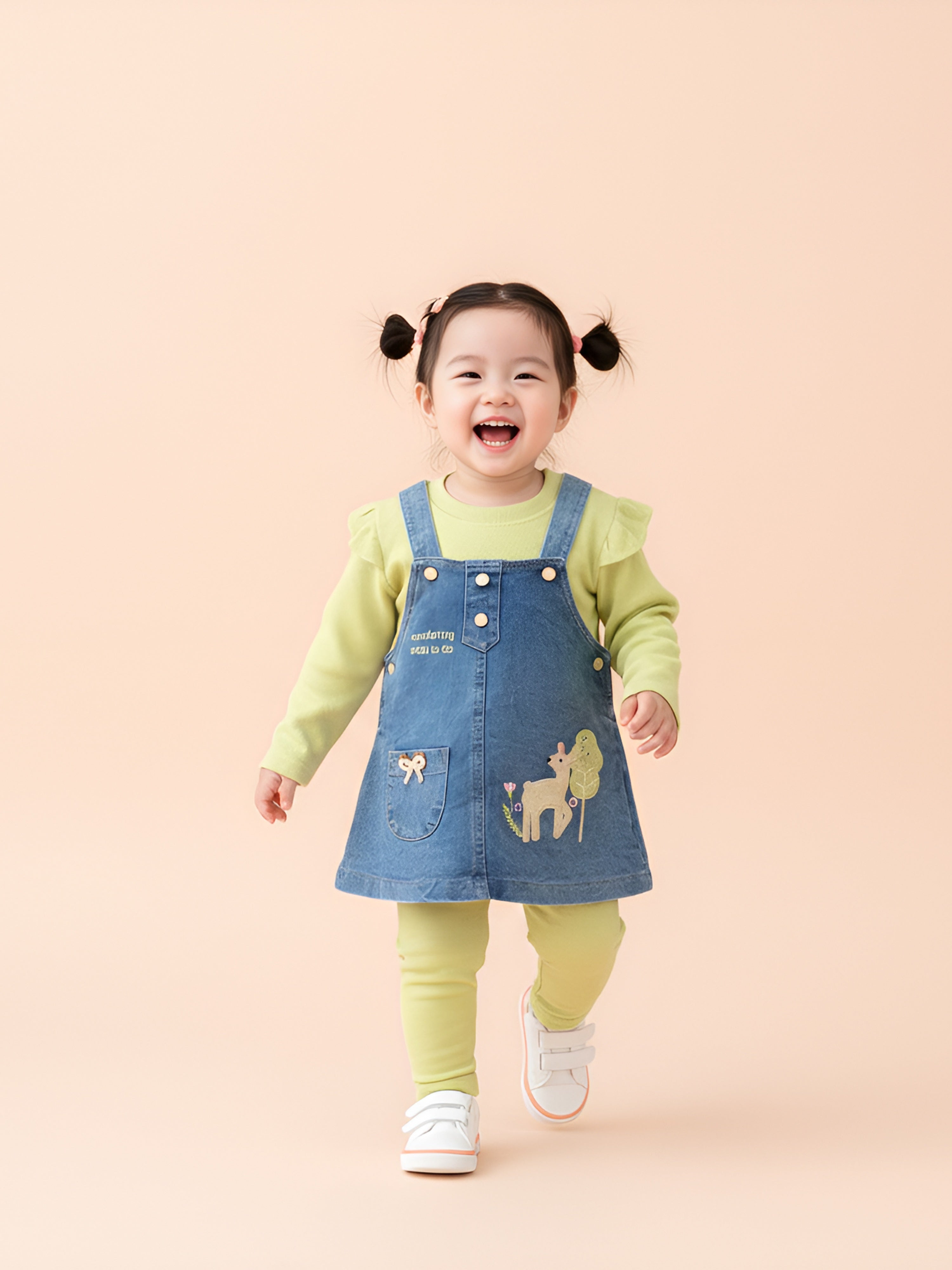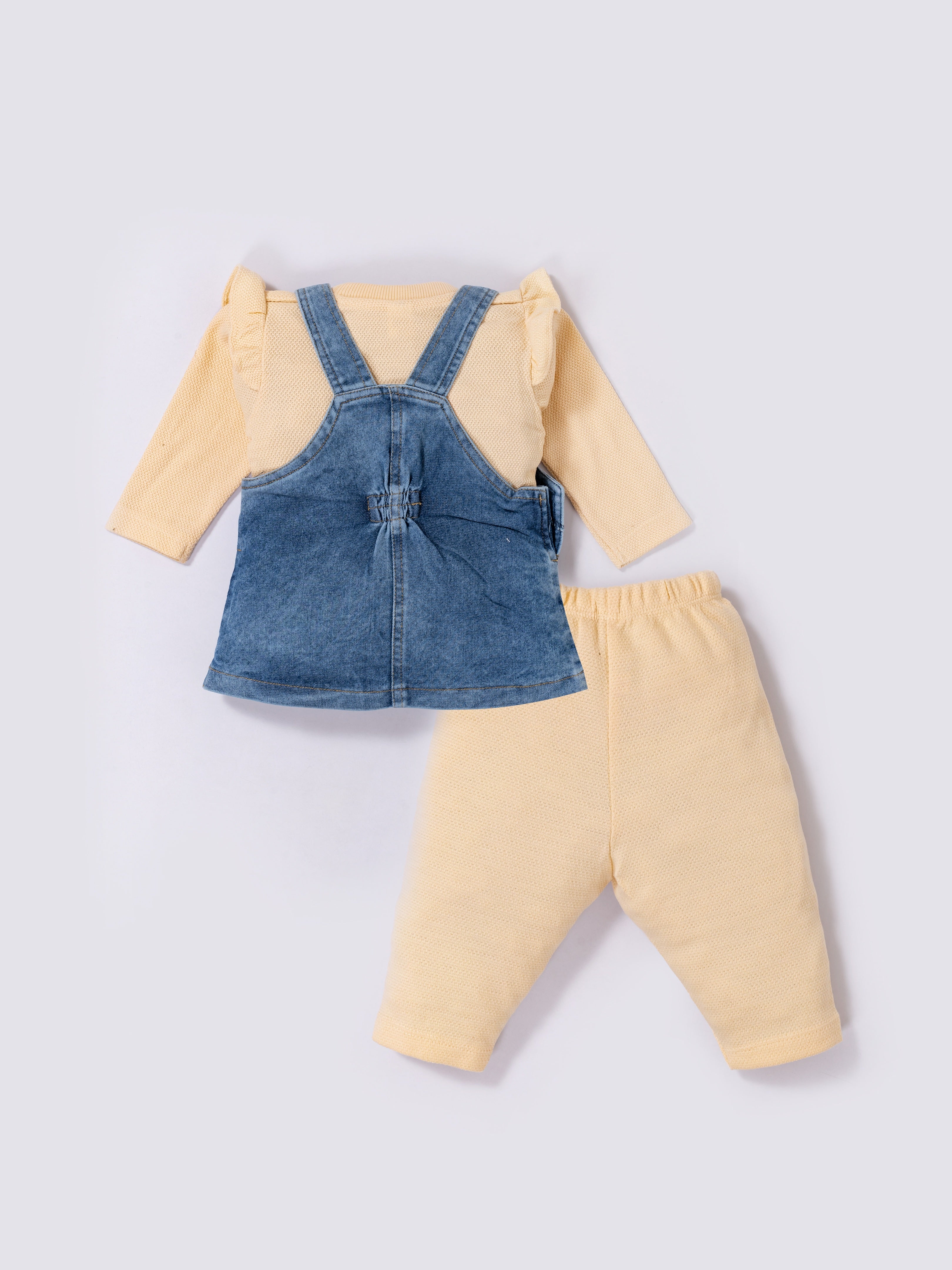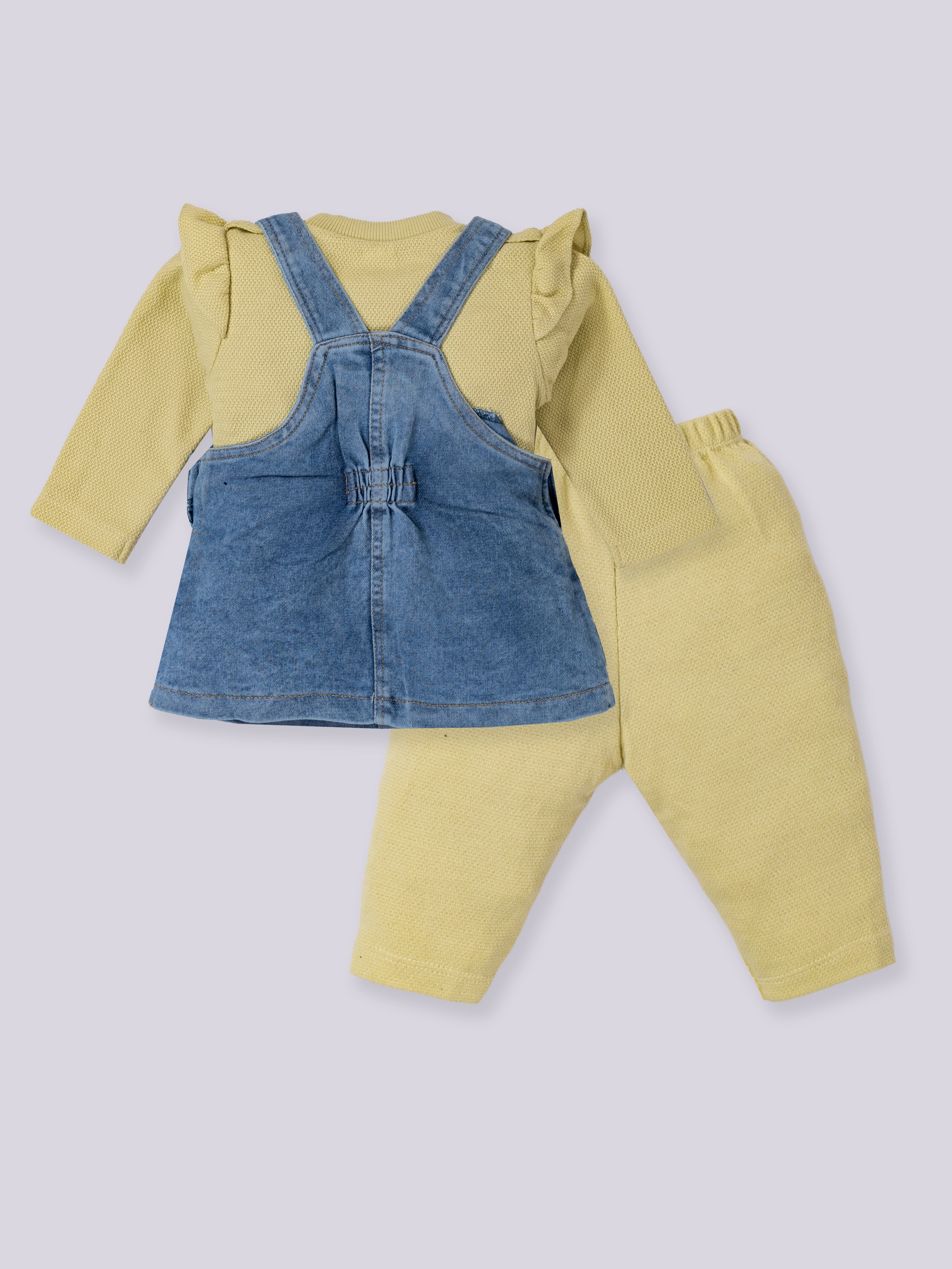 A charming and adorable pinafore set designed to keep little girls stylish and comfortable all day long. The set includes a soft full-sleeve inner top, cozy leggings, and a denim pinafore dress embellished with cute deer and nature-themed embroidery. Perfect for outings, celebrations, or everyday wear, this outfit blends warmth, style, and playful detailing.