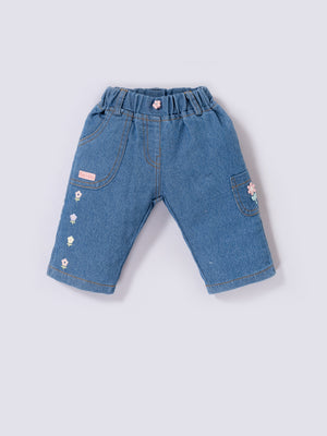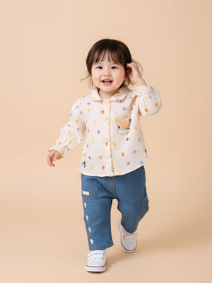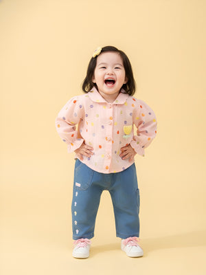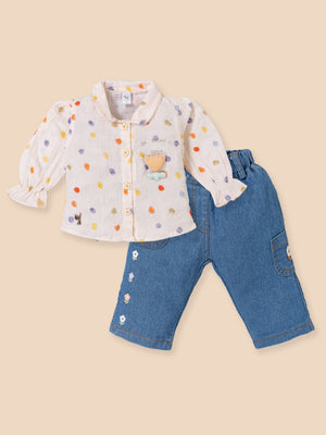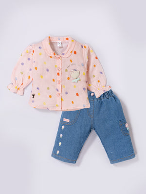 A charming and playful outfit designed for little girls, featuring a soft polka-dot full-sleeve top paired with stylish denim pants. Crafted for comfort and cuteness, this set is perfect for everyday wear, outings, and festive gatherings. The adorable flower patch and printed detailing add a fun, cheerful touch, making it a delightful choice for trendy baby fashion.