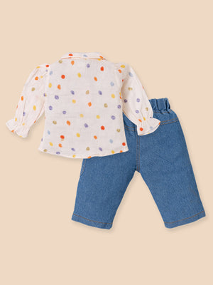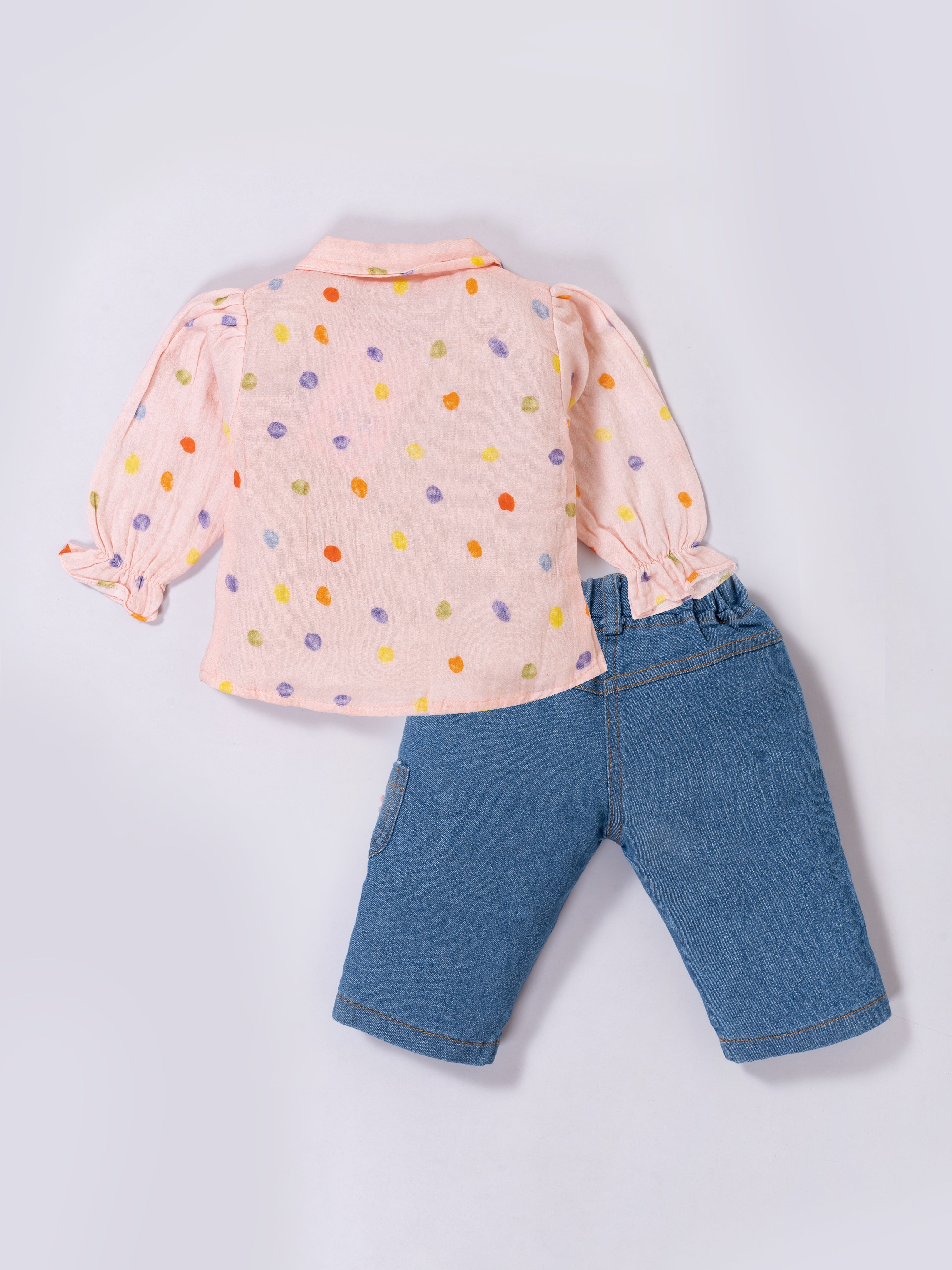 Full Sleeve Polka Dot Printed Top and Denim Set