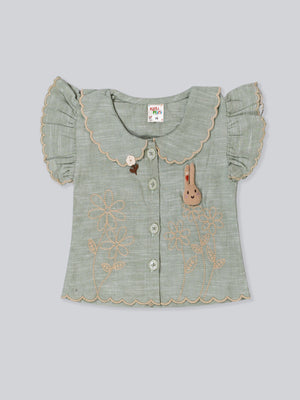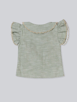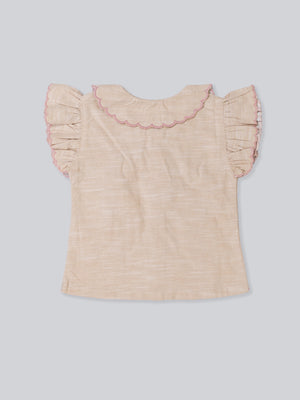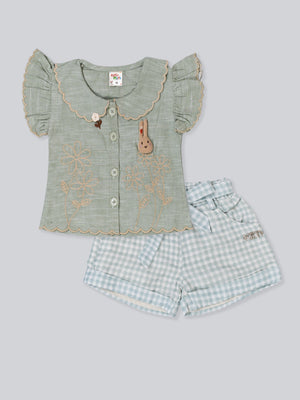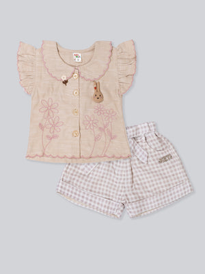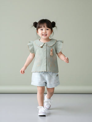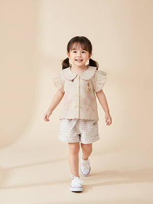 This charming girls’ summer outfit set is designed with delicate details and everyday comfort in mind. Featuring a beautifully textured short-sleeve top with ruffle accents and paired with classic check-pattern shorts, this set offers a timeless, elegant look for warm-weather days. Lightweight and breathable, it’s perfect for playtime, family outings, or special casual occasions
