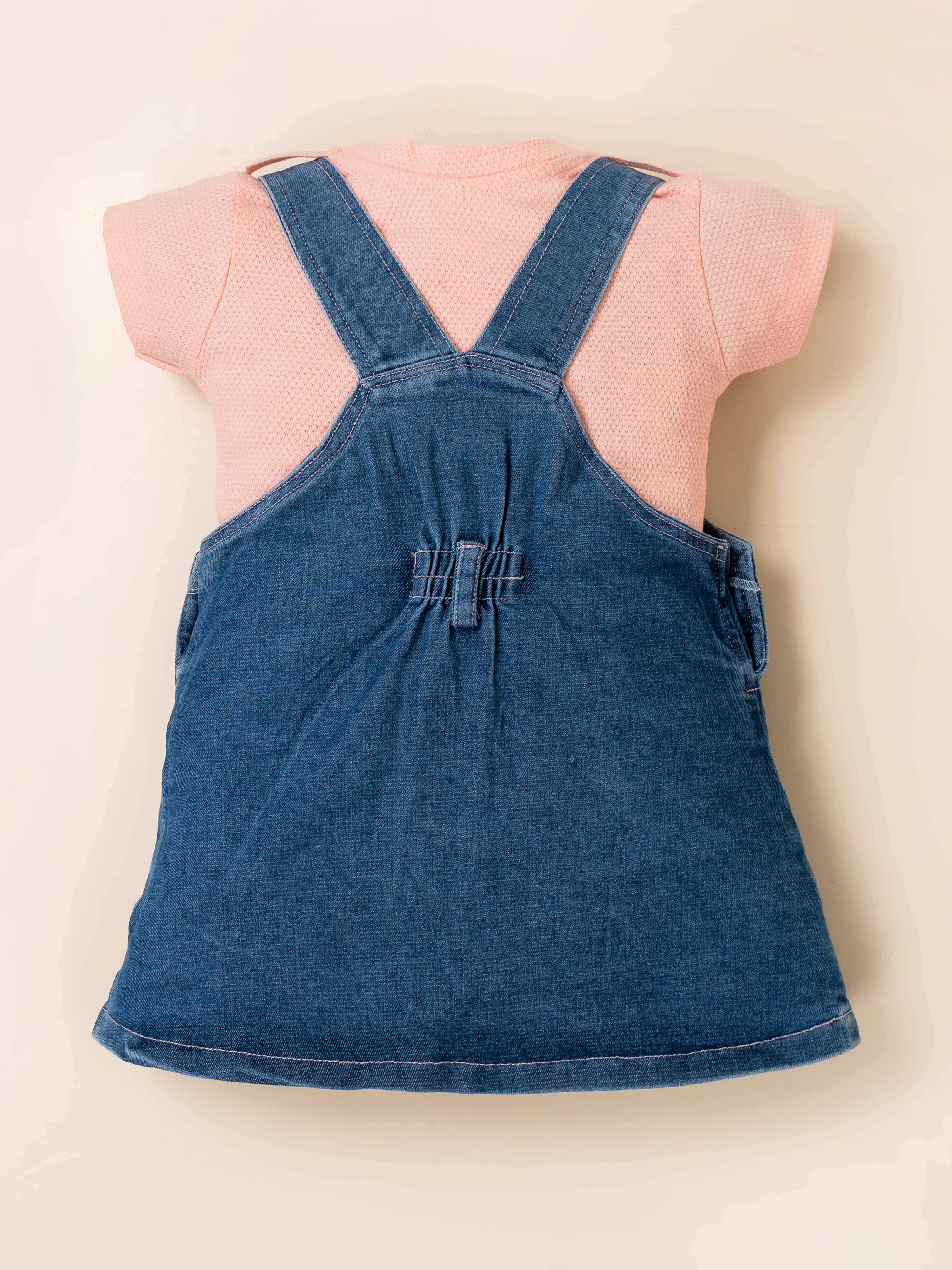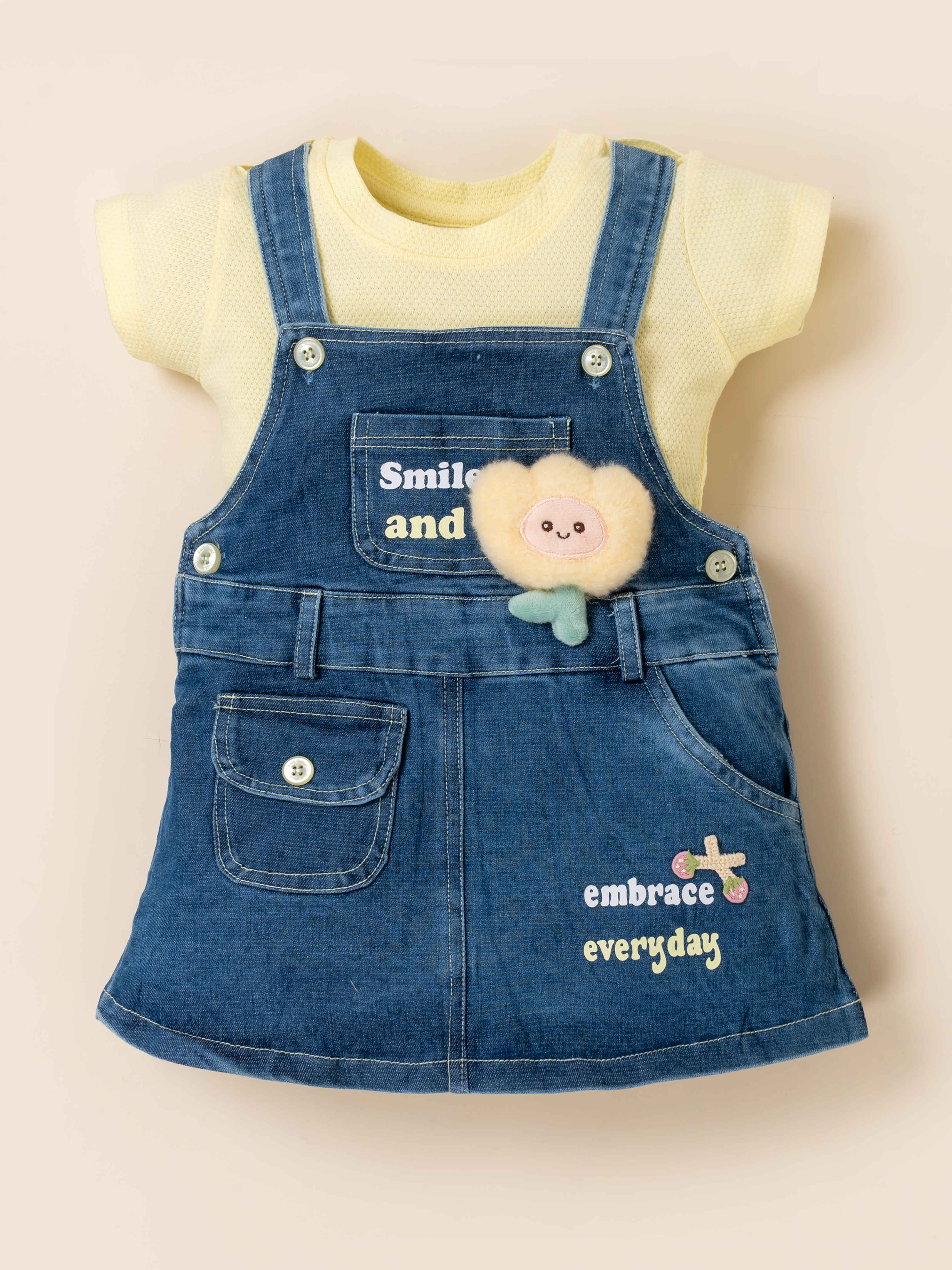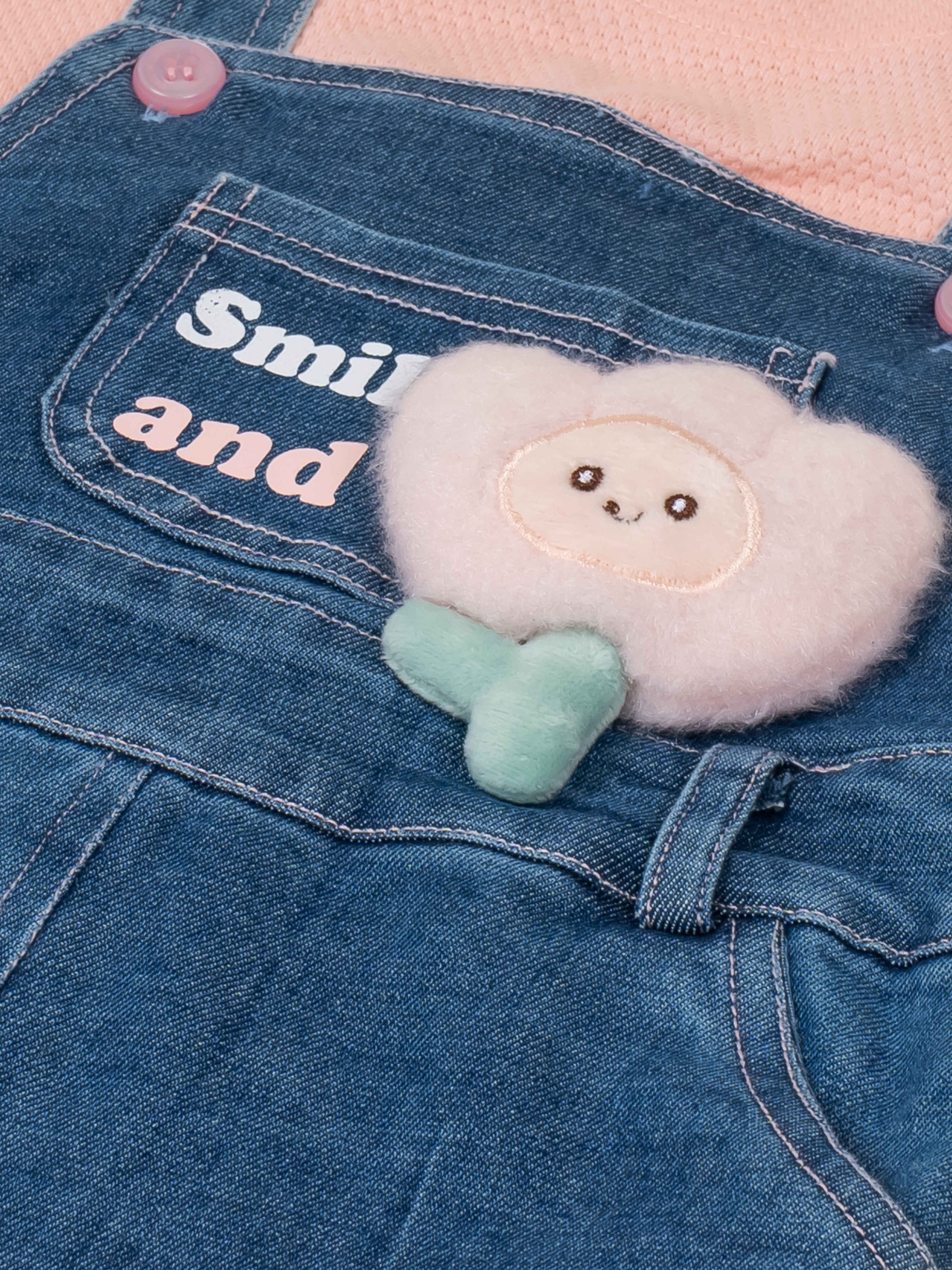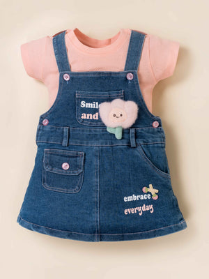 Add a dose of charm to your little one’s wardrobe with this adorable denim pinafore dress set. Paired with a soft pink textured T-shirt, this outfit is perfect for playdates, outings, and everyday wear. The denim dress features sweet printed messages, stylish button details, and a fluffy flower applique that kids will absolutely love. Comfortable, breathable, and easy to move in, it’s a go-to outfit for all-day cuteness and comfort