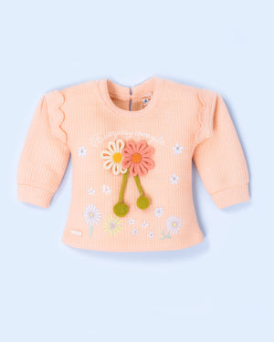- Soft peach knit top with 3D flower appliqué and printed floral accents