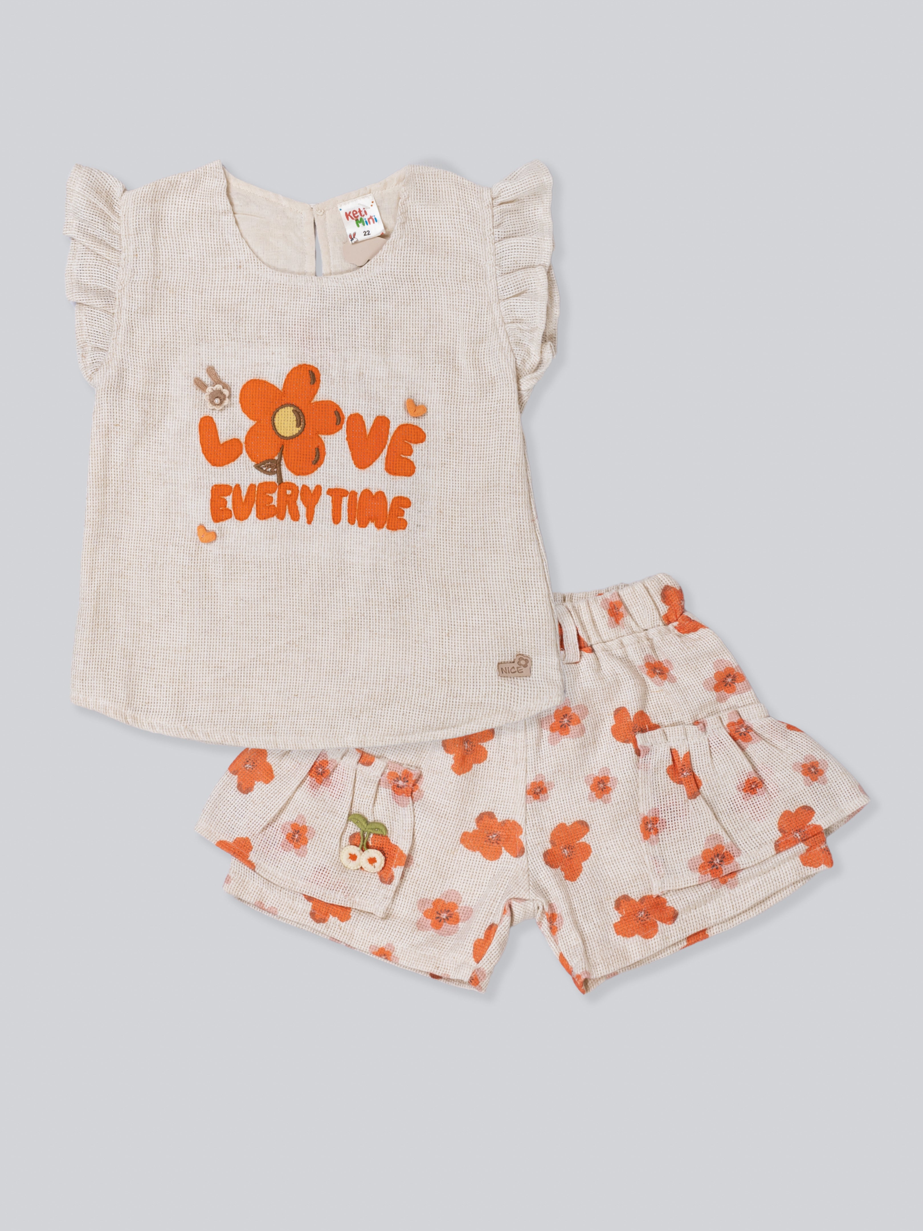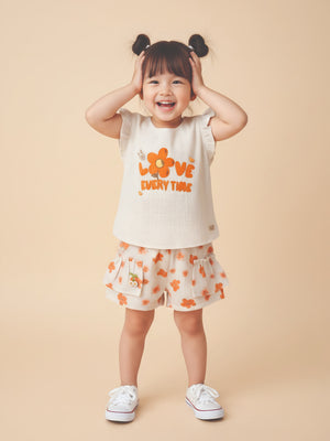 This charming girls’ summer set brings together comfort and cuteness in the best way. Featuring a soft sleeveless top with delicate ruffle sleeves and a cheerful floral print, paired with matching printed shorts, it’s made for warm days filled with smiles. Lightweight and easy to wear, this outfit is ideal for playtime, outings, or everyday summer style