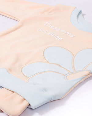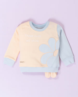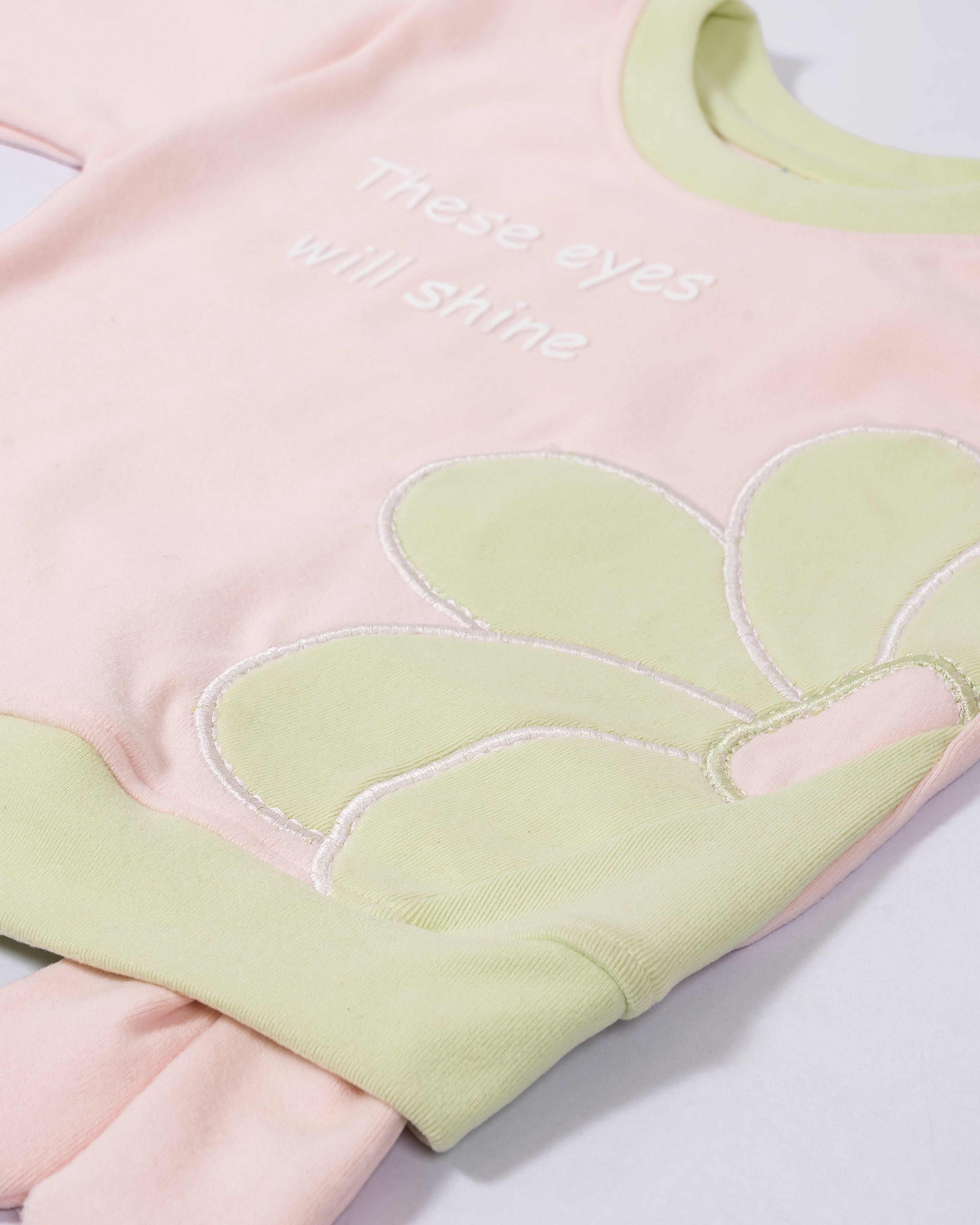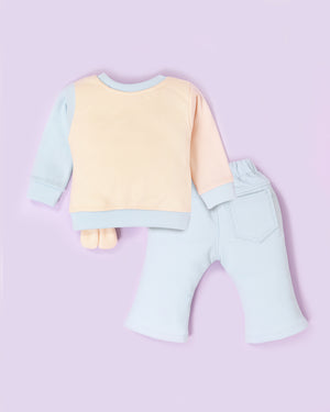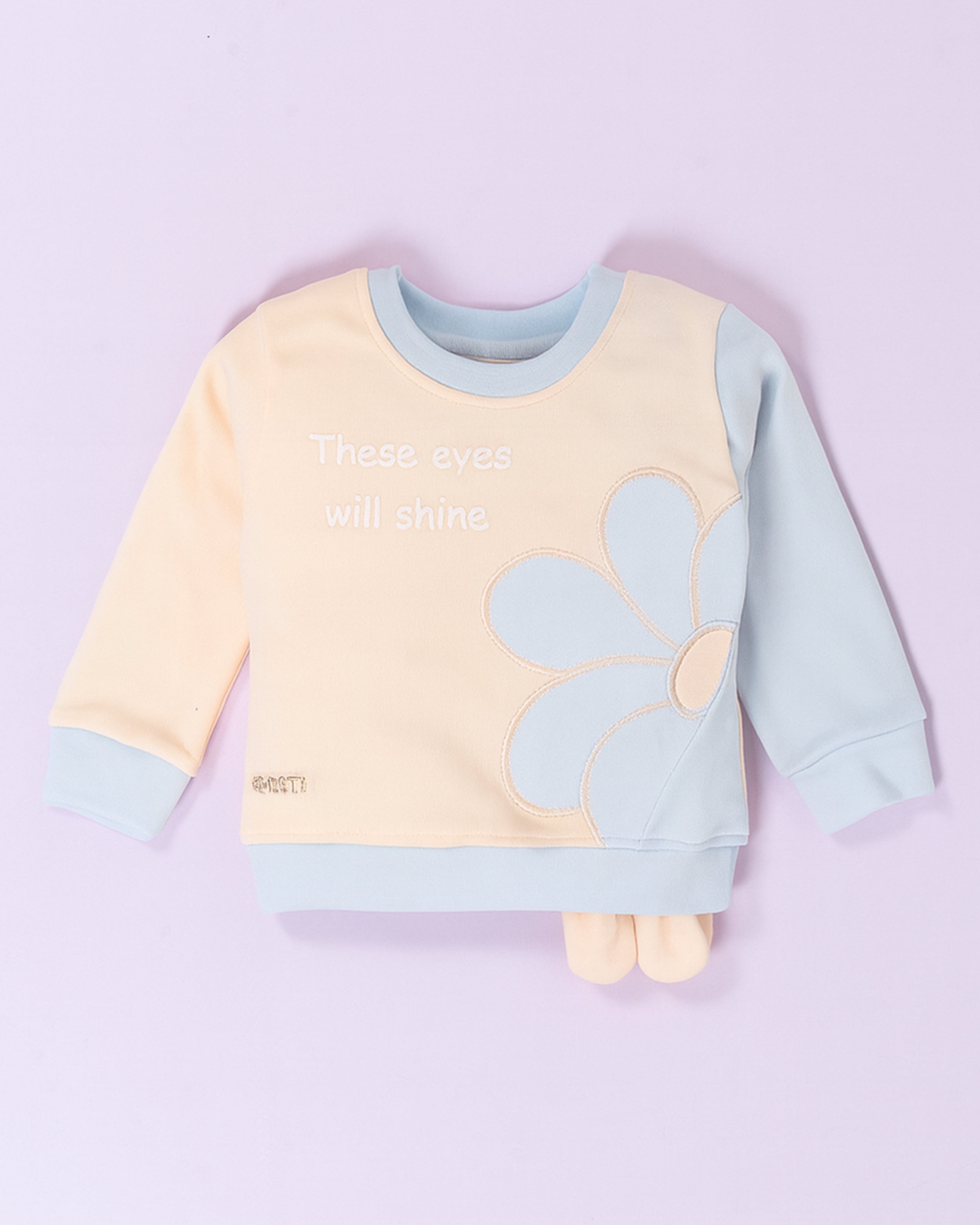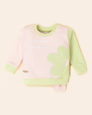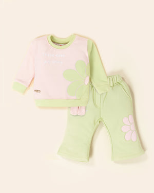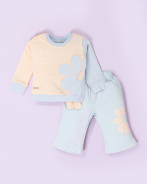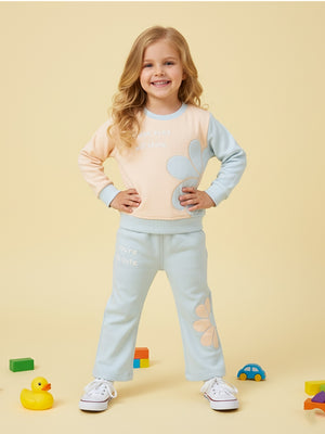 This adorable pastel co-ord set is perfect for everyday comfort and playful style. Featuring a soft color-blocked sweatshirt with a cute floral applique and motivational text, paired with matching jogger pants embellished with a floral patch and sweet lettering. Designed using cozy, breathable fabric, this set keeps your little girl looking cute and feeling comfortable all day long — ideal for outings, playtime, or casual wear.