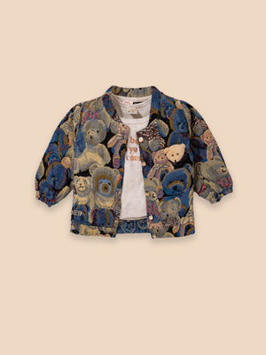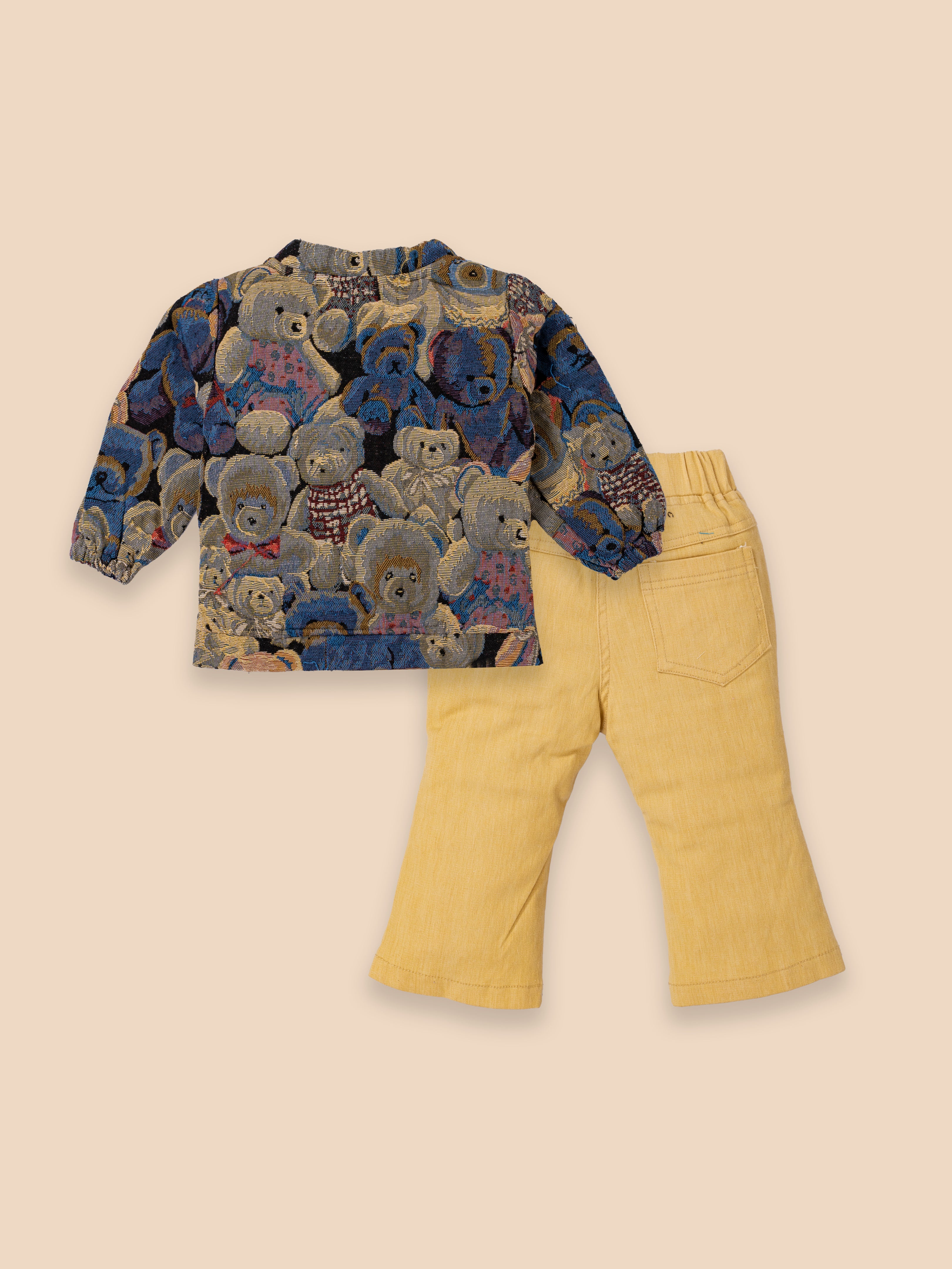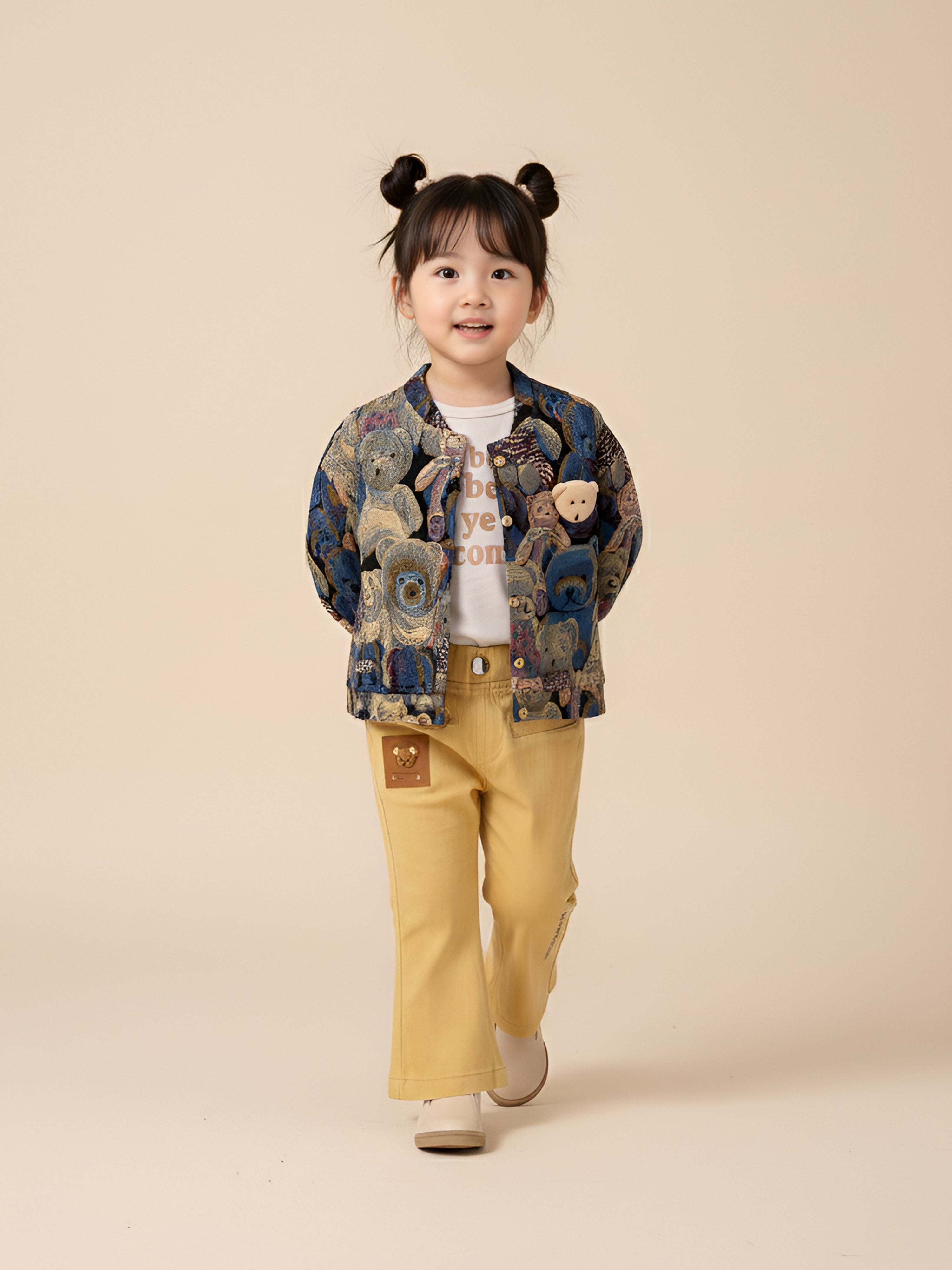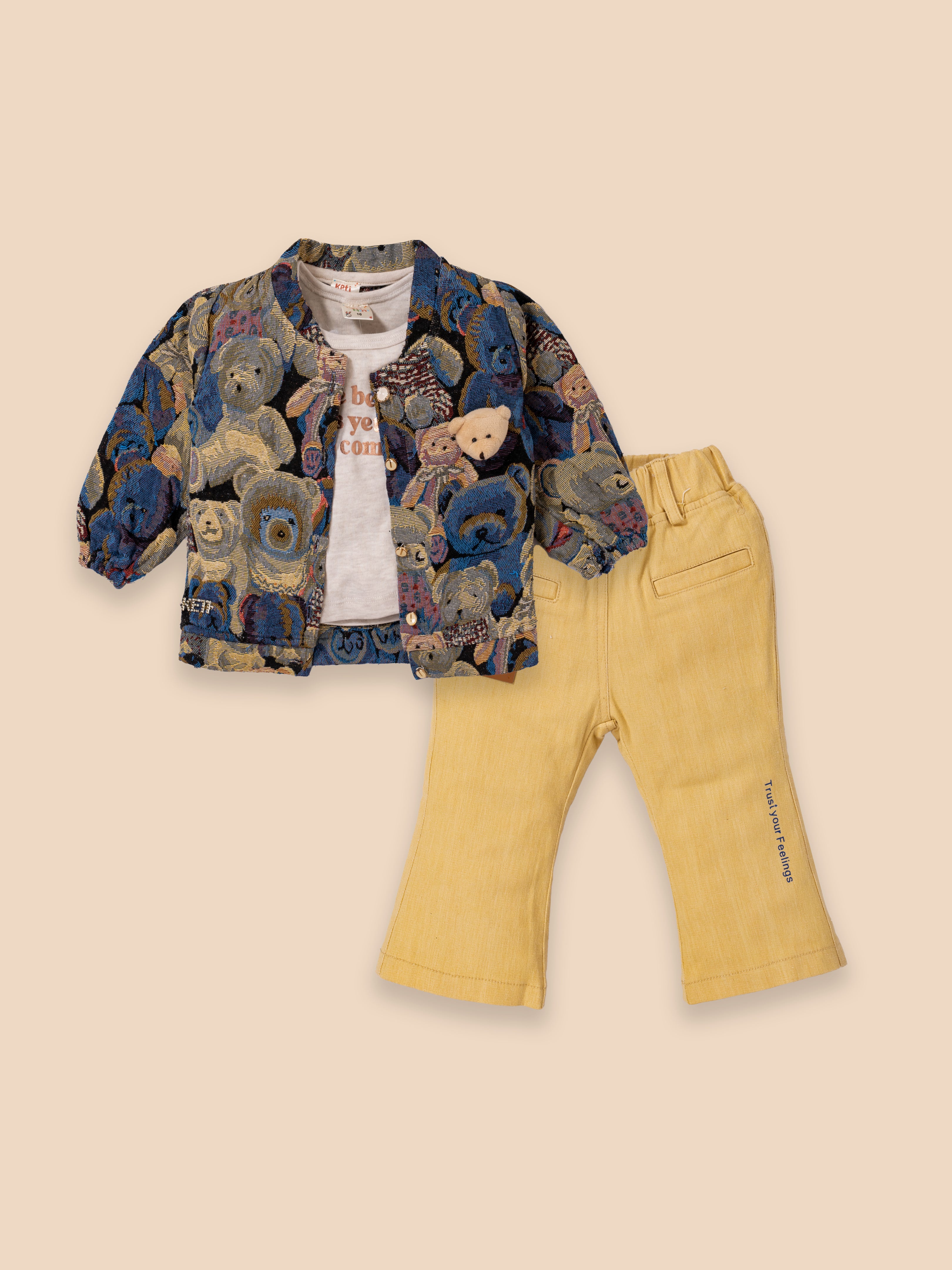 Give your little one a premium winter look with this stylish teddy-pattern jacquard jacket and matching pants set from Keti Mini. Featuring a cute mini teddy brooch, cozy fabric, and a trendy sleeveless printed inner tee, this outfit combines fashion with comfort perfectly. Ideal for outings, parties, and winter styling—making everyday dressing extra adorable.