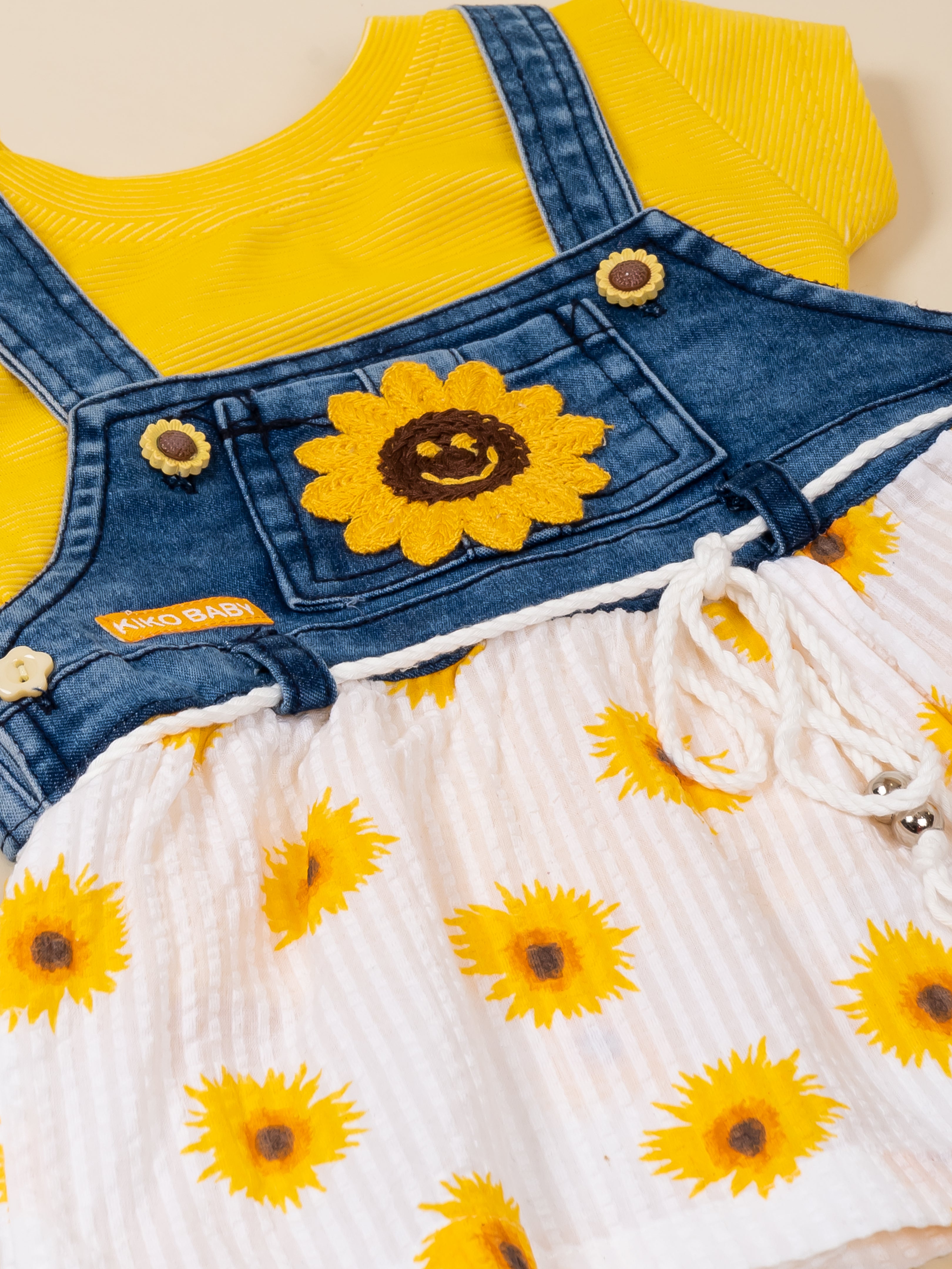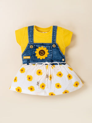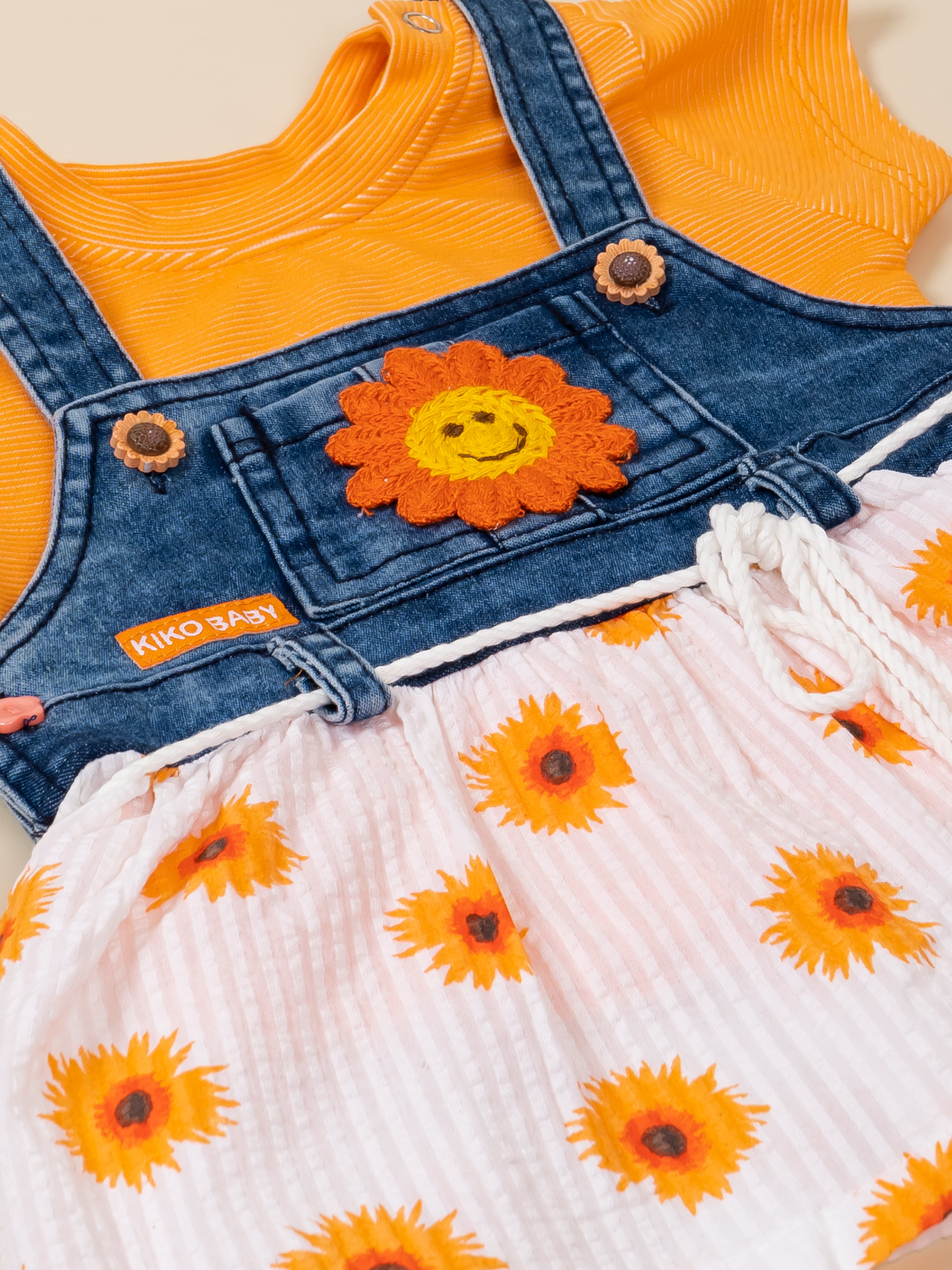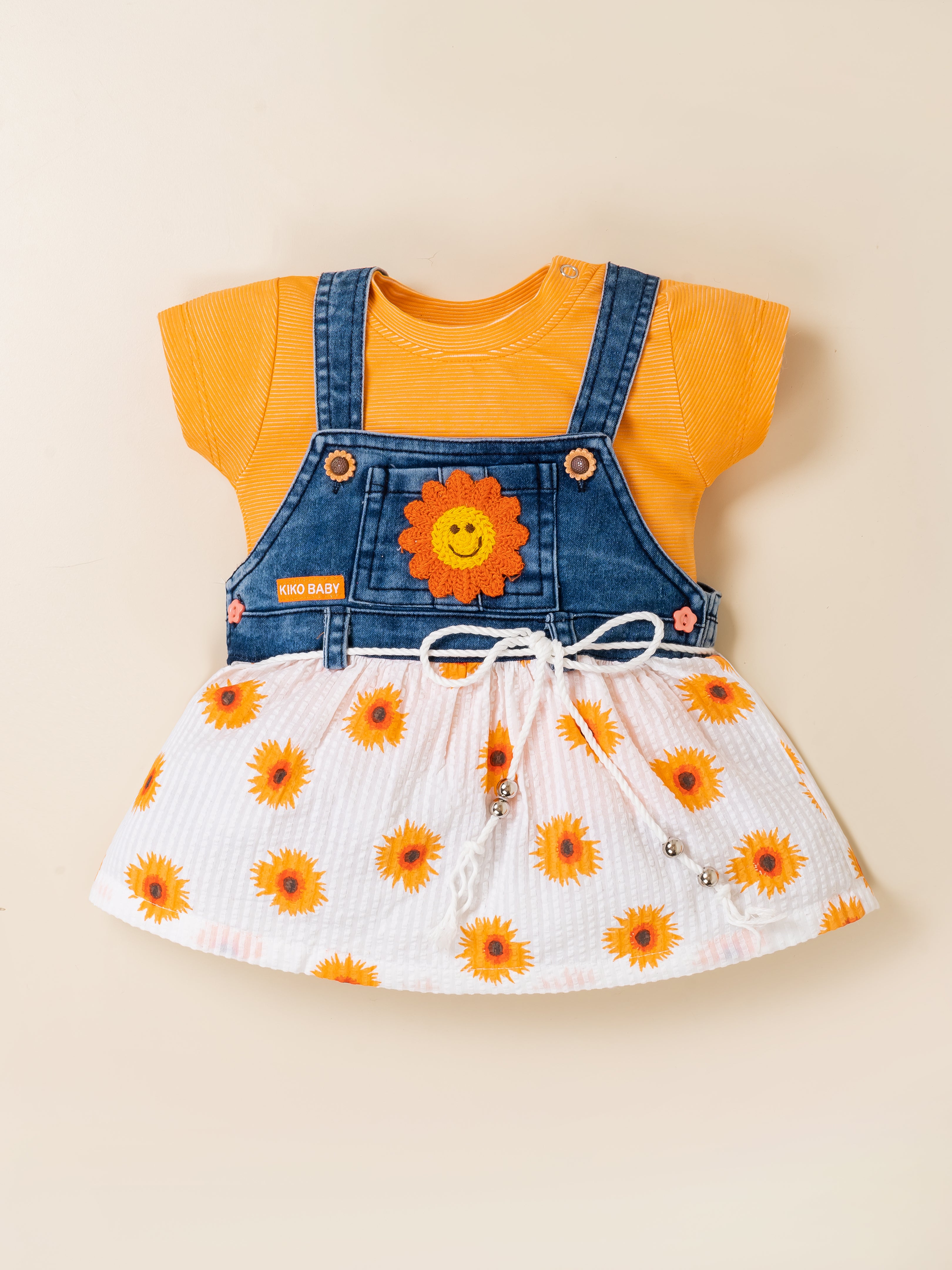 Brighten your little one’s day with the adorable KIKO Original Sunflower 2-Part Dress Set. This cheerful outfit features a soft knitted plain inner top paired with a stylish denim-look Dungaree dress designed with a sunflower applique and printed seersucker skirt. The combination of breathable knit and lightweight woven fabric ensures comfort while delivering a trendy layered look. Perfect for sunny outings, playdates, and everyday wear, this set blends charm, comfort, and durability in one sweet ensemble