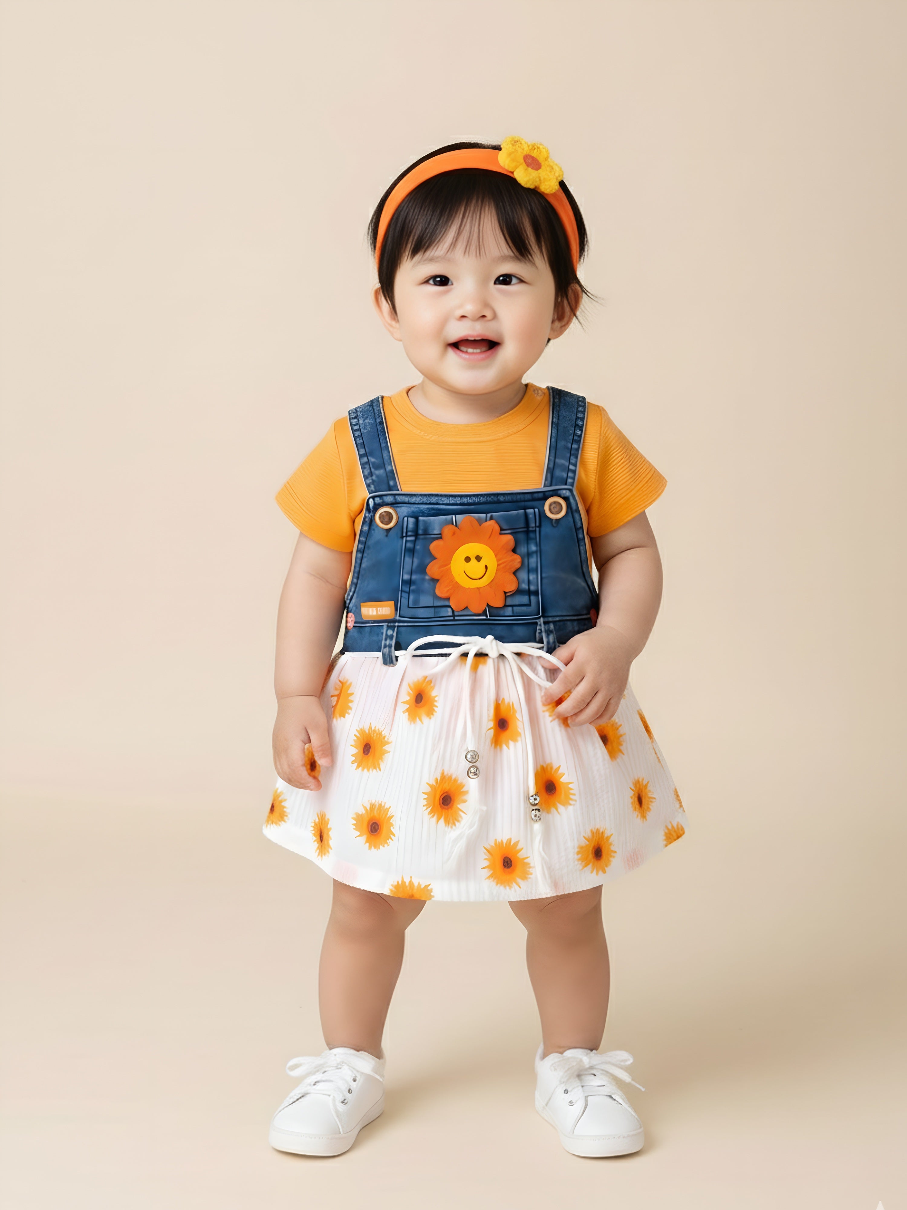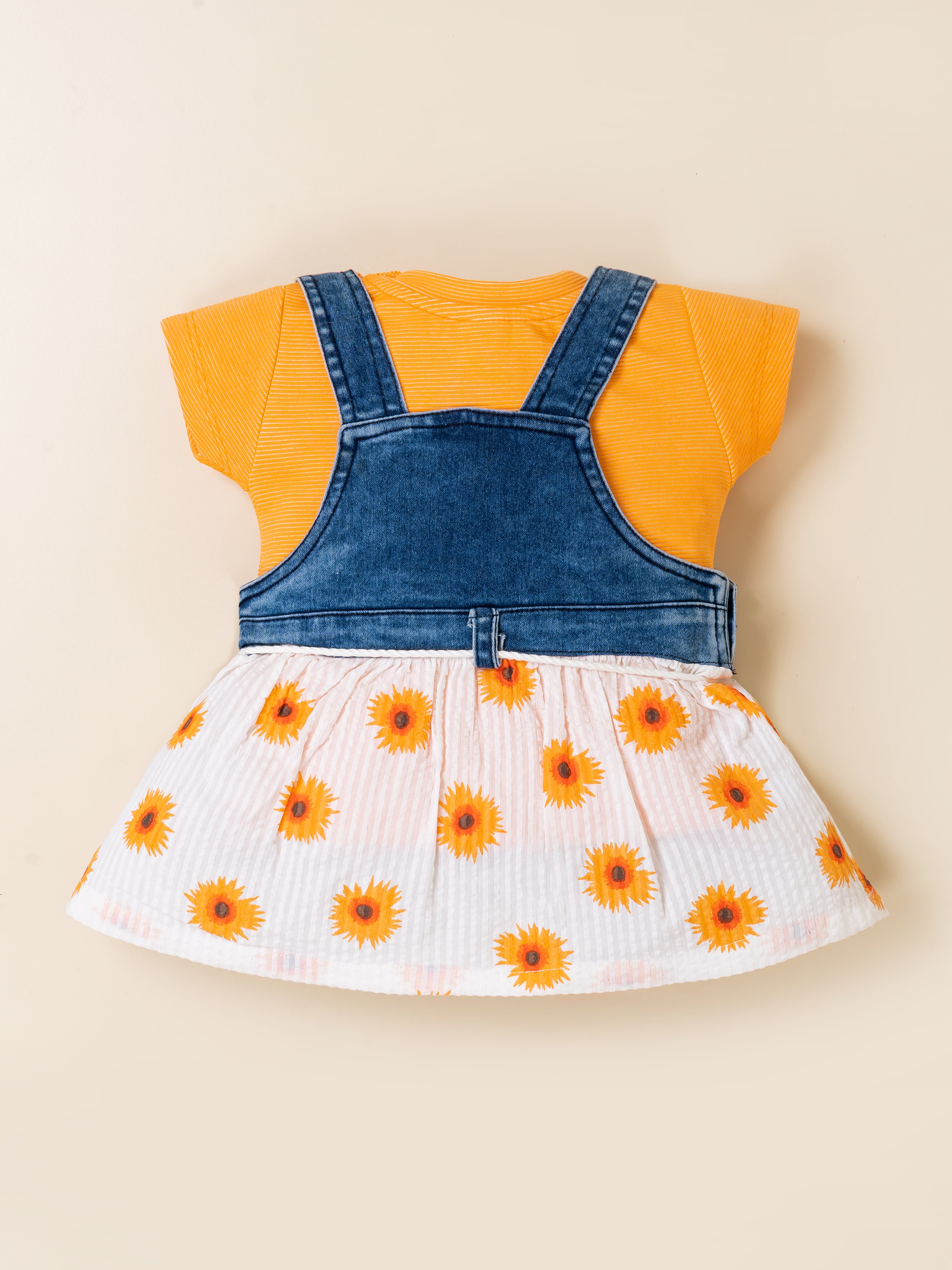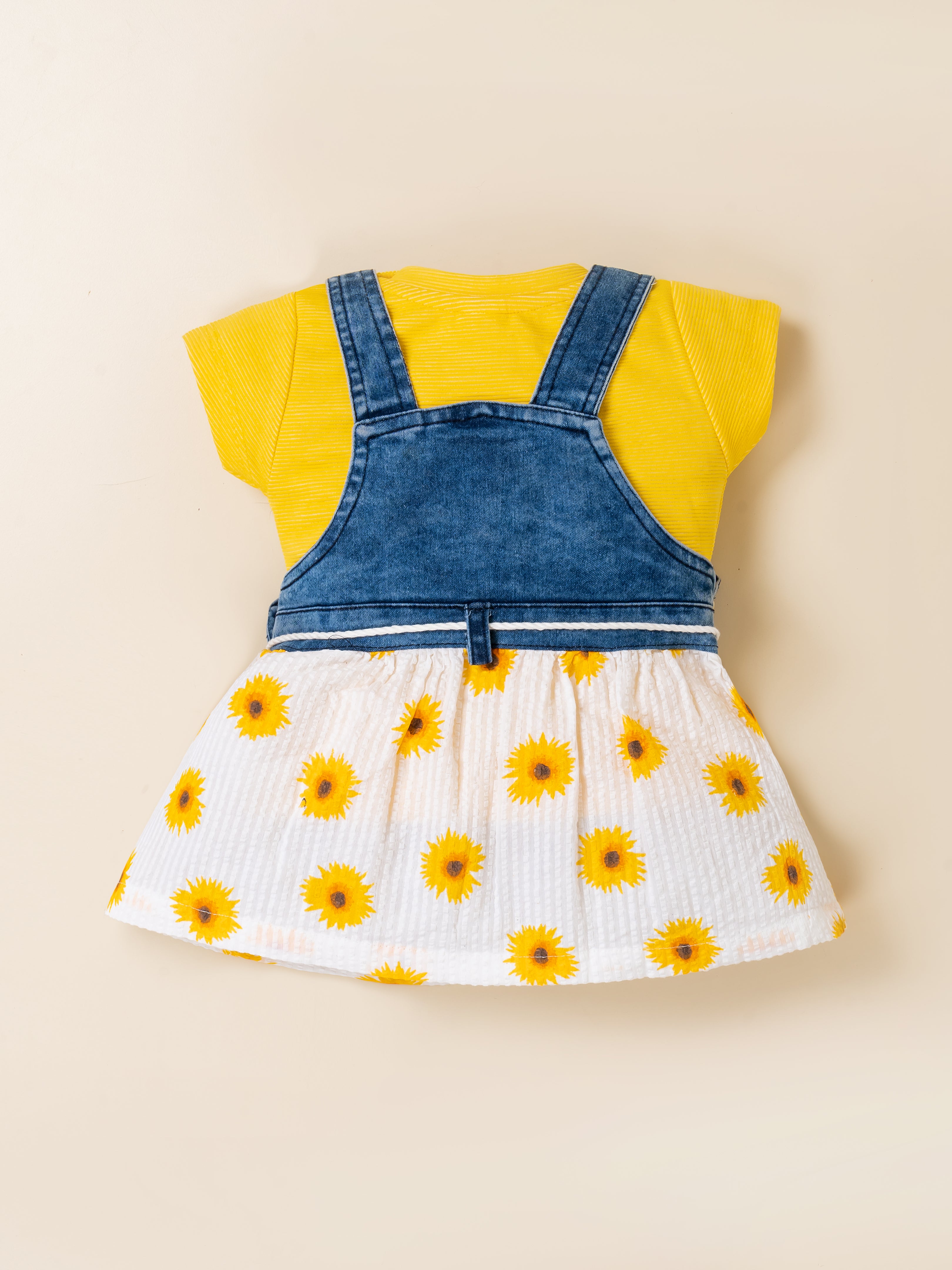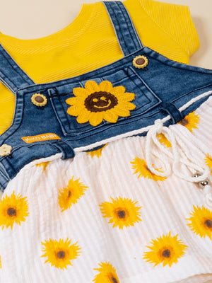 Brighten your little one’s day with the adorable KIKO Original Sunflower 2-Part Dress Set. This cheerful outfit features a soft knitted plain inner top paired with a stylish denim-look Dungaree dress designed with a sunflower applique and printed seersucker skirt. The combination of breathable knit and lightweight woven fabric ensures comfort while delivering a trendy layered look. Perfect for sunny outings, playdates, and everyday wear, this set blends charm, comfort, and durability in one sweet ensemble