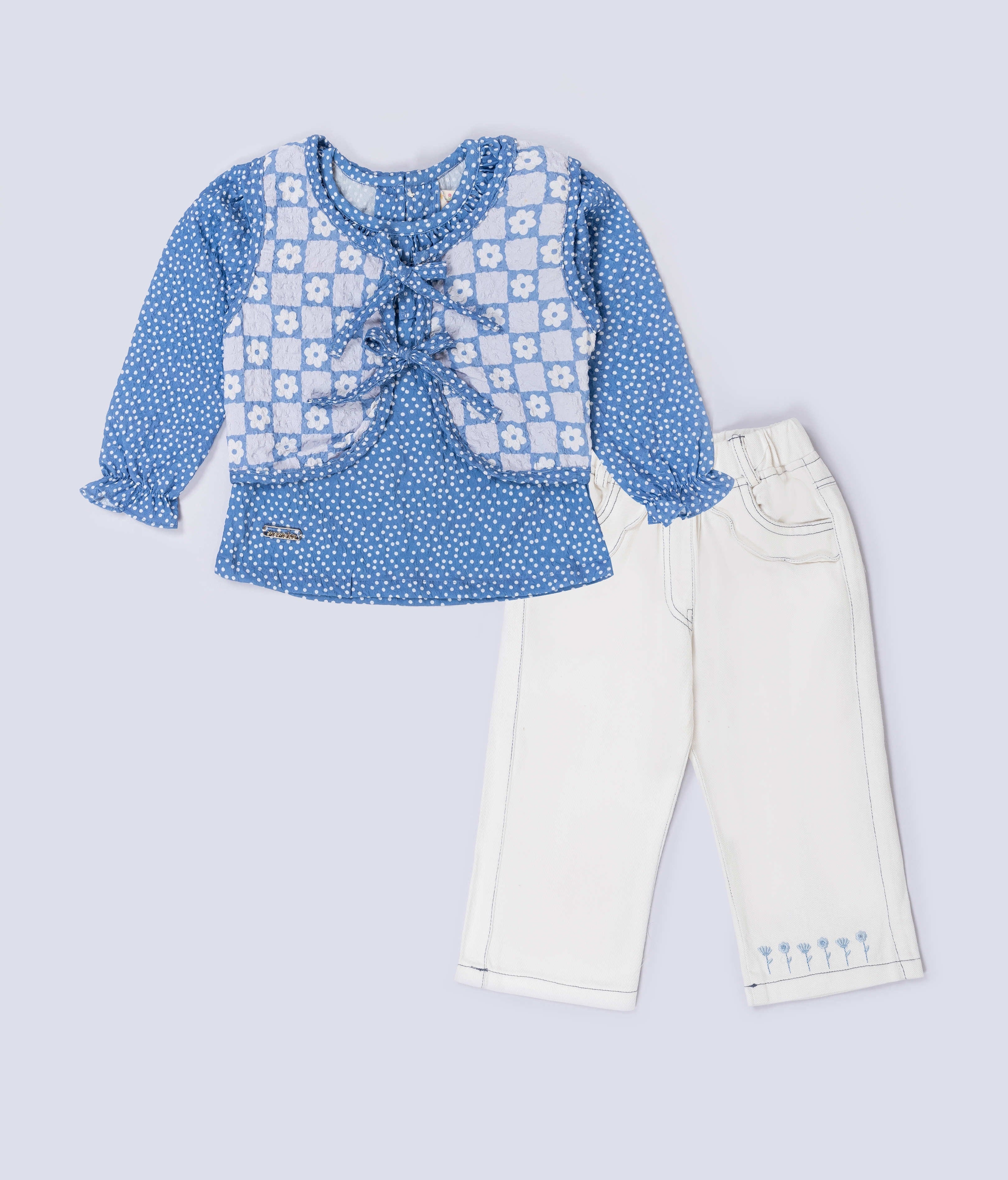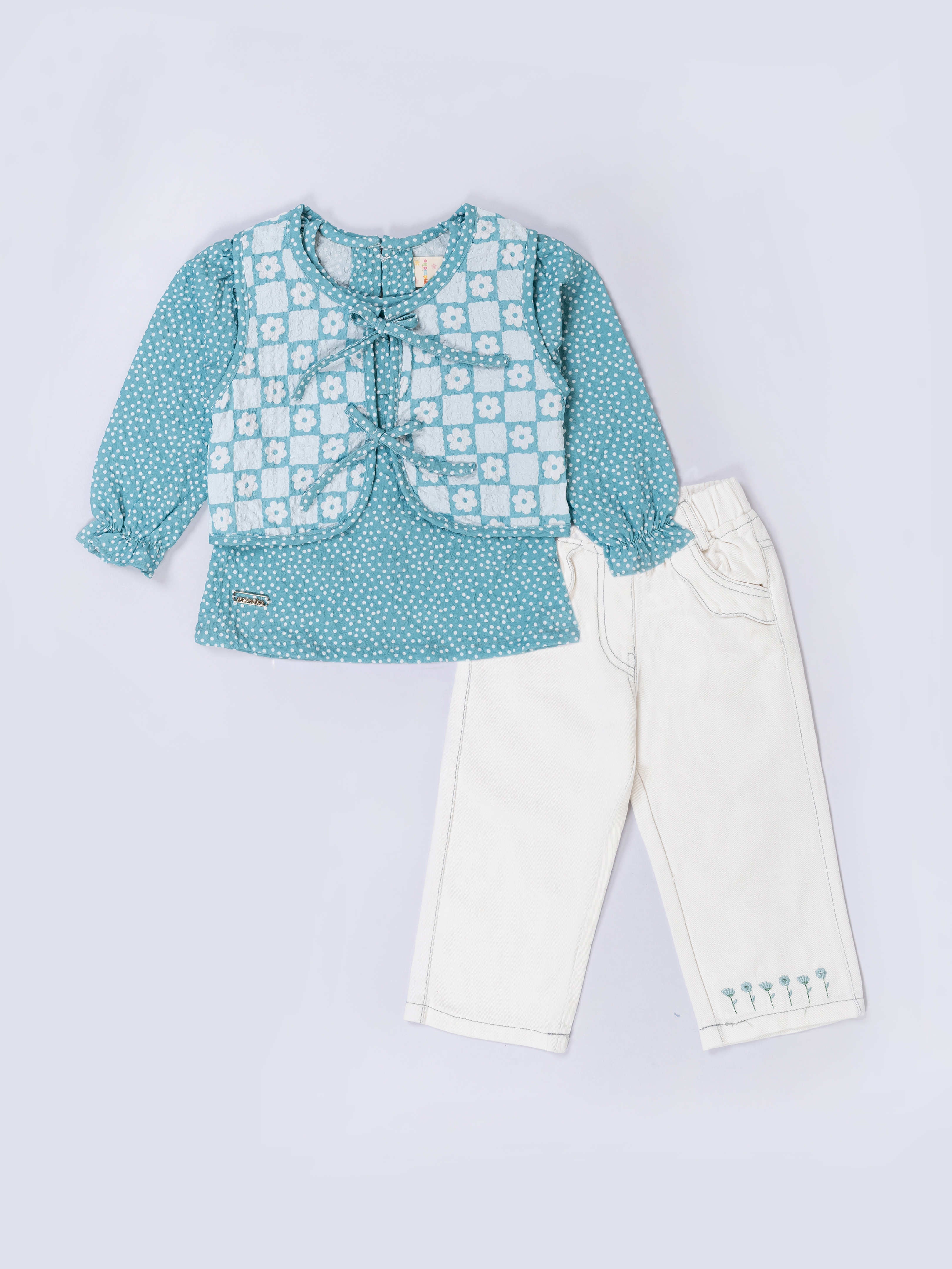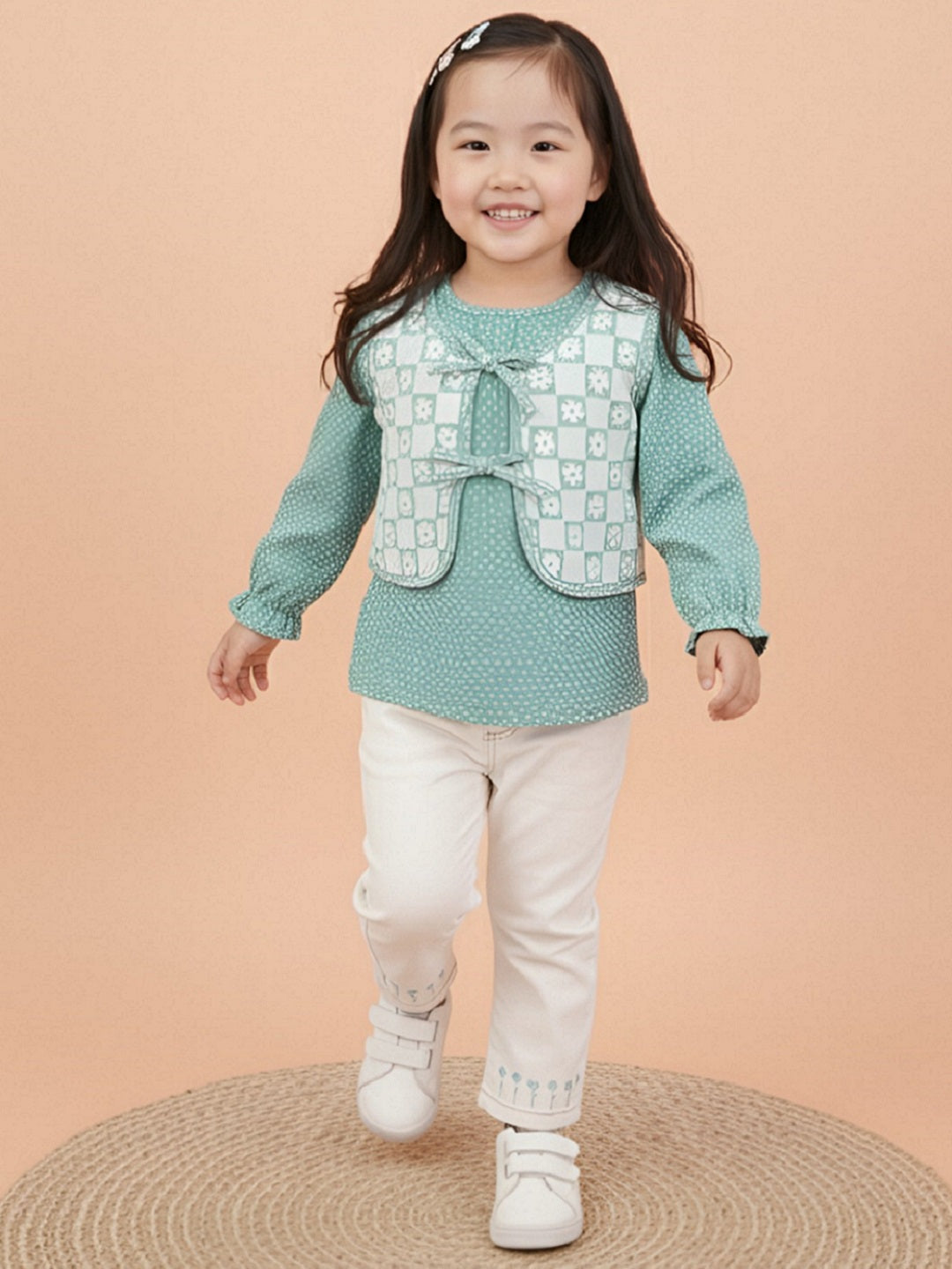 This adorable MEMEKO kids outfit set is perfect for your little girl's casual and stylish wardrobe. It features a charming two-piece top layered look with a sweet floral print shrug (or vest) that ties in the front, worn over a coordinating long-sleeve top with a small print (polka dot or similar texture). The set comes with comfortable, versatile white denim jeans that have cute embroidered or printed details near the hem. Available in two fashionable color combinations: vibrant blue and fresh teal/mint green. This outfit is ideal for everyday wear, playdates, or casual outings, offering both comfort and a cute, coordinated style.