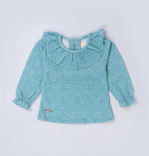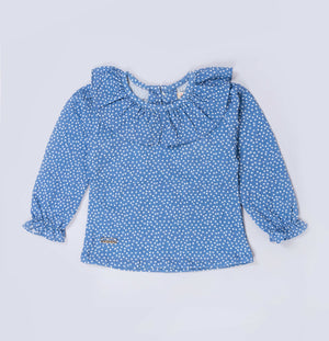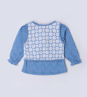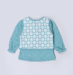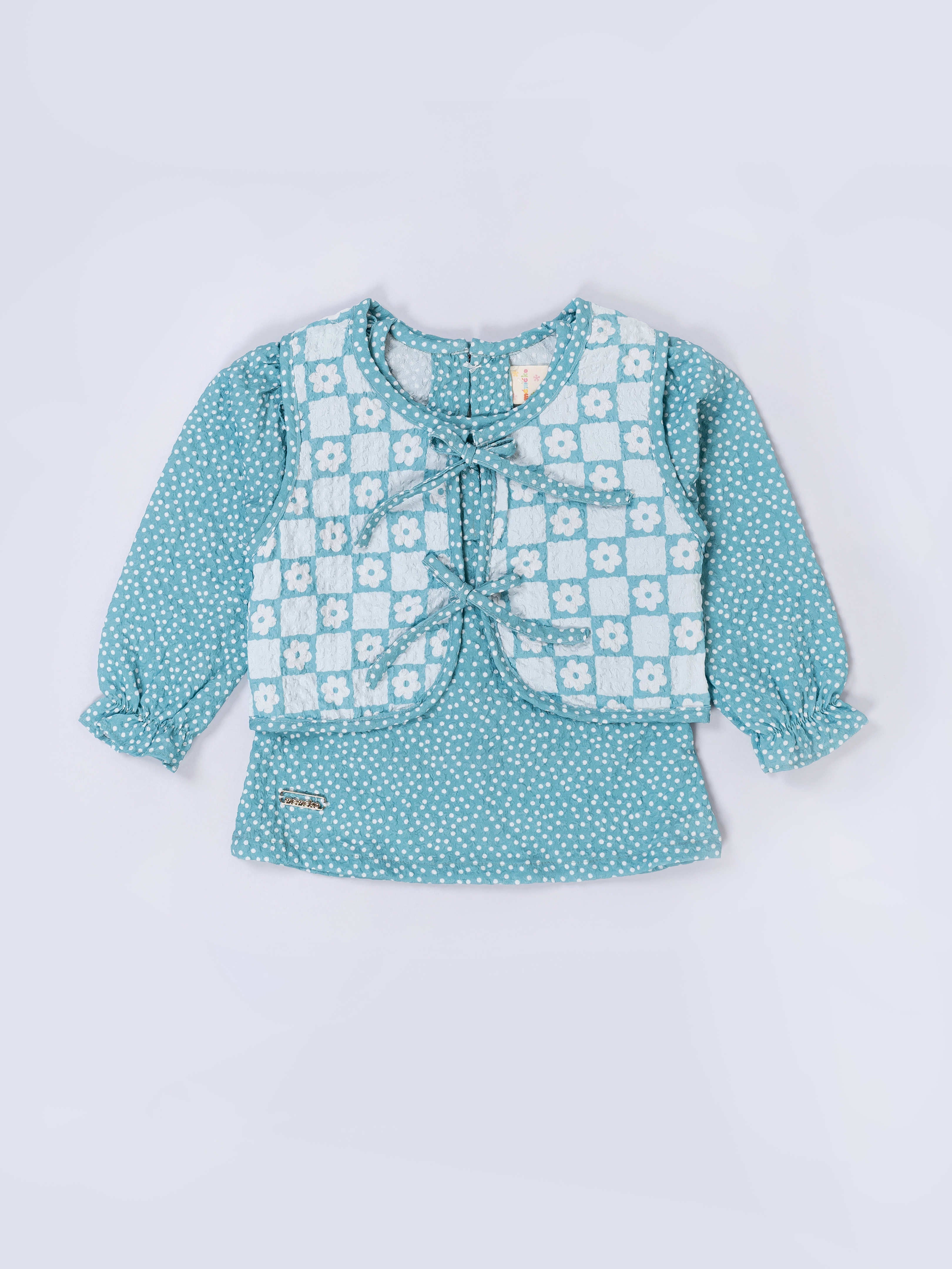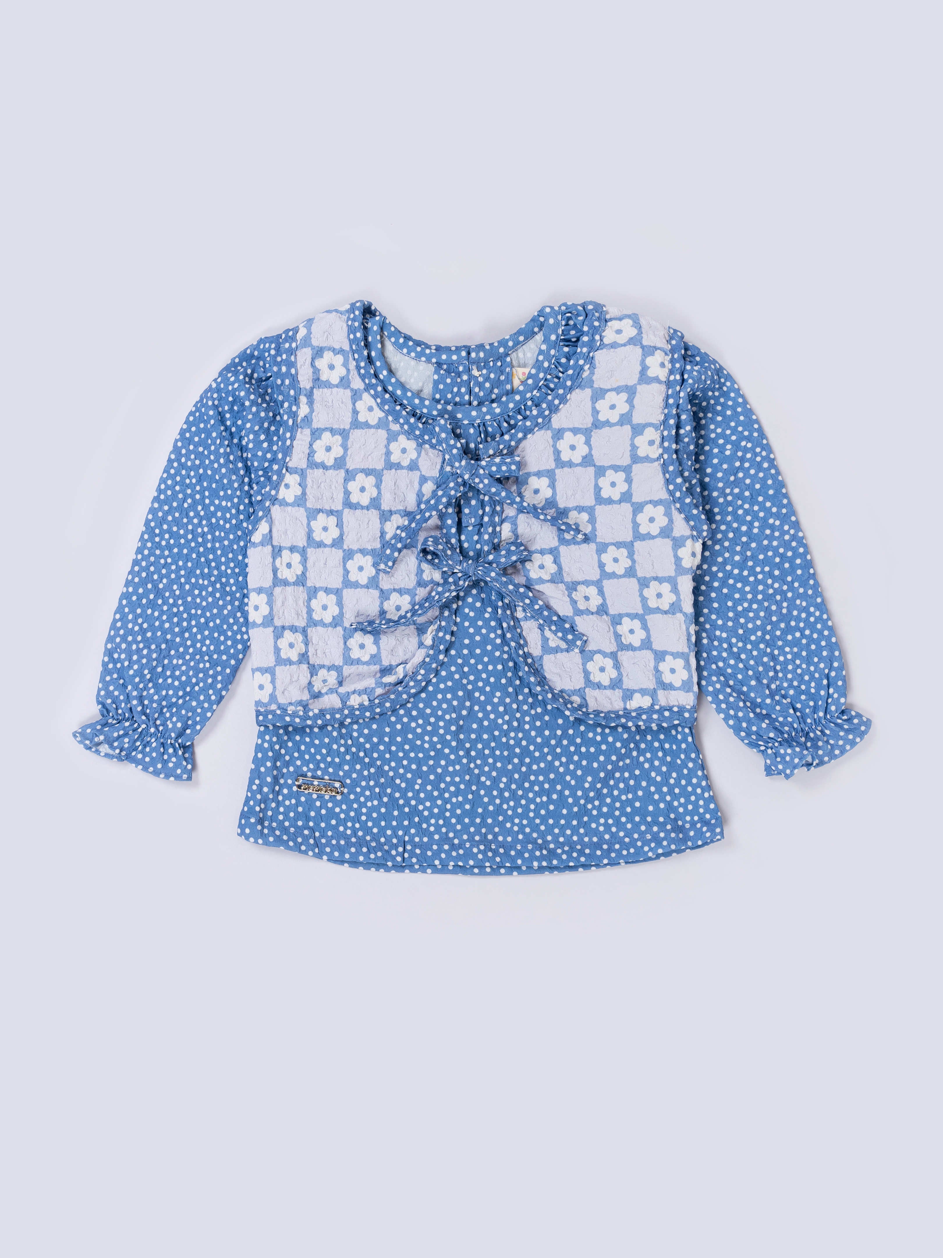 This adorable MEMEKO kids outfit set is perfect for your little girl's casual and stylish wardrobe. It features a charming two-piece top layered look with a sweet floral print shrug (or vest) that ties in the front, worn over a coordinating long-sleeve top with a small print (polka dot or similar texture). The set comes with comfortable, versatile white denim jeans that have cute embroidered or printed details near the hem. Available in two fashionable color combinations: vibrant blue and fresh teal/mint green. This outfit is ideal for everyday wear, playdates, or casual outings, offering both comfort and a cute, coordinated style.