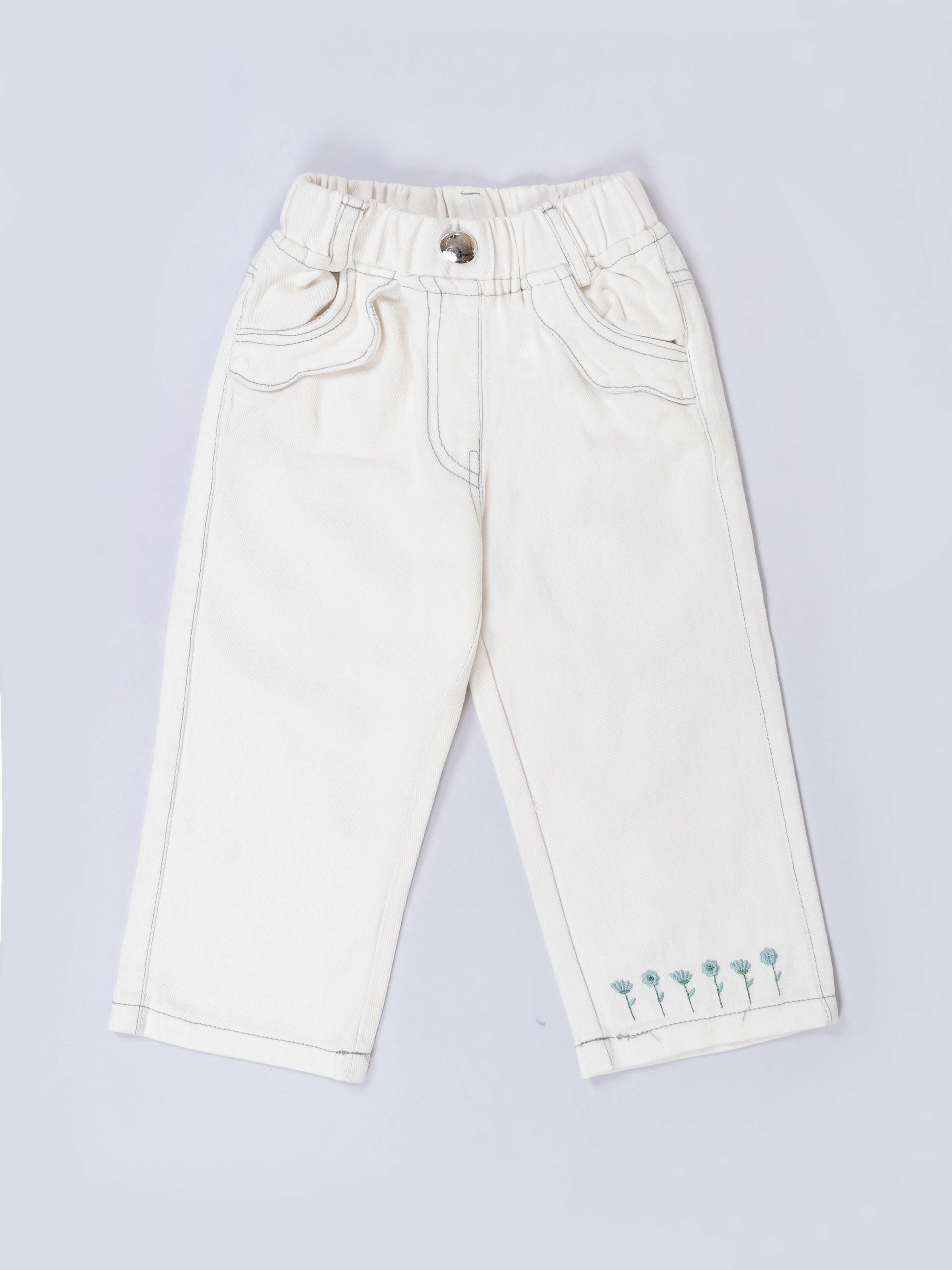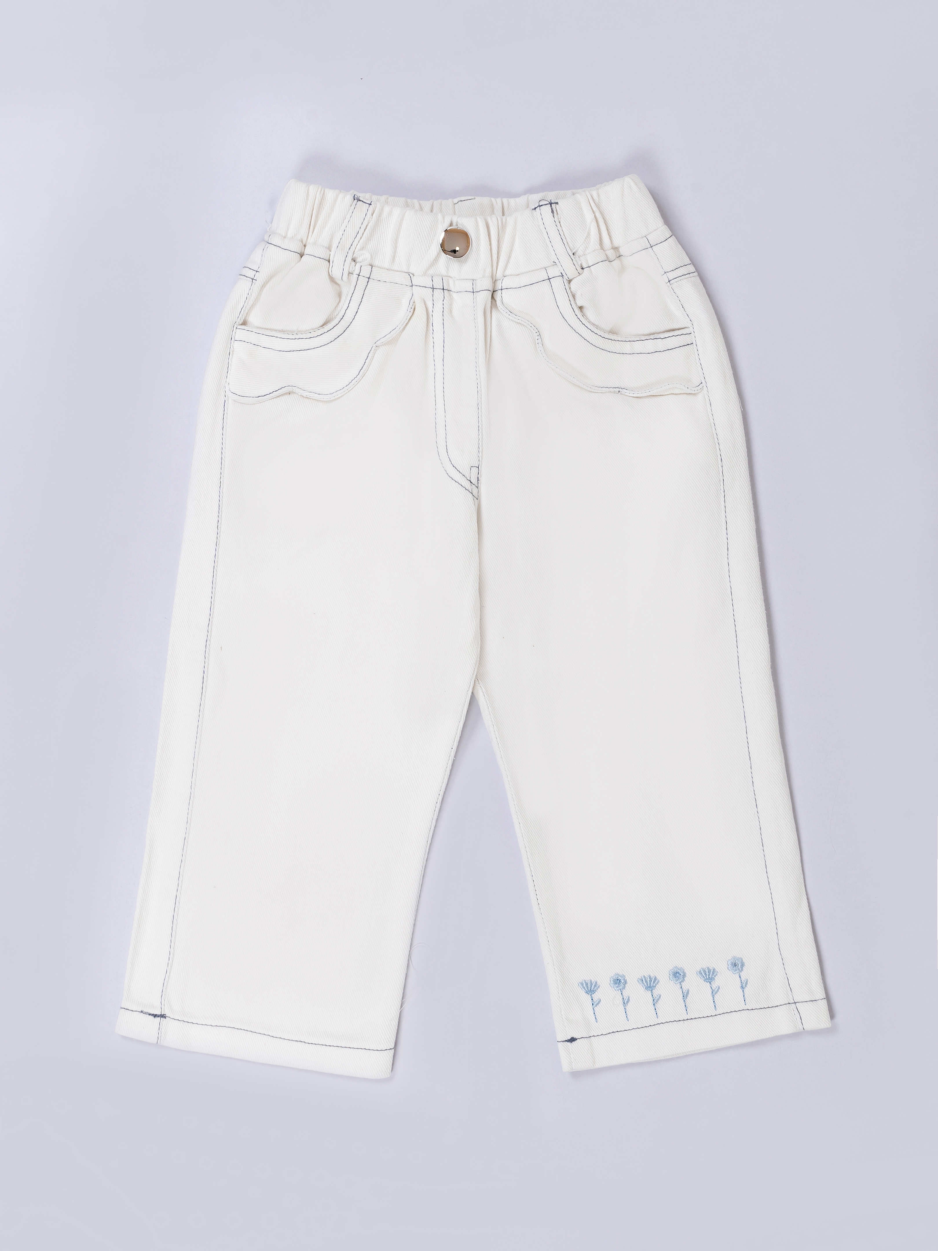 - Comfortable Denim: Paired with soft, non-restrictive white denim jeans with a comfortable elastic waistband.