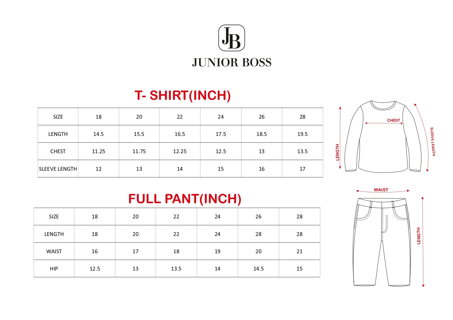 Junior Boss Our stylish and comfortable Cotton Winter Sweatshirt & Full Pant Set for Boys, designed to keep your little one looking dapper and feeling at ease during all their adventures. This sets are perfect for warm weather and playtime activities. The fabric is gentle on the skin. With short sleeves and a relaxed fit, the shirt ensures excellent ventilation. The elastic waistband ensures a secure and comfortable fit, allowing for easy movement and play. This kids clothing set for boys is available in different colors.