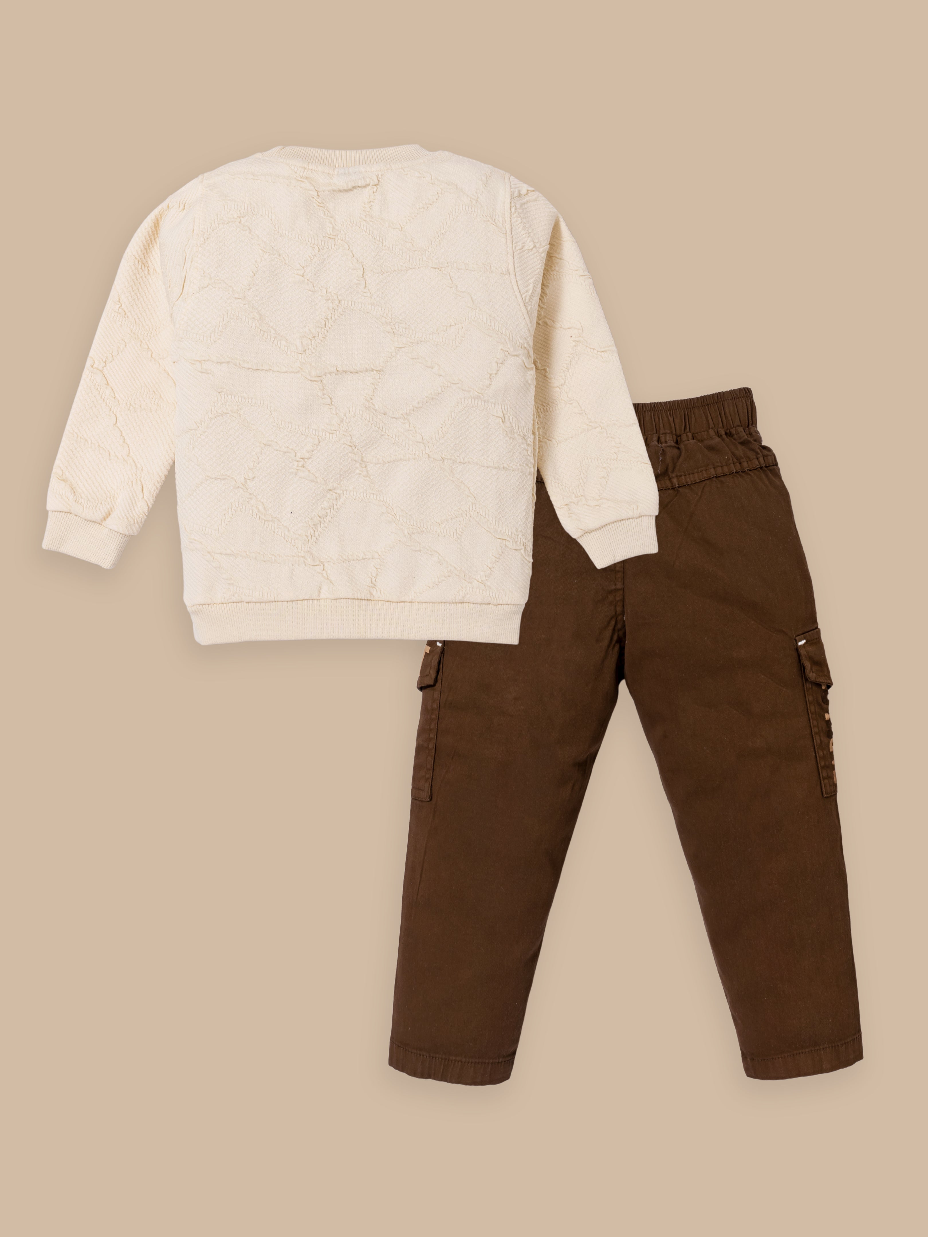 Junior Boss Our stylish and comfortable Cotton Winter Sweatshirt & Full Pant Set for Boys, designed to keep your little one looking dapper and feeling at ease during all their adventures. This sets are perfect for warm weather and playtime activities. The fabric is gentle on the skin. With short sleeves and a relaxed fit, the shirt ensures excellent ventilation. The elastic waistband ensures a secure and comfortable fit, allowing for easy movement and play. This kids clothing set for boys is available in different colors.