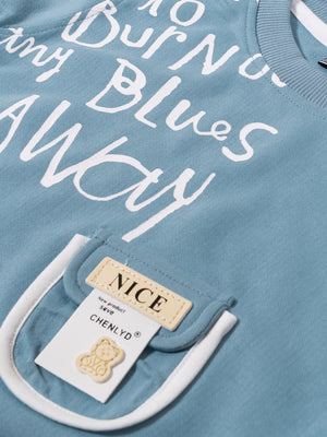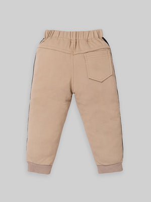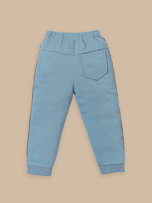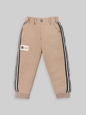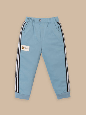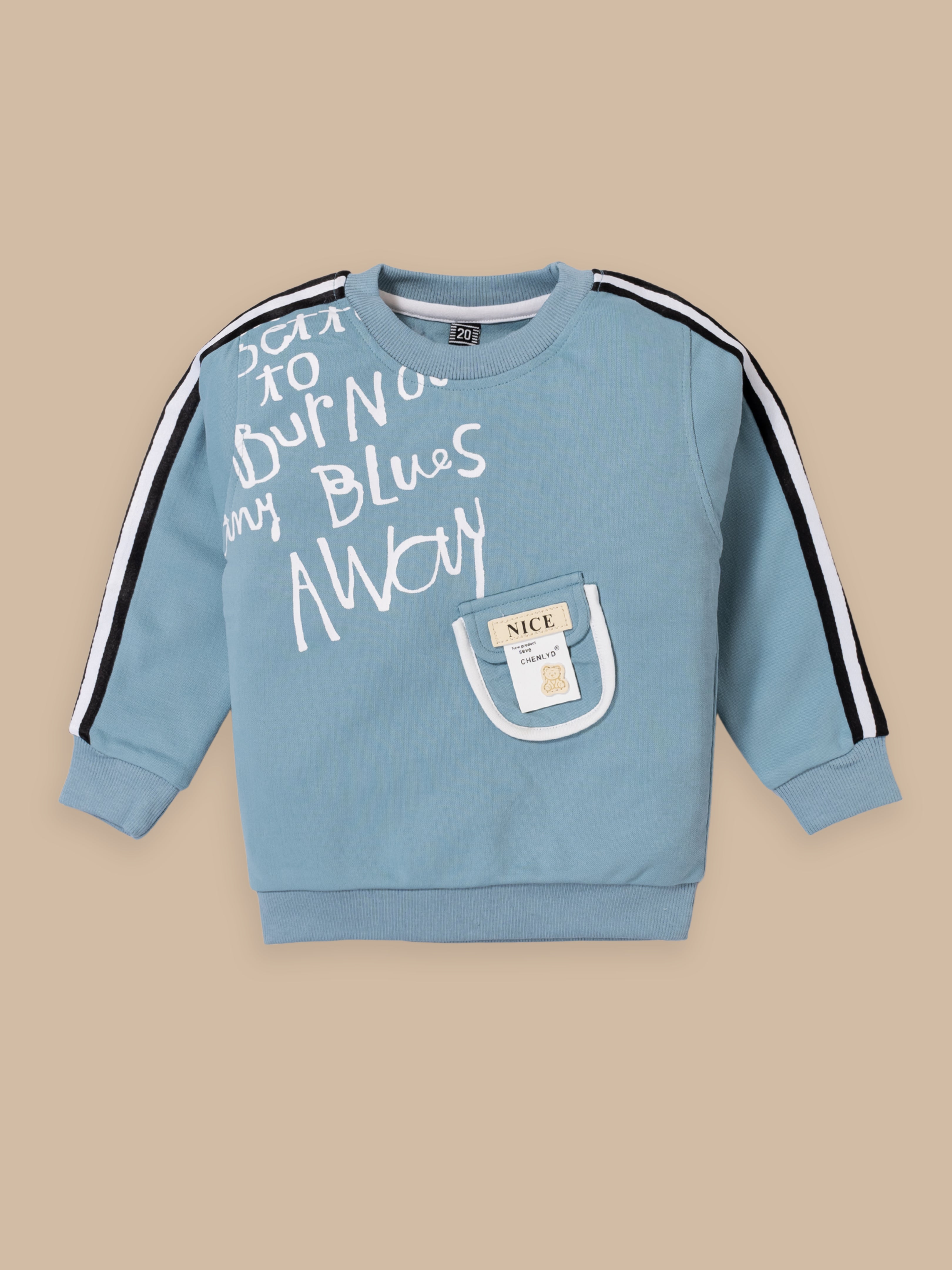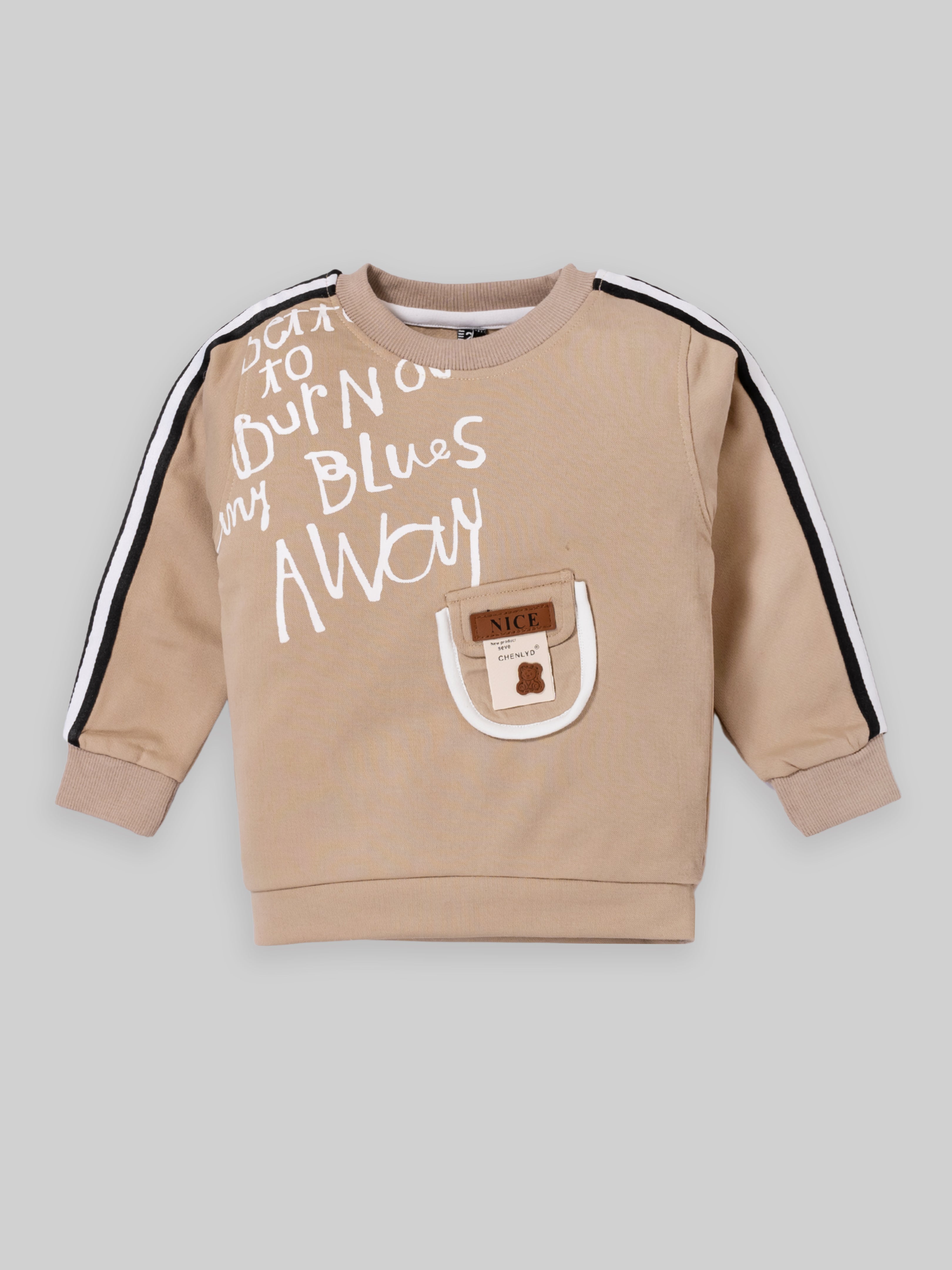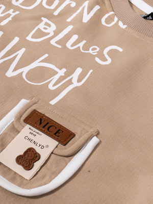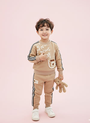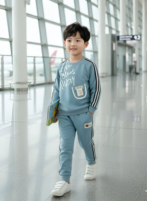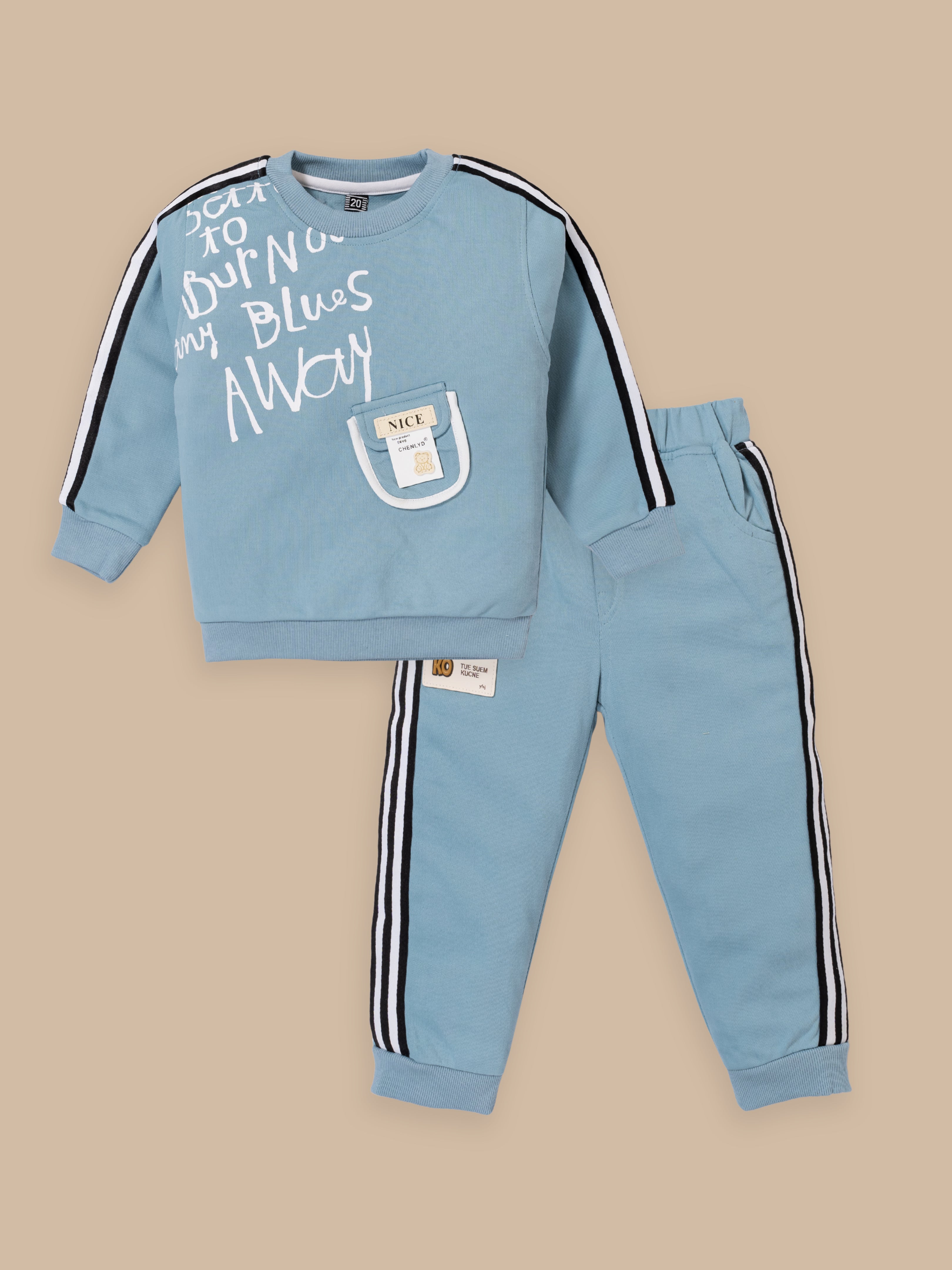 Trendy Kids Tracksuit Set – Printed Sweatshirt with Pocket & Striped Joggers | Beige & Blue
